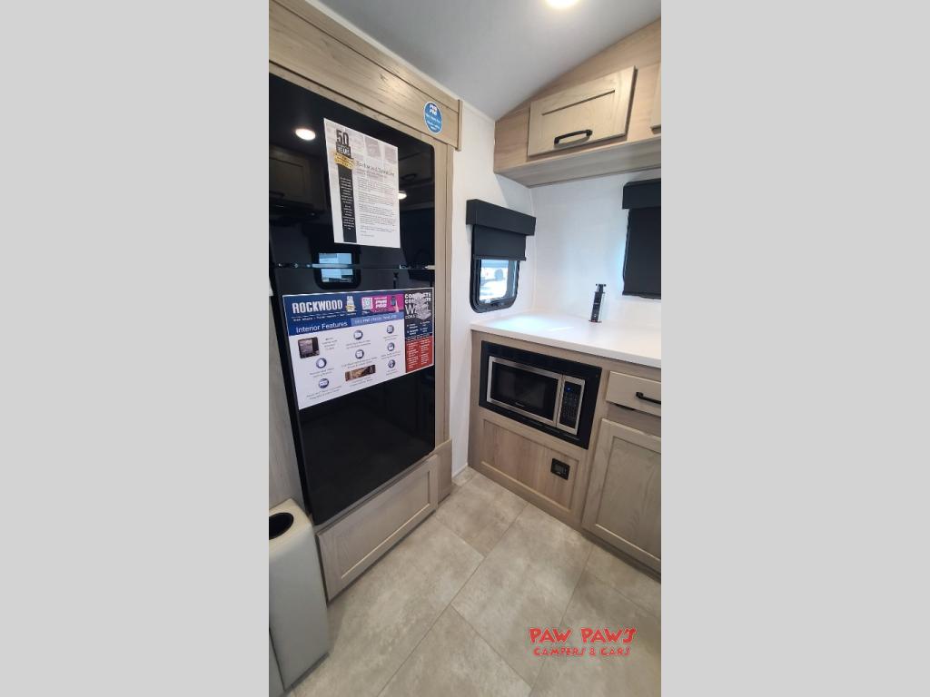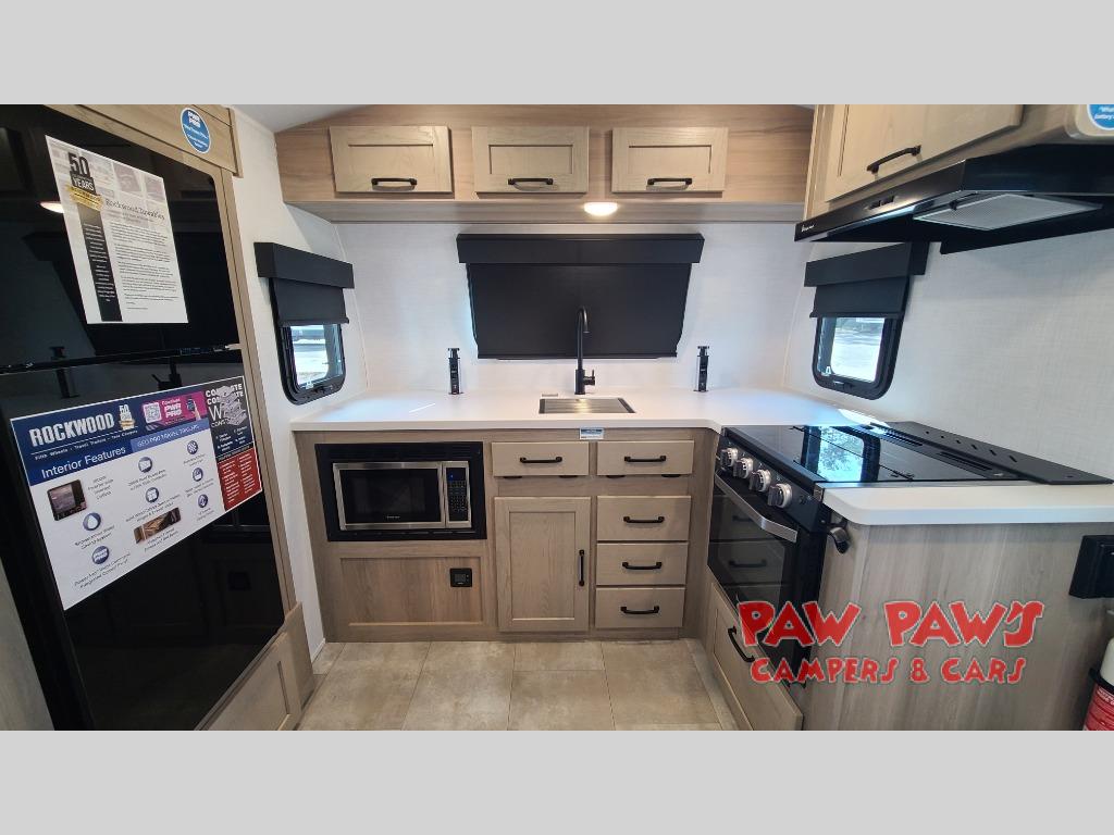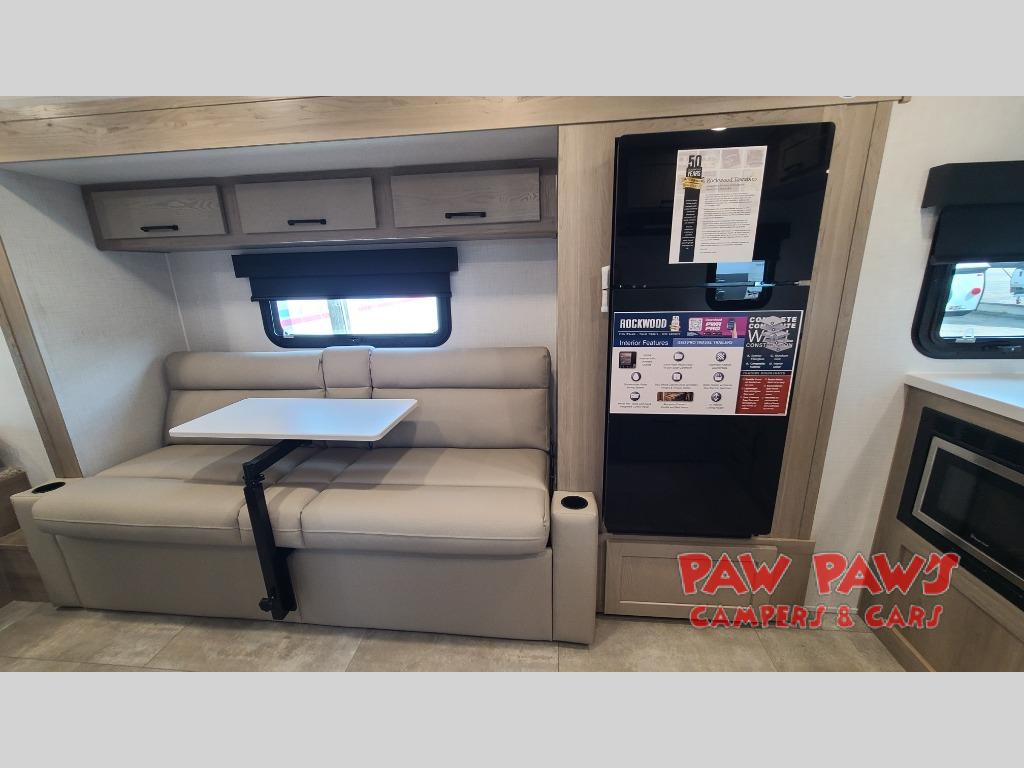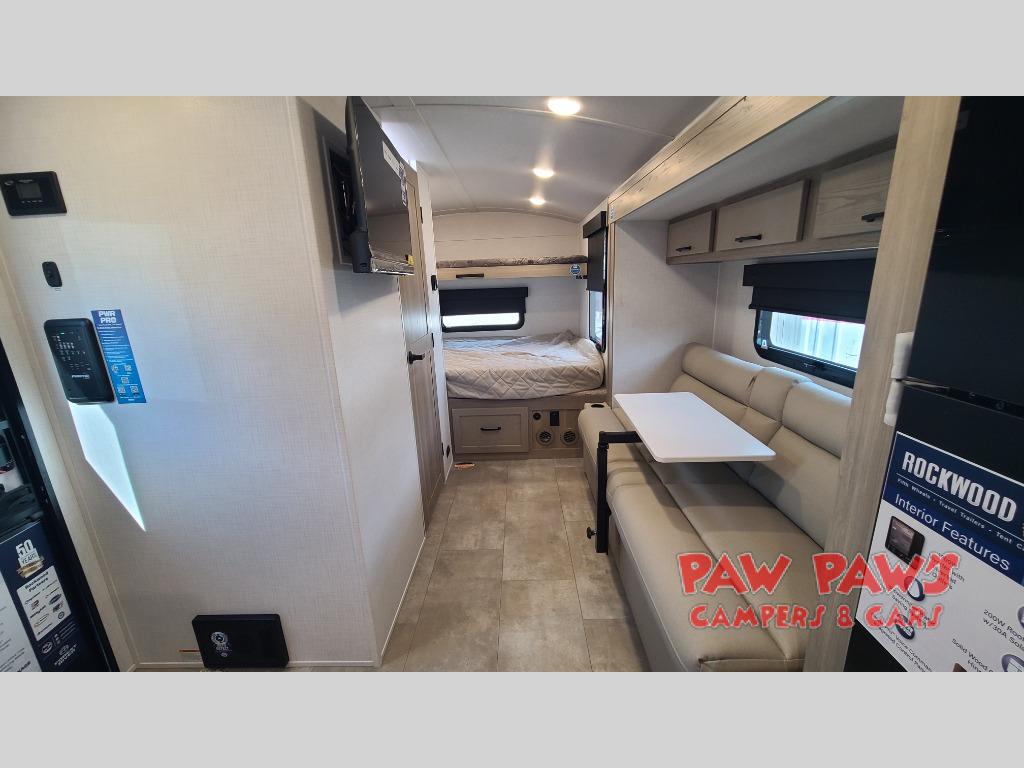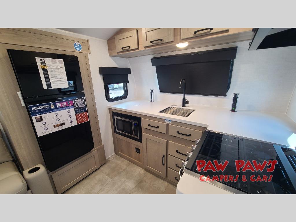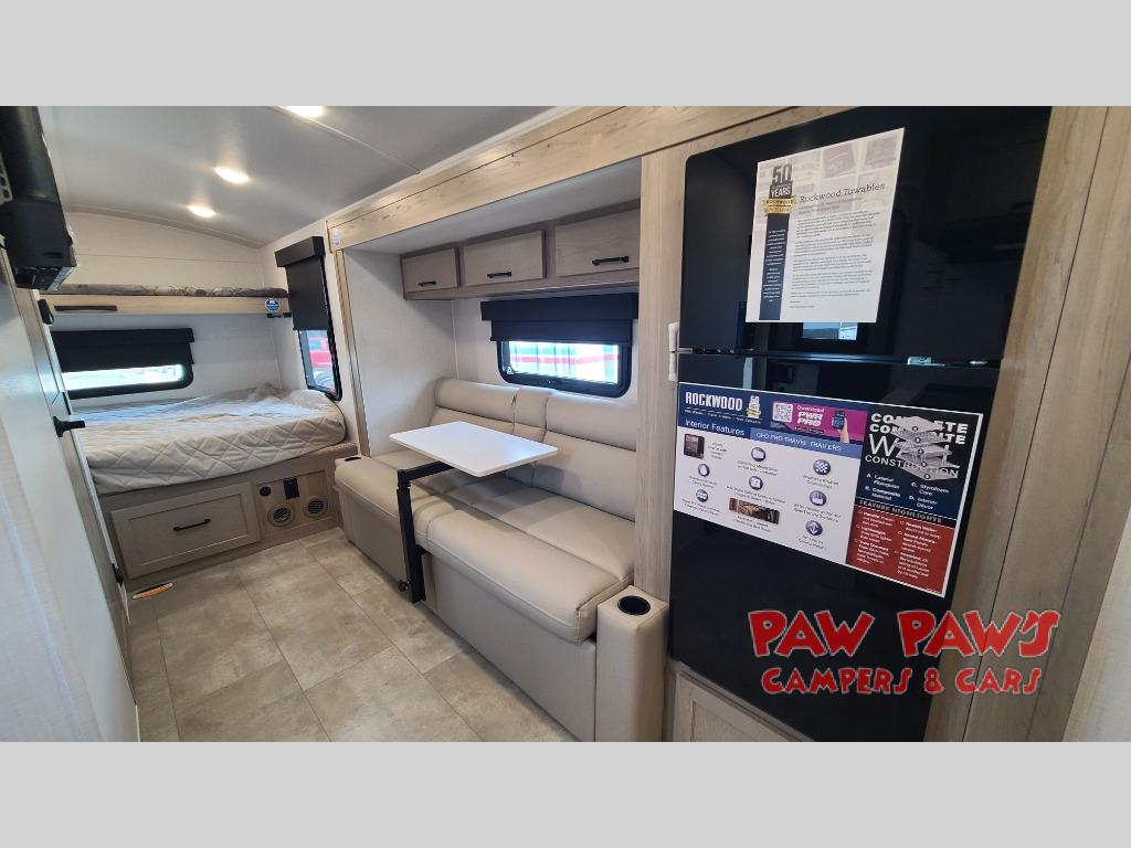 With any Rockwood GEO Pro travel trailer by Forest River you will enjoy easy towing, durable construction, and off-road capabilities with larger 15" tires and a lift kit! Each model is constructed with complete composite wall construction for added strength and durability, and the torsion axle, Rubber-Ryde suspension will make towing easier than ever. Inside, you'll find sleek roller shades for added privacy, a 12V refrigerator and a microwave, plus a 20,000 BTU furnace to keep you warm during the colder camping months.