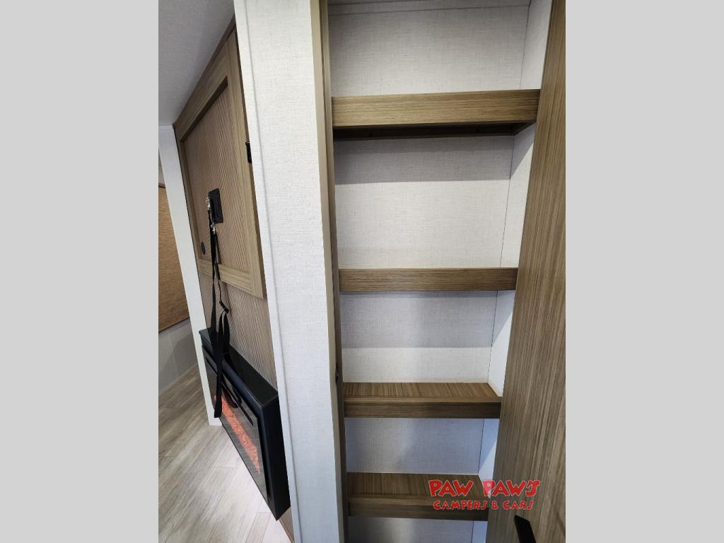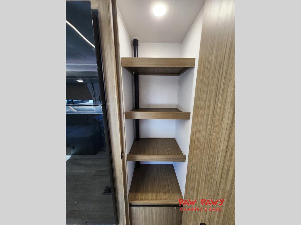 Sleeping for up to six with a custom king bed with Versa-Tilt in the private front bedroom, and a versa-lounge within the large slide out. There is also a Versa Flex table here where you can dine and work while at the campground. Cooking will be easy either indoors our out with an exterior camp kitchen situated under the 20' awning. Inside, two pantries and an oversized refrigerator will hold all of your food, both dry and canned goods plus perishables will be kept fresh. A nice sized walk-in shower in the back of this unit, plus linen cabinet and extra wardrobe will keep everyone feeling clean and refreshed. On the outside of this unit, you will find more storage in the front pass-through compartment which is great for outdoor games and gear.