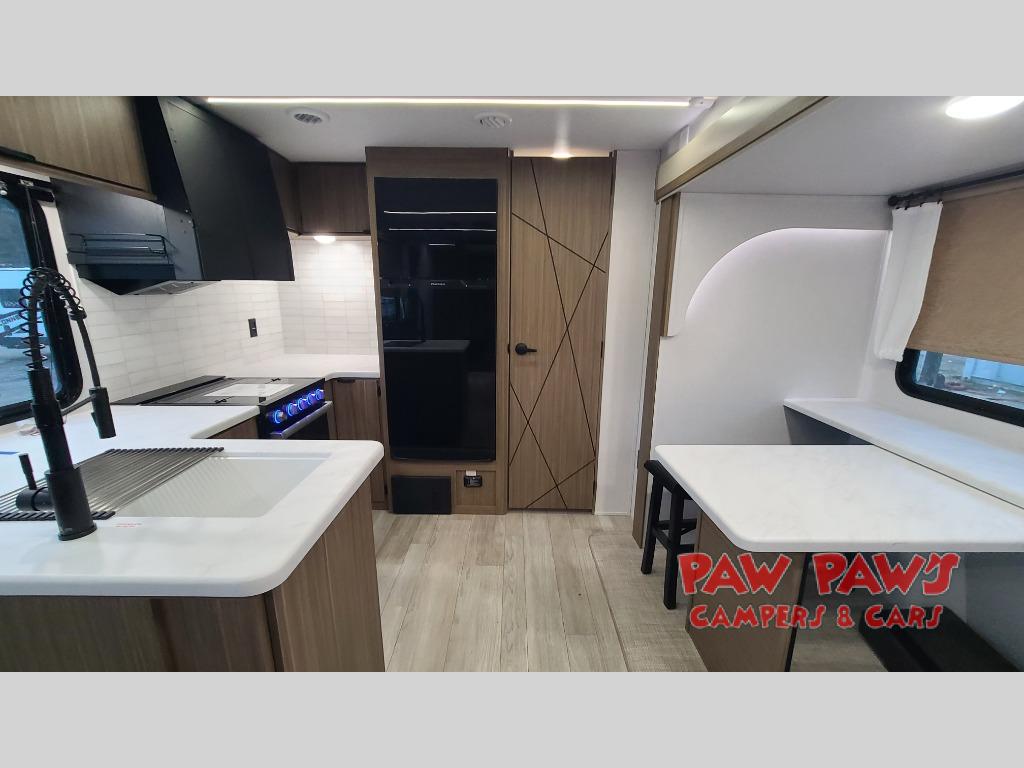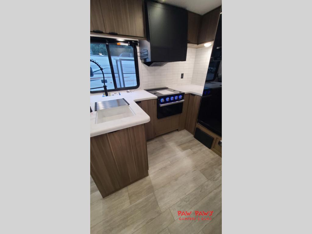 You will enjoy the rear kitchen that includes an oversized refrigerator and a three-burner cooktop.