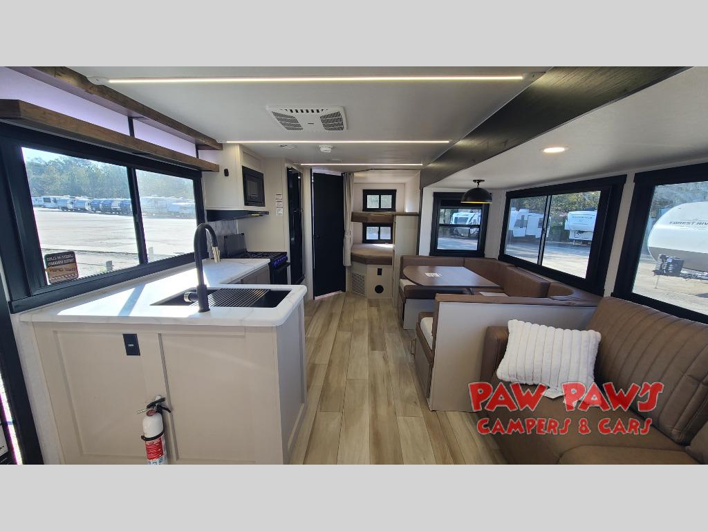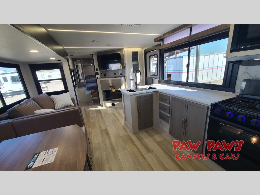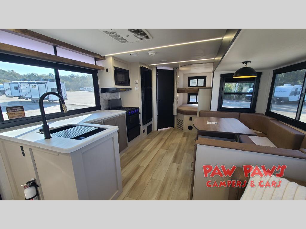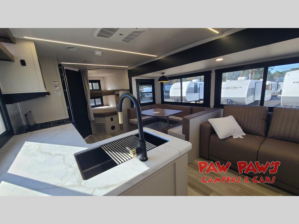 This dual entry travel trailer is the perfect unit to travel with a larger group since there is sleeping for ten! There are double-size bunks in the rear corner, a queen bed with Versa Tilt in the front private bedroom, plus a U-shaped dinette and tri-fold sofa in the main living area. The rear corner bath includes a walk-in shower with a skylight, a spacious linen closet, and one of the dual entry doors for added convenience. The chef of your group will love the camp kitchen window with shelves above for spices, and there is an exterior griddle and mount if they enjoy cooking outdoors. This unit also includes an entertainment center with a 40" LED Smart TV and a fireplace for a cozy evening indoors, and the entry pantry will be perfect to keep snacks stocked!