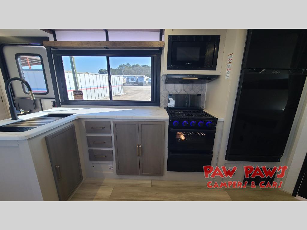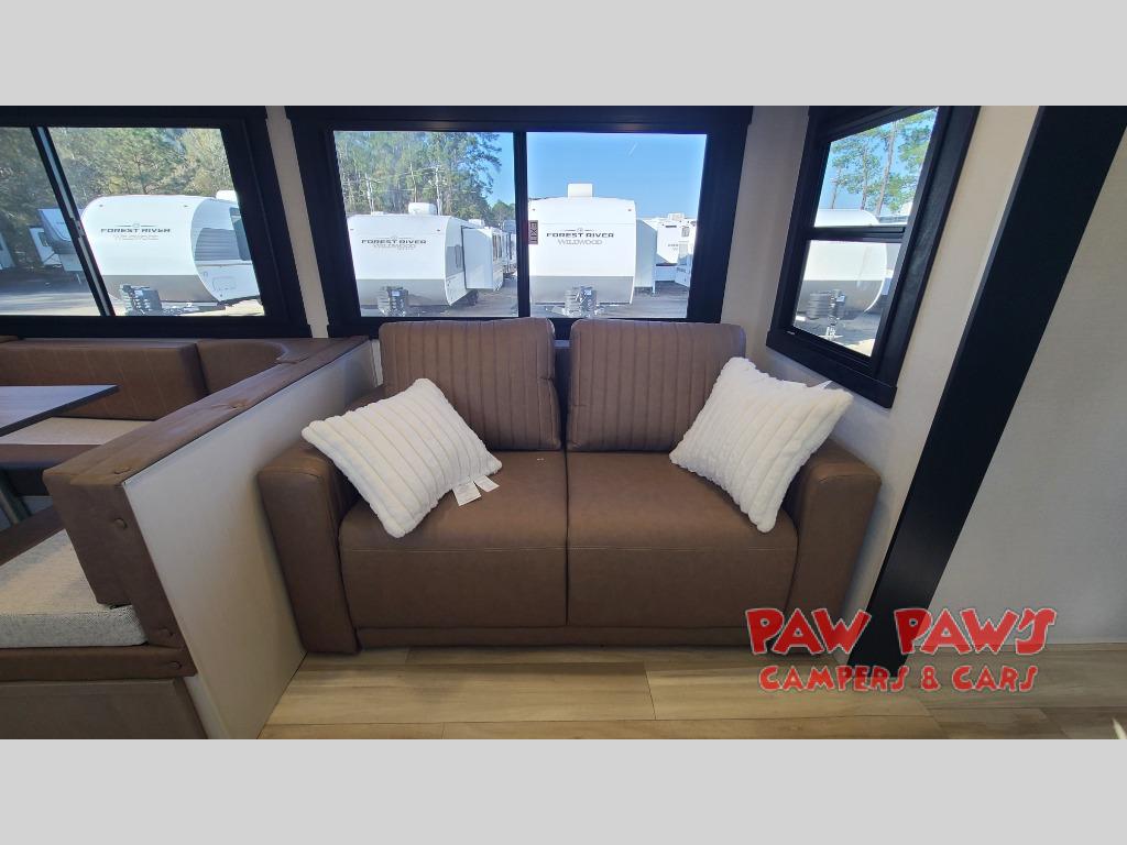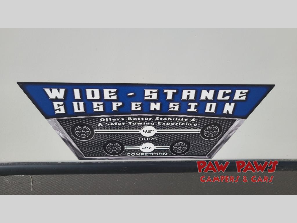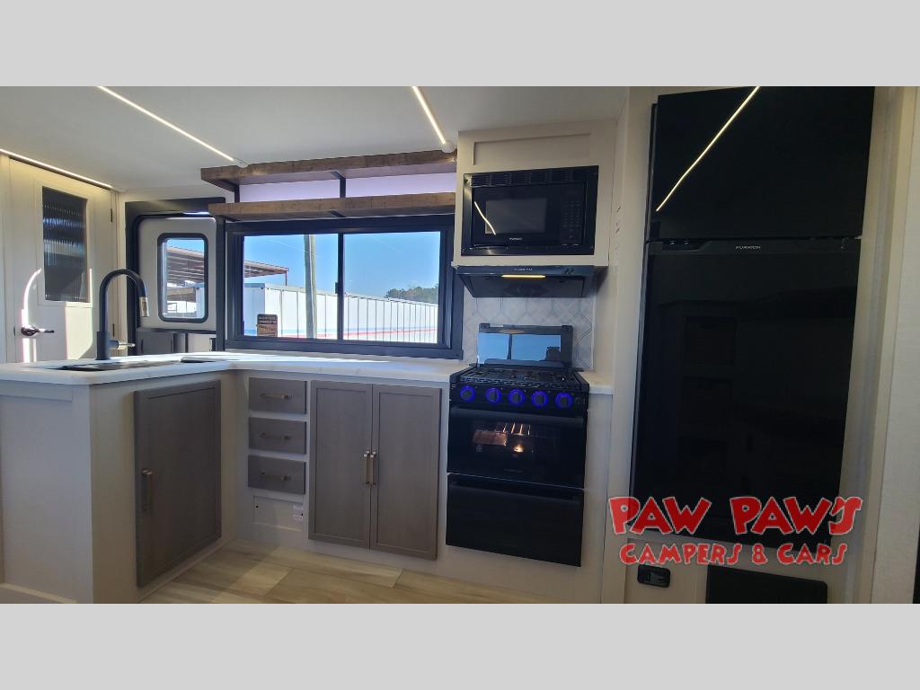 This dual entry travel trailer is the perfect unit to travel with a larger group since there is sleeping for ten! There are double-size bunks in the rear corner, a queen bed with Versa Tilt in the front private bedroom, plus a U-shaped dinette and tri-fold sofa in the main living area. The rear corner bath includes a walk-in shower with a skylight, a spacious linen closet, and one of the dual entry doors for added convenience. The chef of your group will love the camp kitchen window with shelves above for spices, and there is an exterior griddle and mount if they enjoy cooking outdoors. This unit also includes an entertainment center with a 40" LED Smart TV and a fireplace for a cozy evening indoors, and the entry pantry will be perfect to keep snacks stocked!