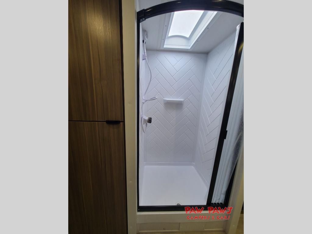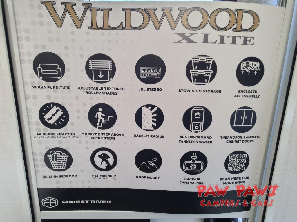 Whether it's a family vacation or a romantic getaway with your significant other, this Wildwood X-Lite travel trailer will make it the very best! The master bedroom has many places to store items with the walk-in closet and bedside closet plus the overhead cabinet, and the walk-through bath also provides additional storage with a linen closet and vanity. There is also a custom king bed with Versa-Tilt you are sure to enjoy. The kitchen has modern amenities, like the oversized refrigerator and double sink, plus the U-shaped dinette has panoramic windows that surround it to create an inviting space to spend your time. And you will enjoy the protection from the 16' awning and the sturdy Step Above steps at the entry.