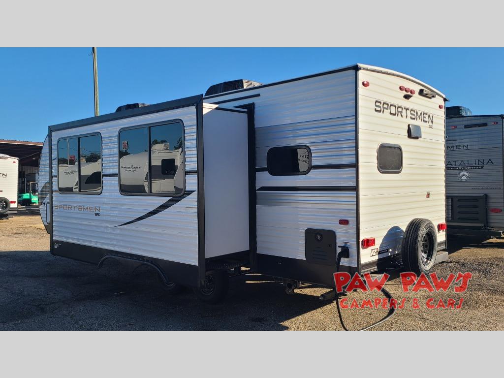 Each Sportsmen SE travel trailer by KZ is constructed with KZ exclusive tough shield exterior metal, a one-piece seamless walk-on Tufflex roofing material, and diamond plate rock guard to protect your unit from road debris. You will appreciate the extra large baggage doors for stowing away your gear when not in use, and tinted windows to help keep the harmful sun rays out plus keeping it cooler inside. Some of the exterior conveniences found in the mandatory Advantage Package are the solid folding steps with a large folding grab handle for easy entry and exit, a full glass friction hinged entry door, plus an exterior shower for your pets or to rinse off before you head inside. You'll also appreciate the nitrogen-filled tires, solar and backup camera prep, plus a Leash Latch with a bonus beverage opener. You'll feel right at home inside with linoleum flooring throughout, a 13,500 BTU air conditioner, large overhead cabinets, a shower surround, and much more!