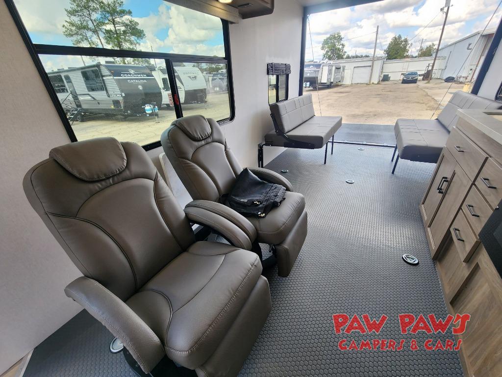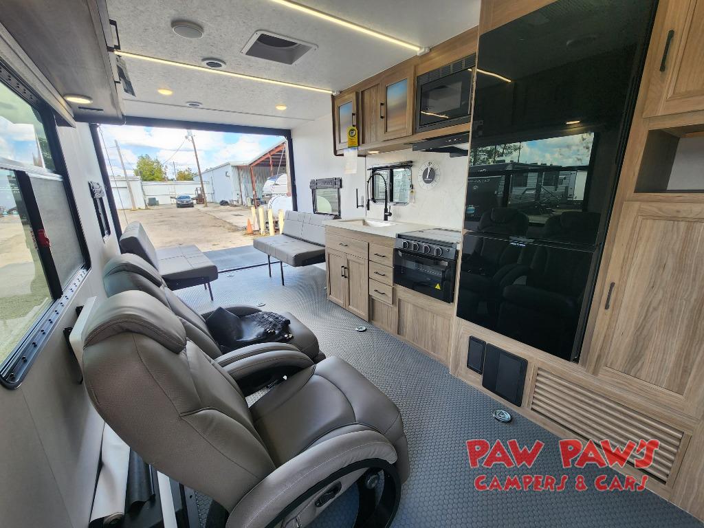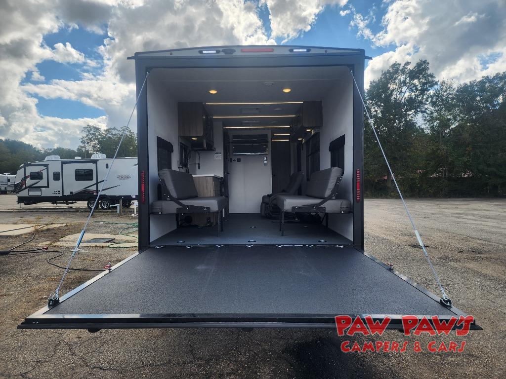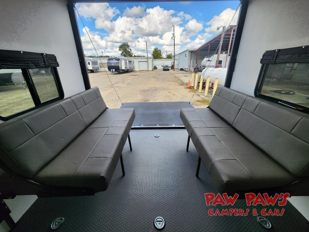 Whether you hit the trails or relax indoors, you will love having this toy hauler at the campsite! After you've unloaded your dirt bikes from the 15' 9" garage, enjoy lunch seated on one of the roll-over sofas with a dinette table between. You may even decide to check the weather on the Smart TV before heading out to find a trail. This trailer includes a dual entry bath with a shower skylight for extra headroom and natural lighting, and the front master bedroom will provide complete comfort with its king bed. You have a few options to add such as an electric bed over the sofas for more sleeping space, a 30 gallon fuel station to keep the toys running the whole trip, plus more if you like.