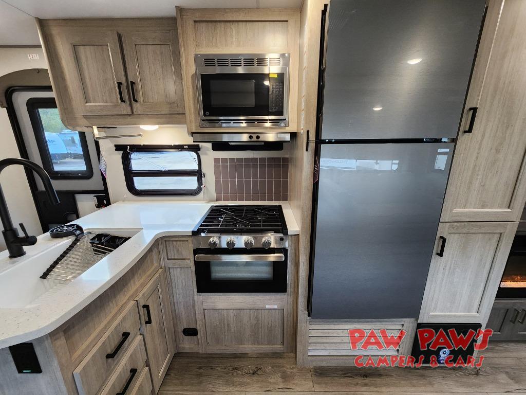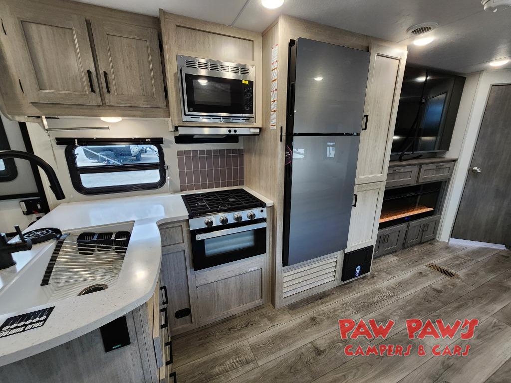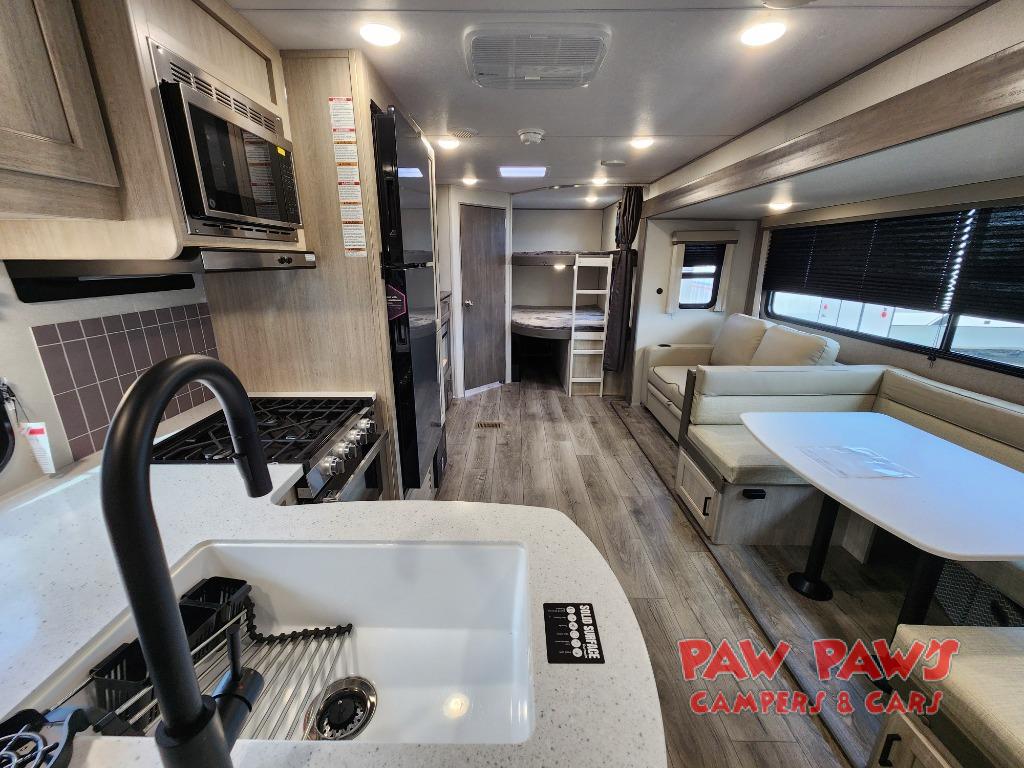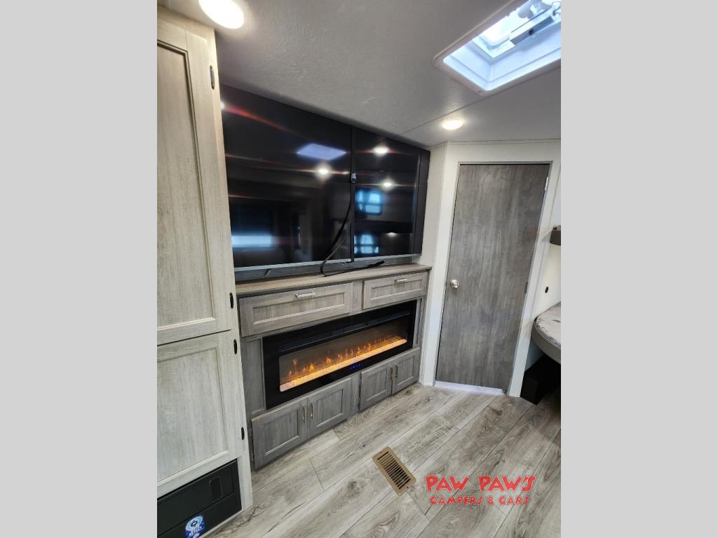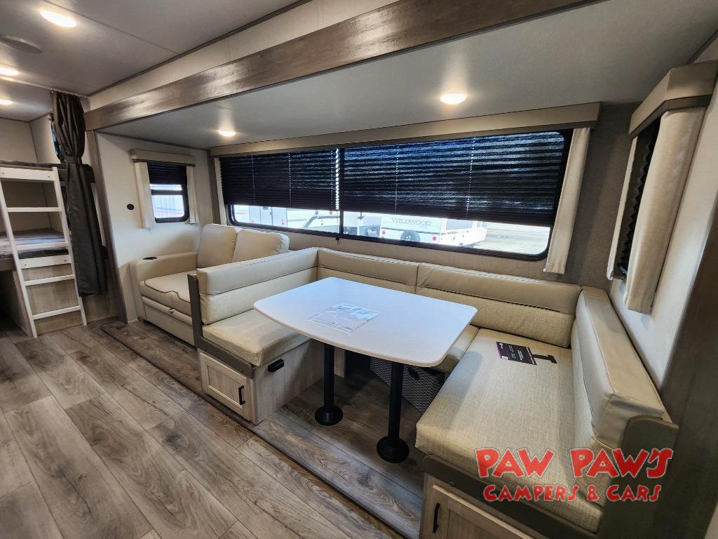This travel trailer is perfect for your whole crew! Once you arrive at the campground, you can put out the 21' electric awning and start lunch on the exterior camper kitchen with a griddle and mini fridge. There is also a pass-thru storage plus additional exterior storage with a fold-down table and a TV hookup for added convenience. And since there are dual entry doors found on this unit, you can enter in through the full bath in the back, or the main living area towards the front! A large slide provides ample space to move about, and you'll find a trundle sofa and U-shaped dinette here for cozy seating and sleeping space. Speaking of sleeping, there is a front RV queen bed in the bedroom plus double-size bunks in the back for guests!