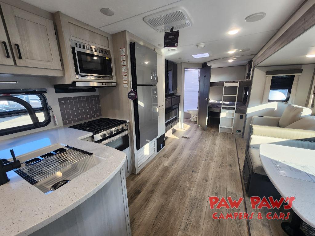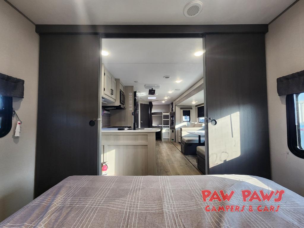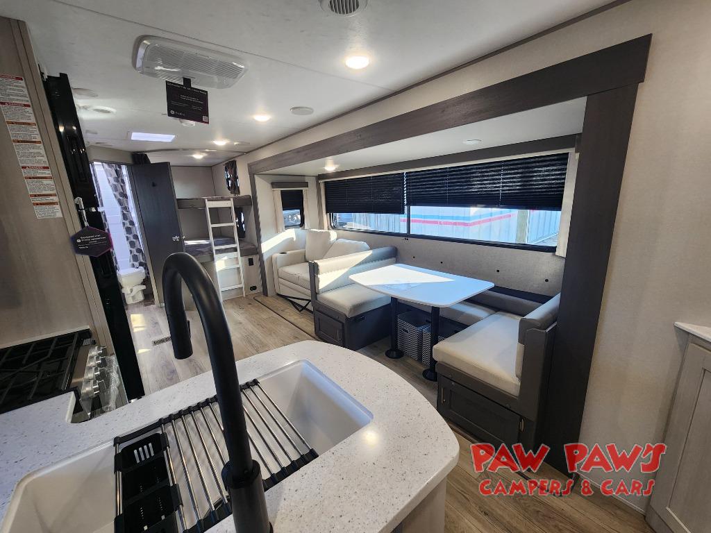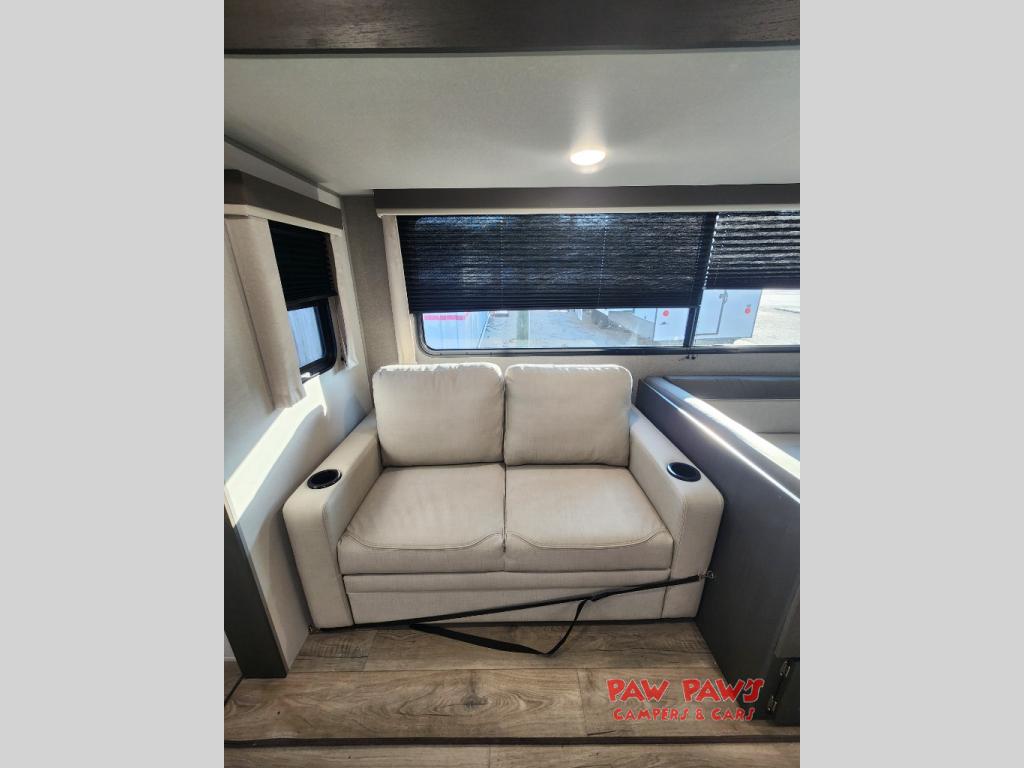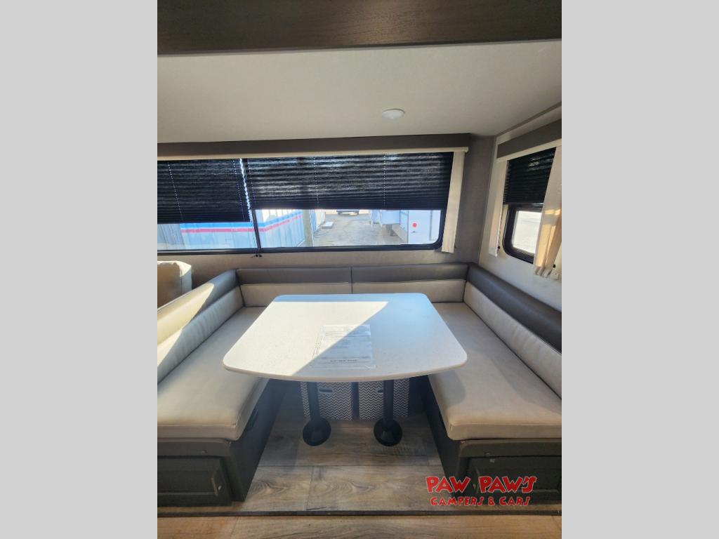This travel trailer is perfect for your whole crew! Once you arrive at the campground, you can put out the 21' electric awning and start lunch on the exterior camper kitchen with a griddle and mini fridge. There is also a pass-thru storage plus additional exterior storage with a fold-down table and a TV hookup for added convenience. And since there are dual entry doors found on this unit, you can enter in through the full bath in the back, or the main living area towards the front! A large slide provides ample space to move about, and you'll find a trundle sofa and U-shaped dinette here for cozy seating and sleeping space. Speaking of sleeping, there is a front RV queen bed in the bedroom plus double-size bunks in the back for guests!