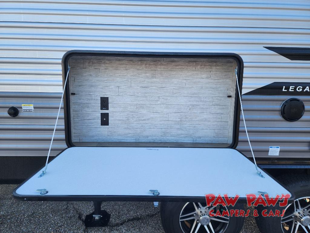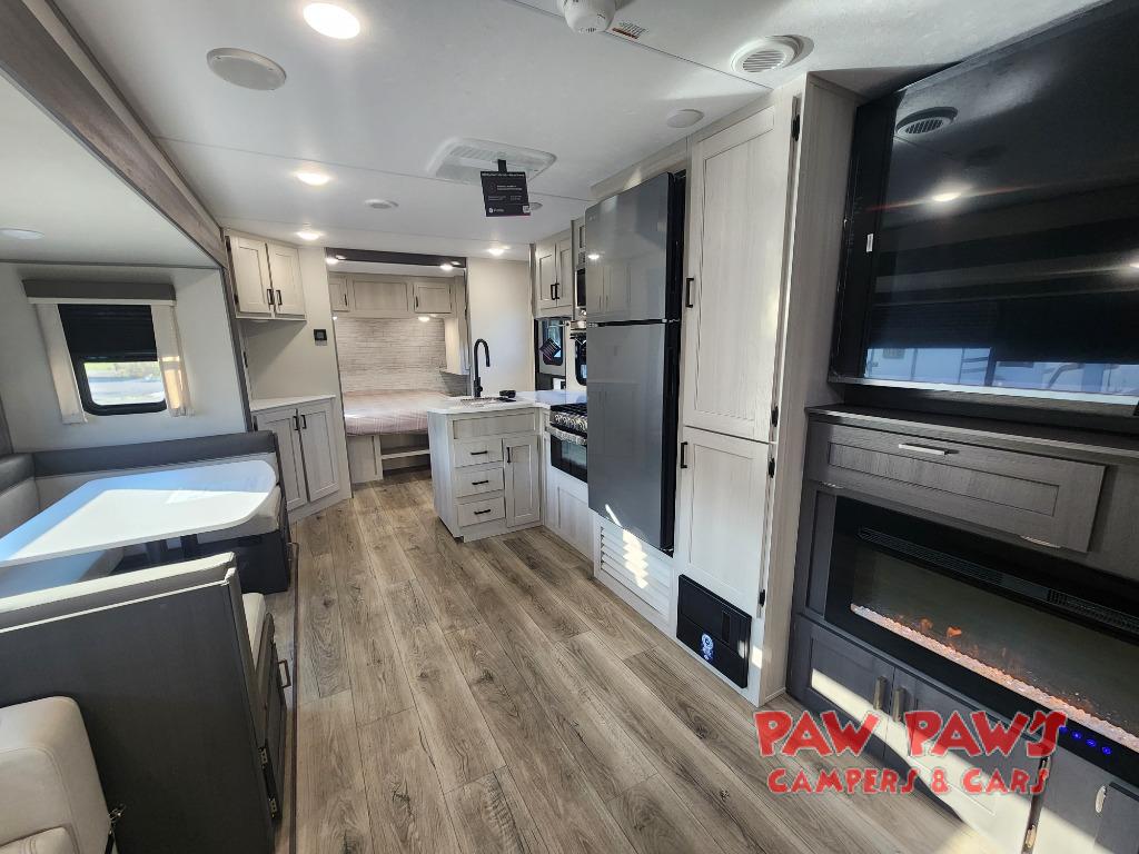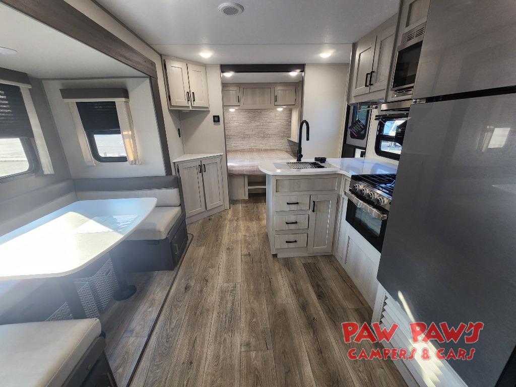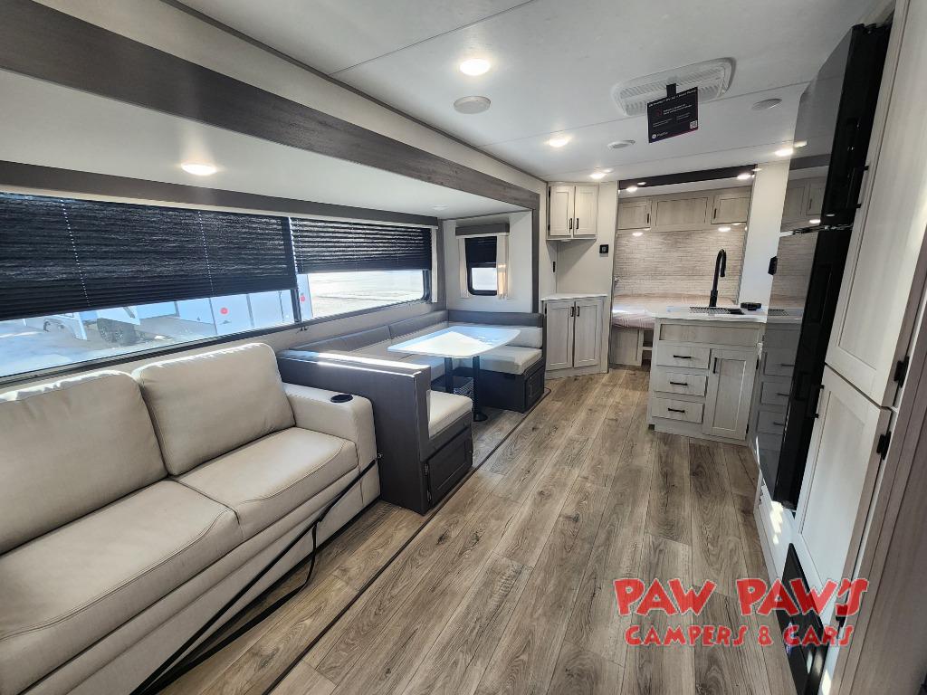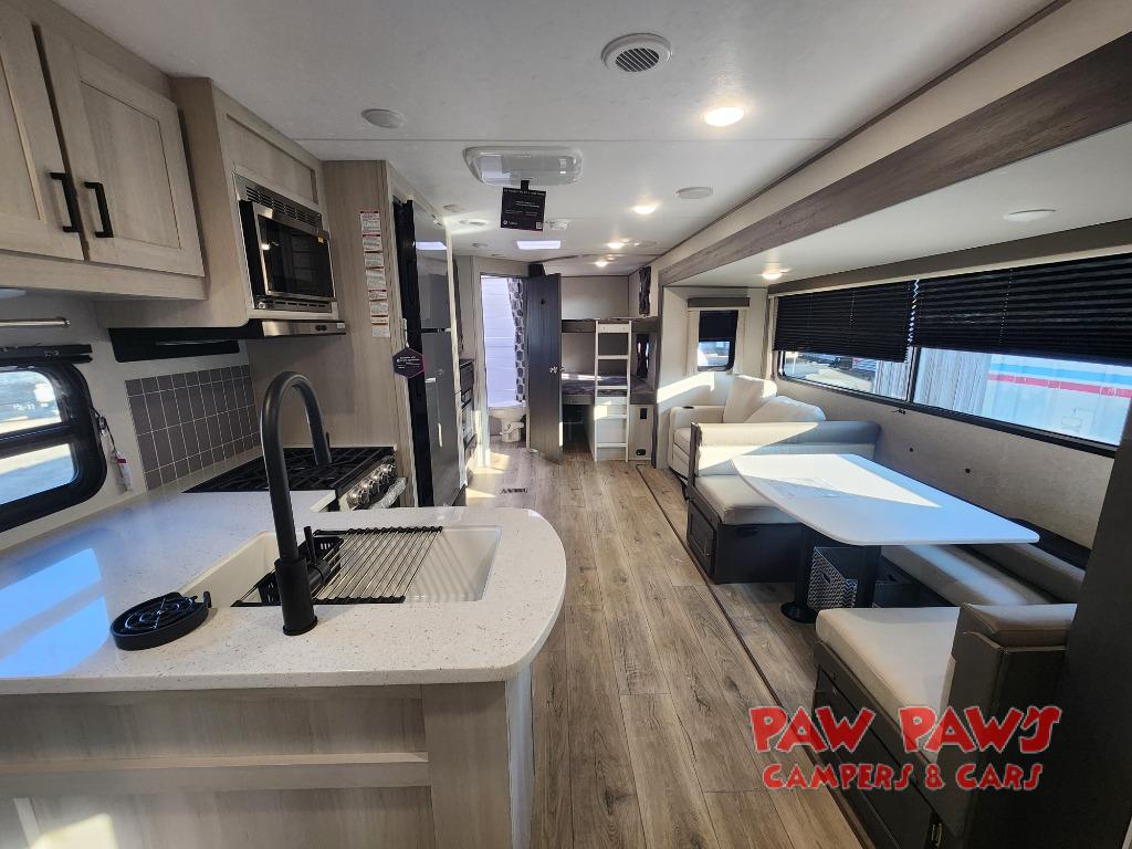 This travel trailer is perfect for your whole crew! Once you arrive at the campground, you can put out the 21' electric awning and start lunch on the exterior camper kitchen with a griddle and mini fridge. There is also a pass-thru storage plus additional exterior storage with a fold-down table and a TV hookup for added convenience. And since there are dual entry doors found on this unit, you can enter in through the full bath in the back, or the main living area towards the front! A large slide provides ample space to move about, and you'll find a trundle sofa and U-shaped dinette here for cozy seating and sleeping space. Speaking of sleeping, there is a front RV queen bed in the bedroom plus double-size bunks in the back for guests!