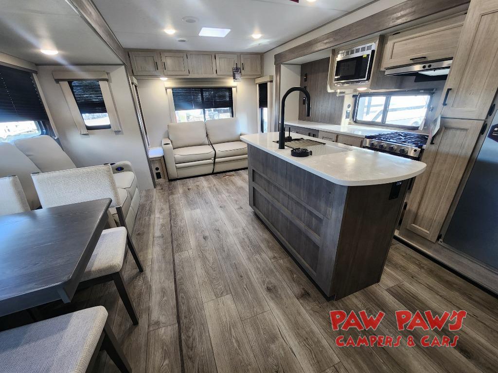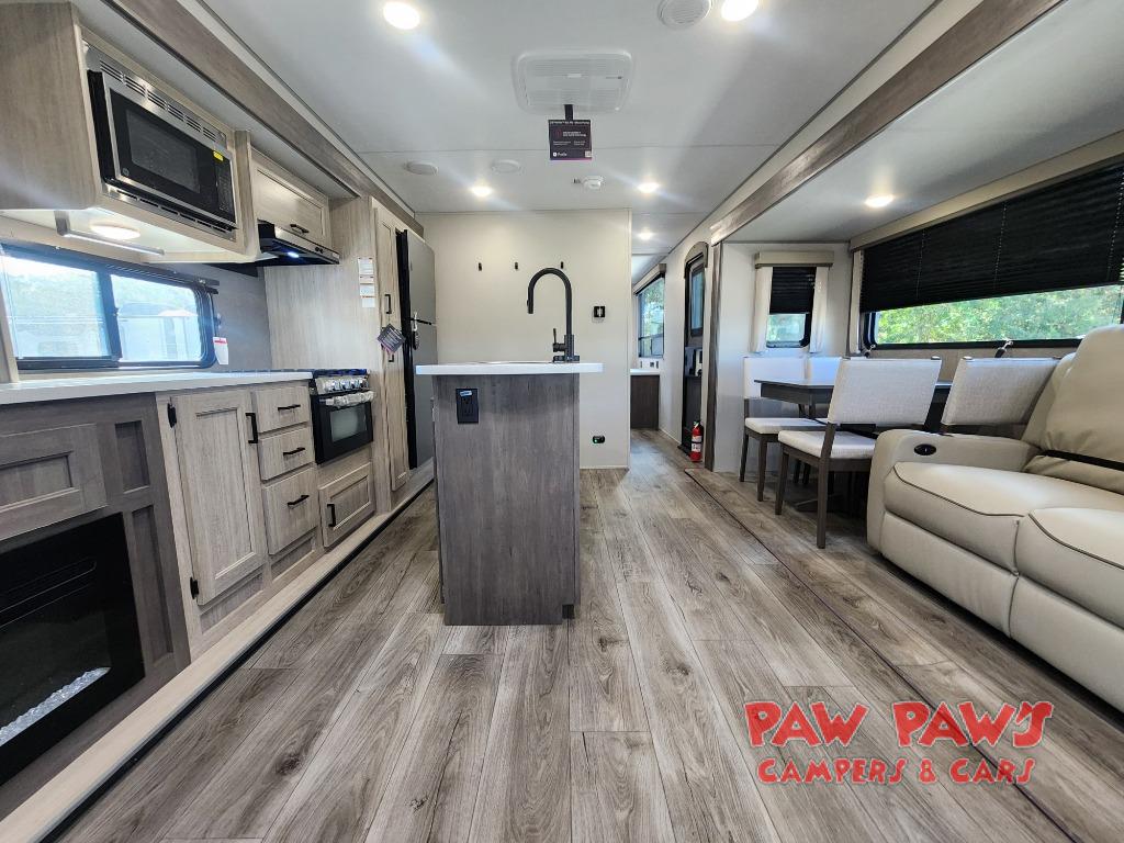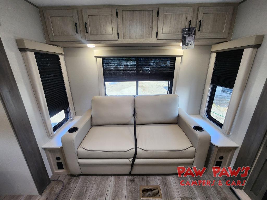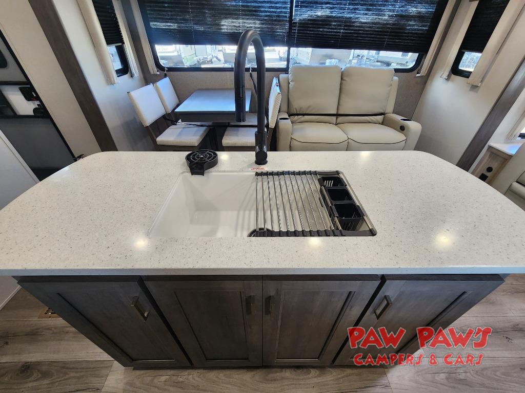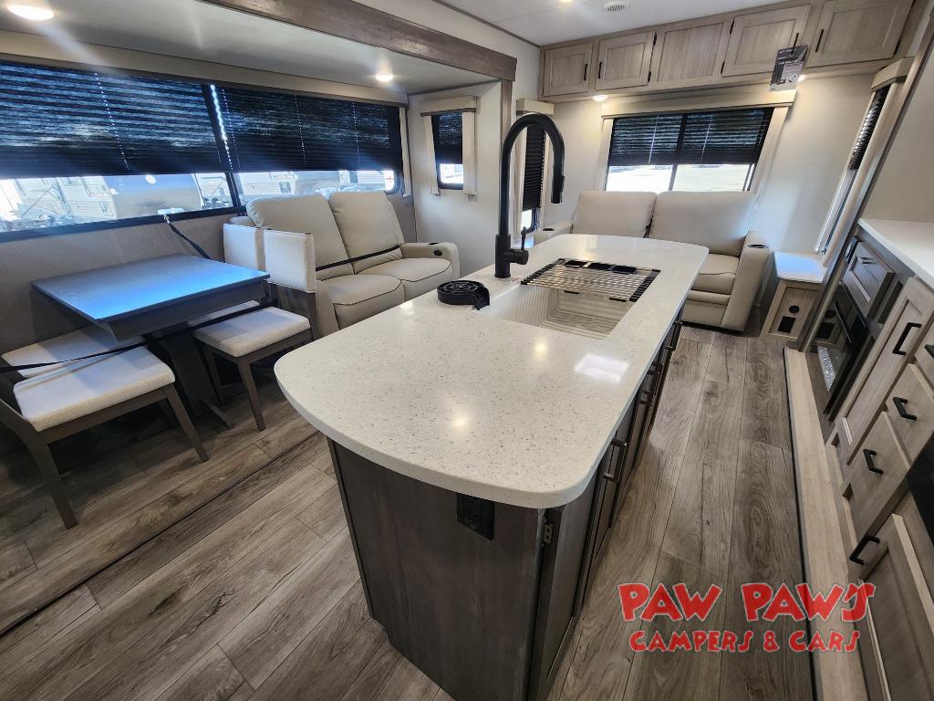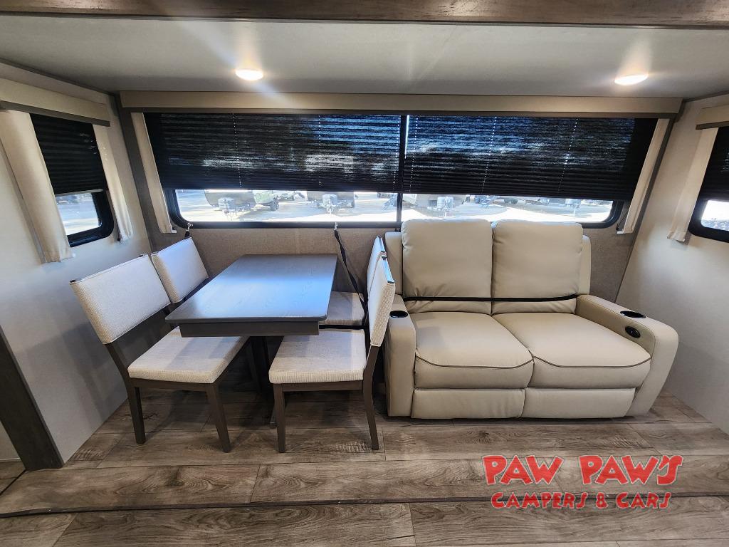It's not hard to find comfort in this travel trailer with its triple slides, theater seating, and spacious full bath. Once your crew is settled and unpacked, head outdoors to relax under the two power awnings with multicolored LED lights, or grab the fishing poles from the exterior storage and head to the water. If you'd rather spend your day inside you'll find all the comforts of home; theater seating, a sofa and booth dinette, plus a fully equipped kitchen, complete with a kitchen island! You will love having your own space in the front bedroom that includes a queen bed slide out, a dresser, plus two closets. There is even washer and dryer prep if you plan to go full-time!