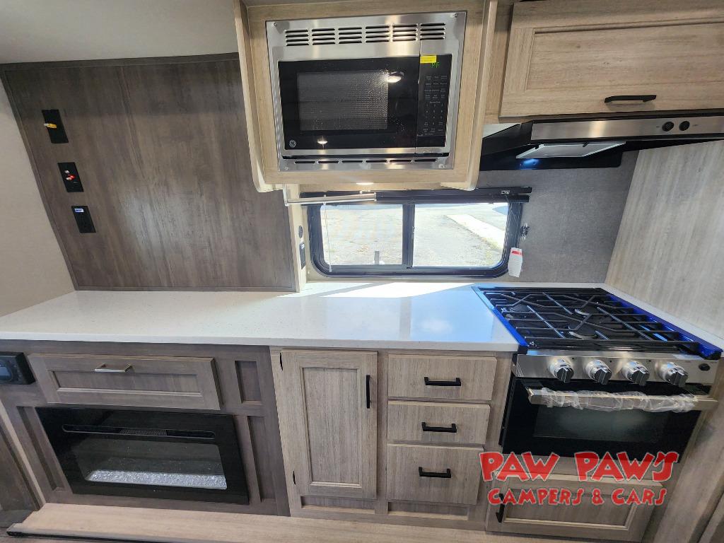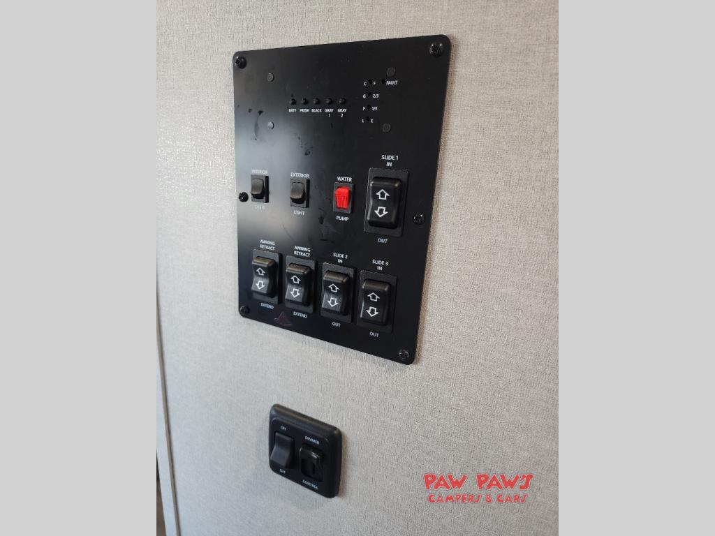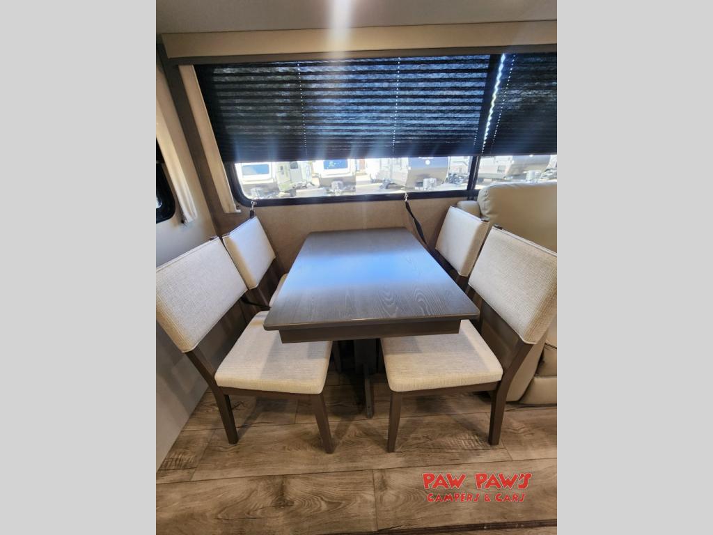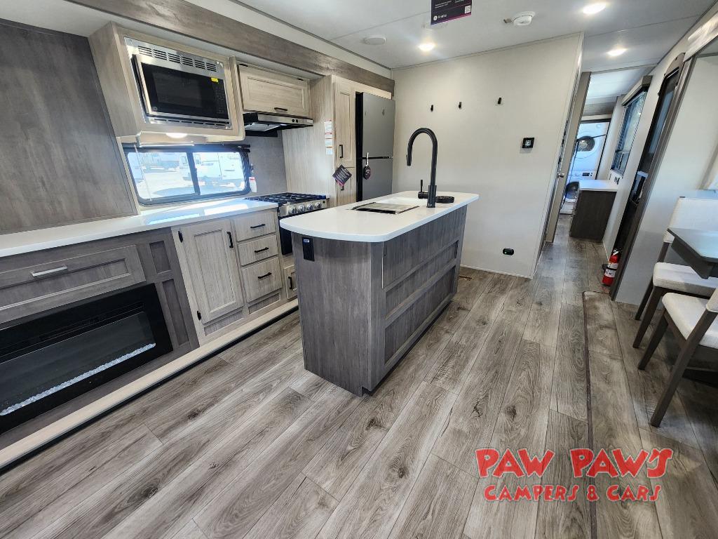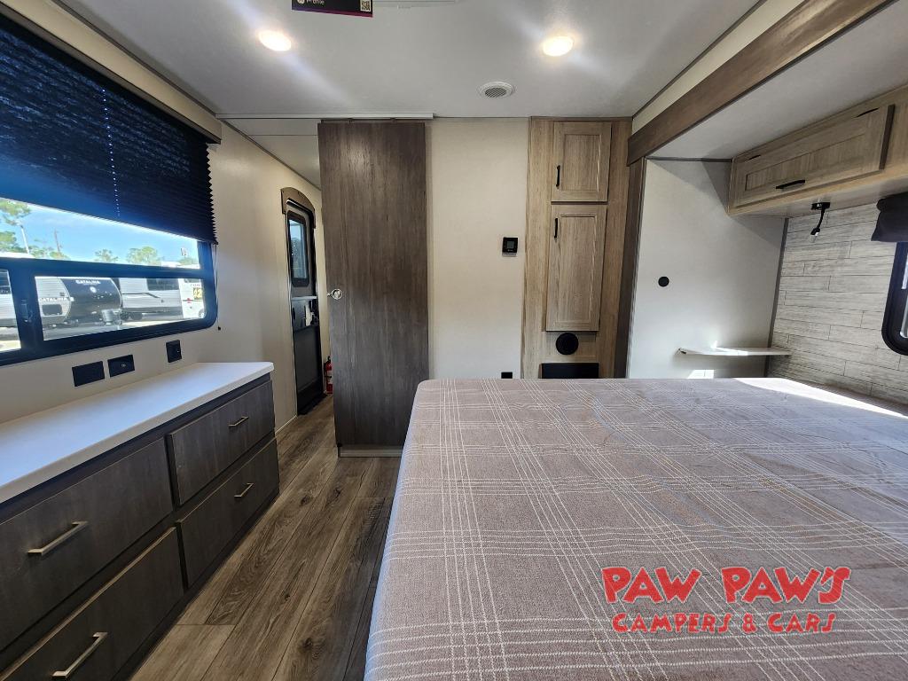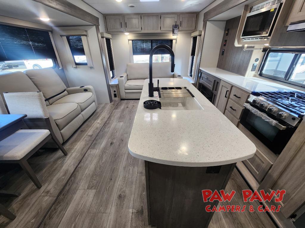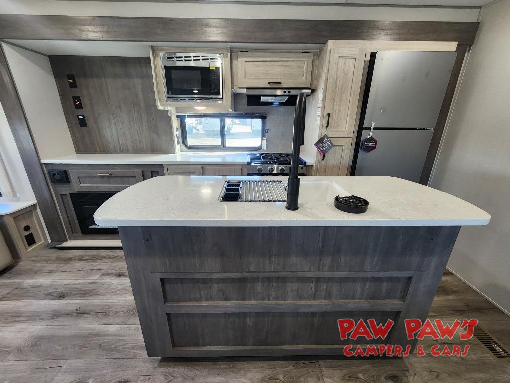 It's not hard to find comfort in this travel trailer with its triple slides, theater seating, and spacious full bath. Once your crew is settled and unpacked, head outdoors to relax under the two power awnings with multicolored LED lights, or grab the fishing poles from the exterior storage and head to the water. If you'd rather spend your day inside you'll find all the comforts of home; theater seating, a sofa and booth dinette, plus a fully equipped kitchen, complete with a kitchen island! You will love having your own space in the front bedroom that includes a queen bed slide out, a dresser, plus two closets. There is even washer and dryer prep if you plan to go full-time!