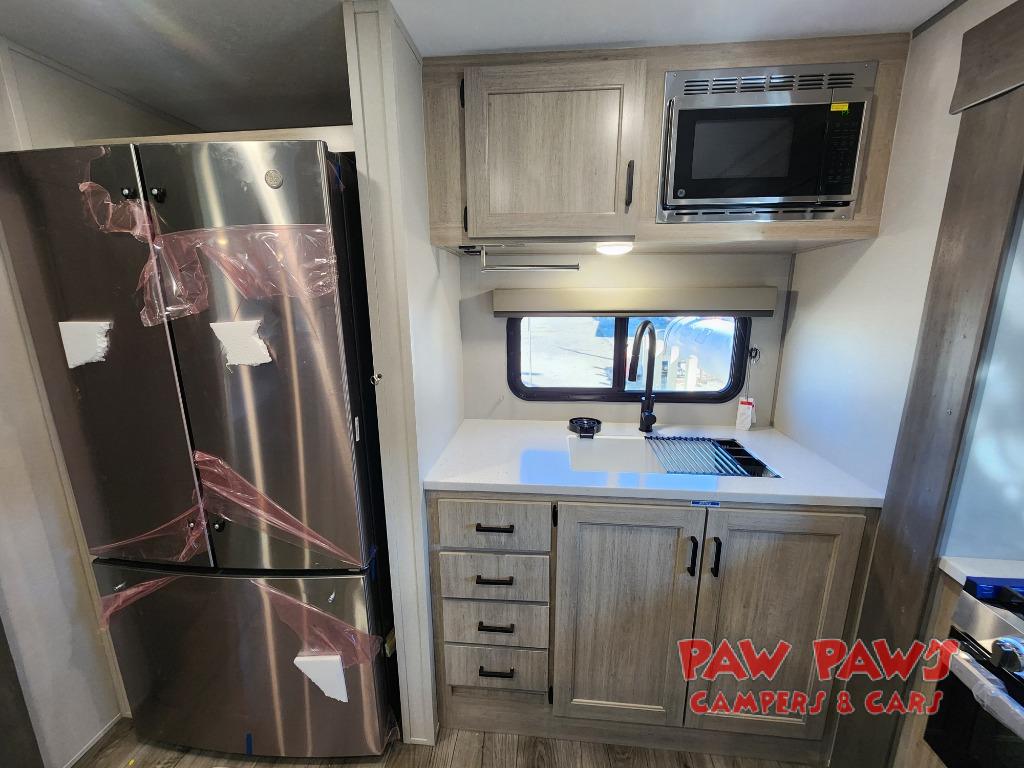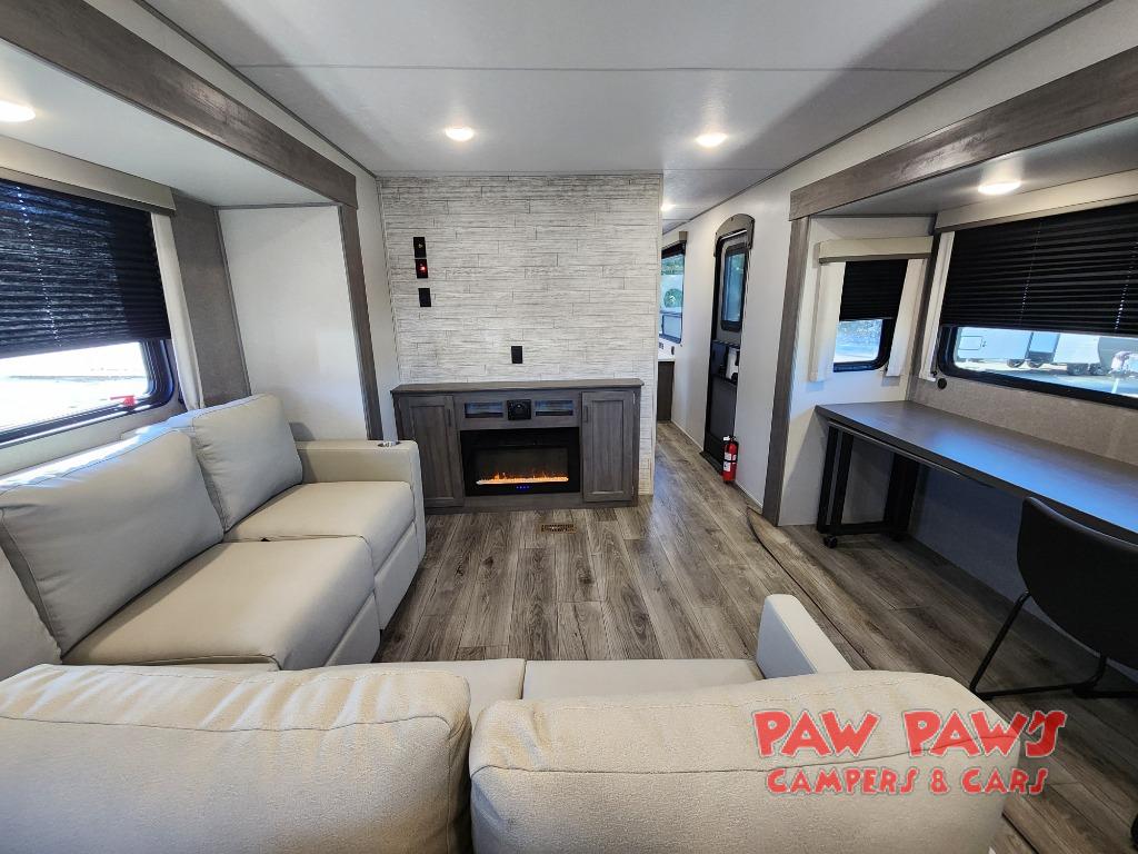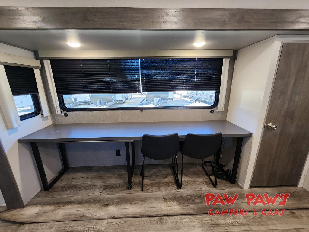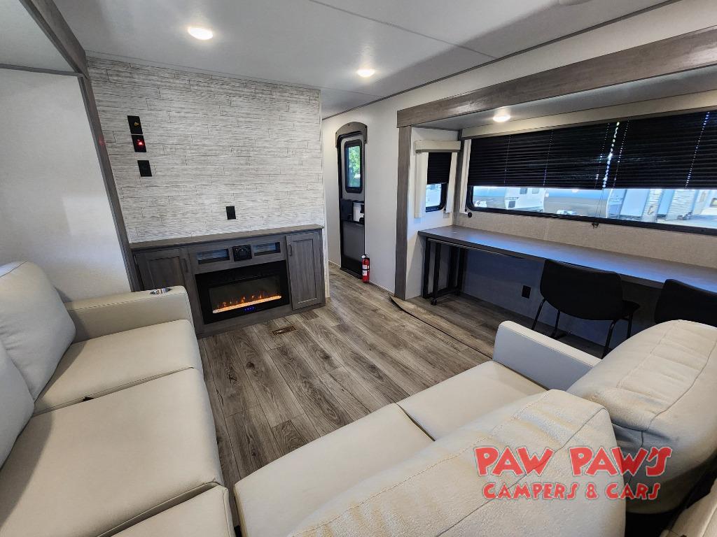 This travel trailer rear kitchen will make you feel like home is on the road, featuring a spacious pantry, residential refrigerator, overhead cabinets, microwave, kitchen island, and sliding desk/table for all your cooking and dining needs. The dining counter and chairs provide the perfect place to enjoy meals with family and friends. The living room boasts a comfortable sectional sofa and TV/entertainment center for relaxing and having fun with your favorite person, whether you're watching your favorite movie, playing games, or simply enjoying quality time with loved ones, this space has everything you need. Moreover, the full bathroom is super complete with a wardrobe, linen closet, and all the amenities you need to freshen up and feel at home. Plus, you and your partner will love this front bedroom, since it is private, featuring a comfortable RV queen bed and a dresser ideal for keeping your clothes organized. There are also overhead cabinets, a closet, and washer/dryer prep for all your laundry needs, making this space the perfect place to rest and recharge after a long day of adventure. Outside, you'll appreciate the two awnings for shade and protection from the elements, as well as the exterior storage for all your gear and toys.