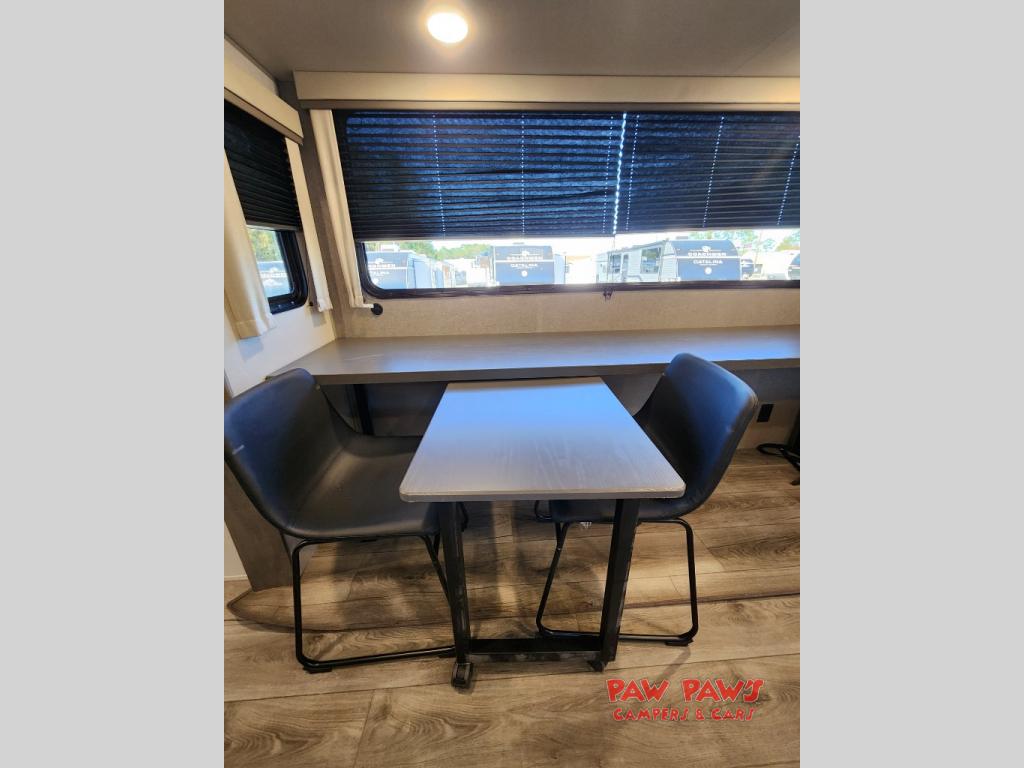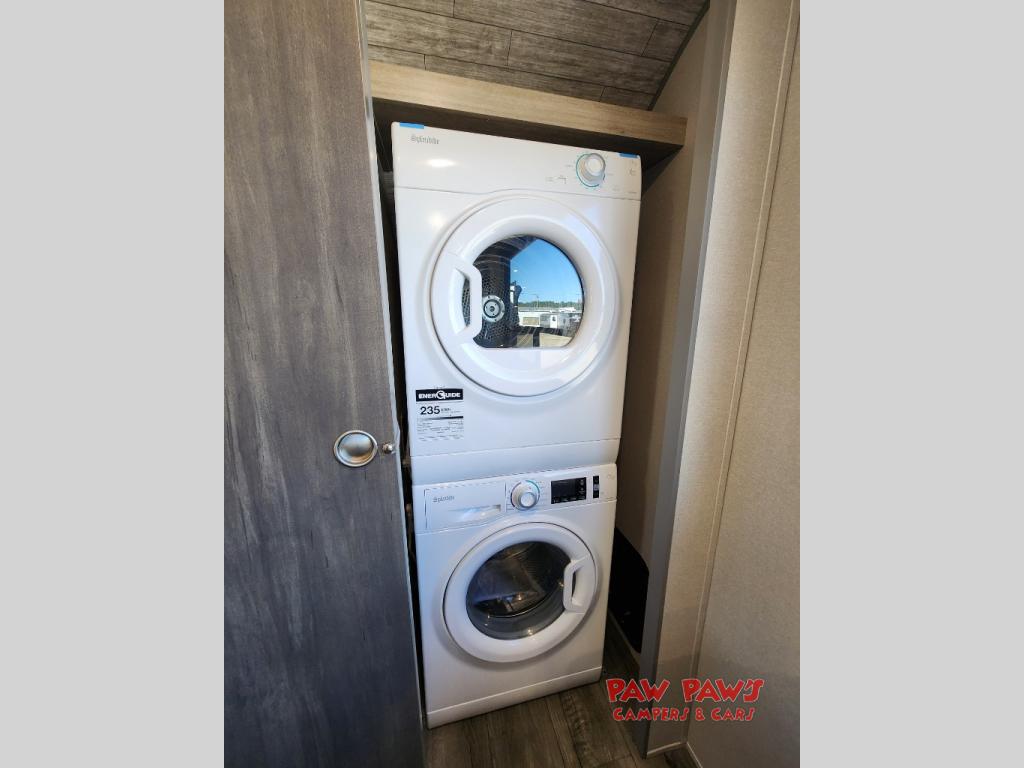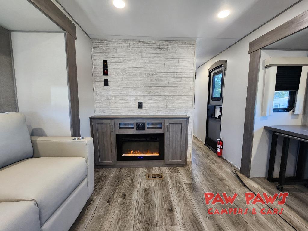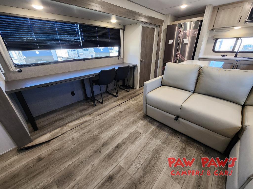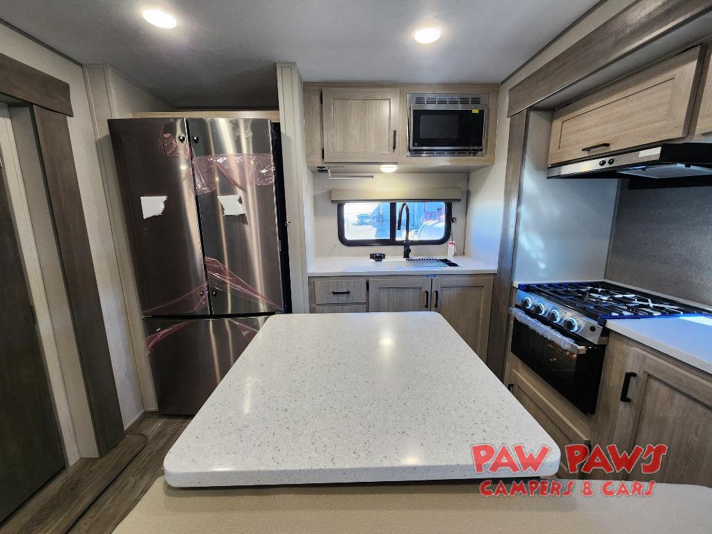 This travel trailer rear kitchen will make you feel like home is on the road, featuring a spacious pantry, residential refrigerator, overhead cabinets, microwave, kitchen island, and sliding desk/table for all your cooking and dining needs. The dining counter and chairs provide the perfect place to enjoy meals with family and friends. The living room boasts a comfortable sectional sofa and TV/entertainment center for relaxing and having fun with your favorite person, whether you're watching your favorite movie, playing games, or simply enjoying quality time with loved ones, this space has everything you need. Moreover, the full bathroom is super complete with a wardrobe, linen closet, and all the amenities you need to freshen up and feel at home. Plus, you and your partner will love this front bedroom, since it is private, featuring a comfortable RV queen bed and a dresser ideal for keeping your clothes organized. There are also overhead cabinets, a closet, and washer/dryer prep for all your laundry needs, making this space the perfect place to rest and recharge after a long day of adventure. Outside, you'll appreciate the two awnings for shade and protection from the elements, as well as the exterior storage for all your gear and toys.