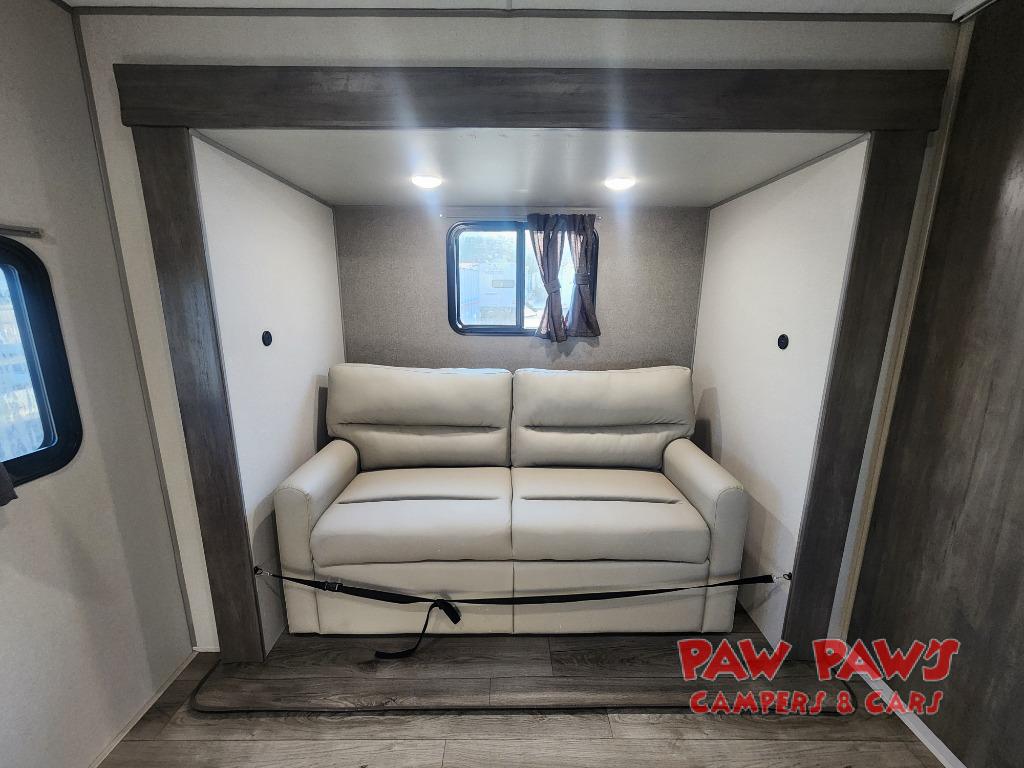 This trailer offers lots of floor space thanks to the triple slides throughout! You and your family will love the combined living and kitchen area with a slide out booth dinette and a sofa with drink holders. The L-shaped kitchen counter allows the cook to make meals without moving for anyone trying to get to the full bathroom and rear den. Here, you'll find a Murphy bed slide, a wardrobe and a workstation with TV hookups if you want to add entertainment. The front private bedroom allows you to sleep like royalty, and offers a large closet for your clothing and another closet prepped for a washer/dryer.