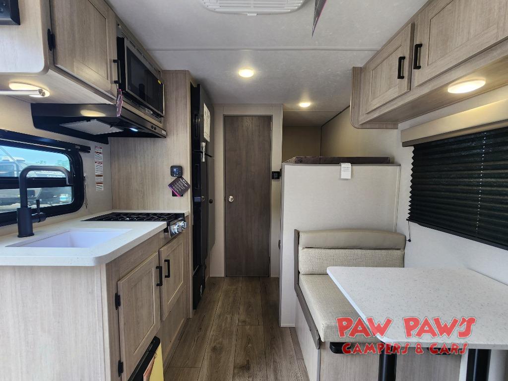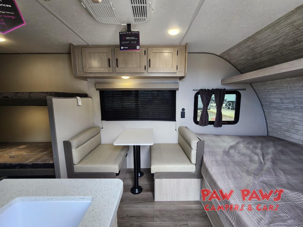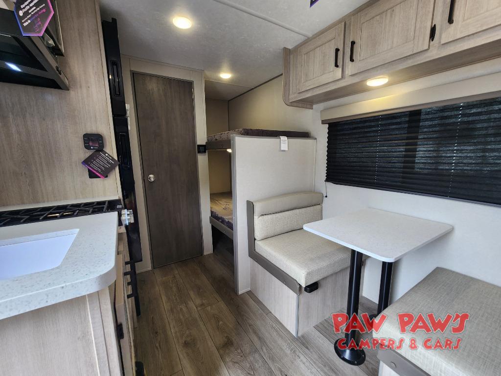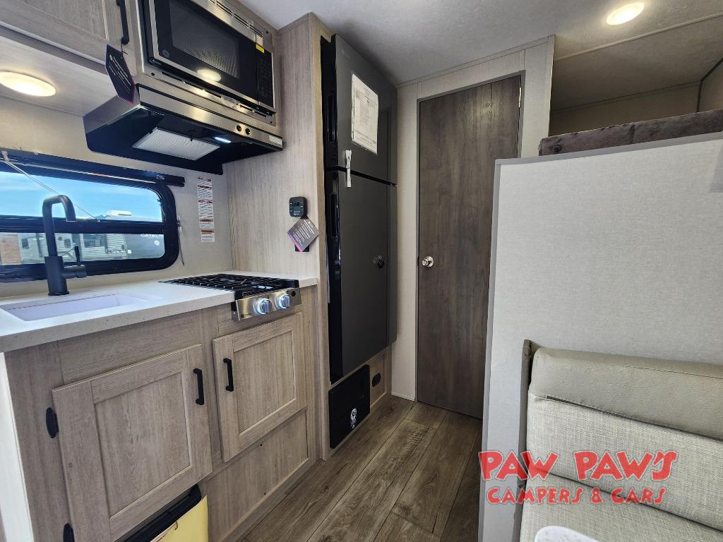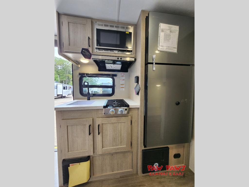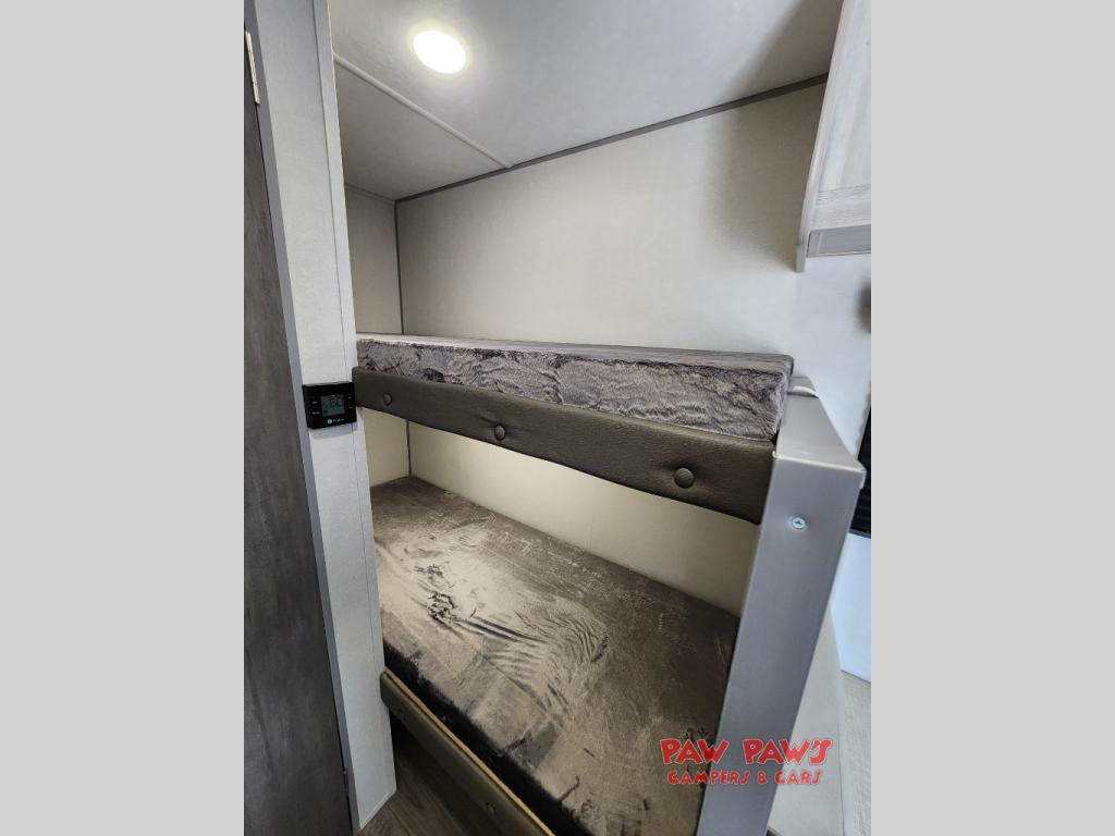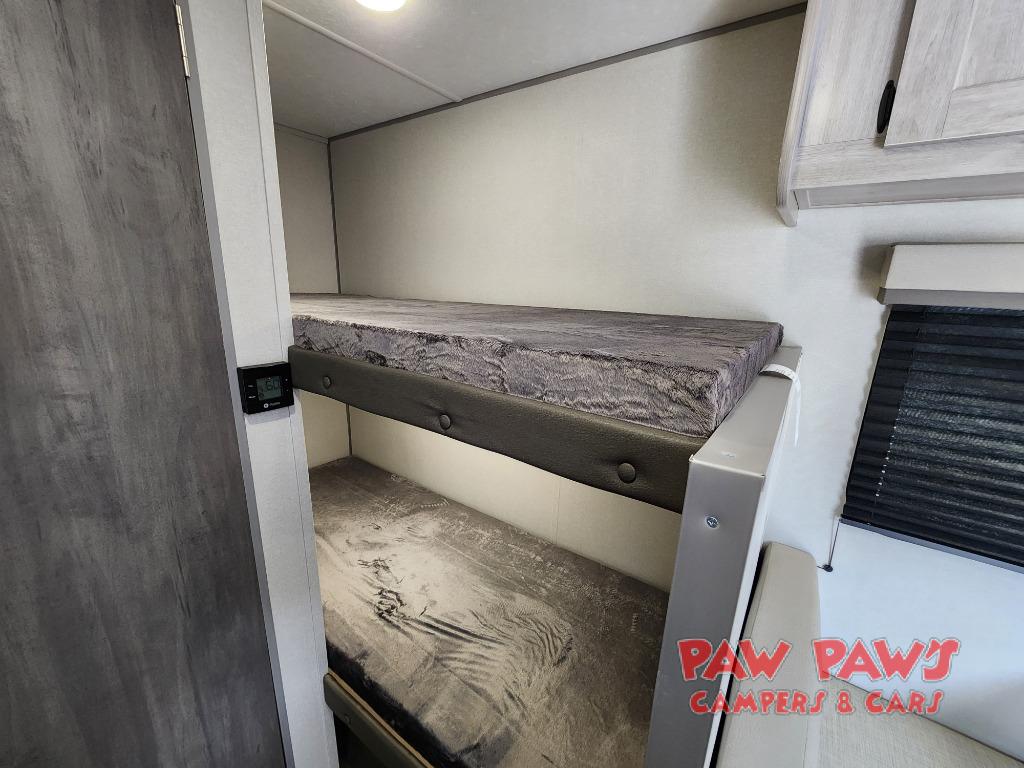 This travel trailers is perfect for a young family or smaller group. You can easily sleep four or more with the rear set of bunk beds and queen bed up front. There is also a 60" sofa for inside down-time, as well as complete kitchen and bath amenities so you can cook and stay clean while traveling. The rear corner bath features a toilet and 36" x 30" shower, and it's conveniently located next to the bunk beds which is great for little ones at night. Cooking inside will be easy with a GE stainless two-burner cooktop and single sink, plus there is also a GE microwave oven for snacks and things that you can easily warm up. If you plan to spend most of your time outdoors, you will find plenty of storage space in the front exterior storage compartment, and there is also plenty of storage inside as well.