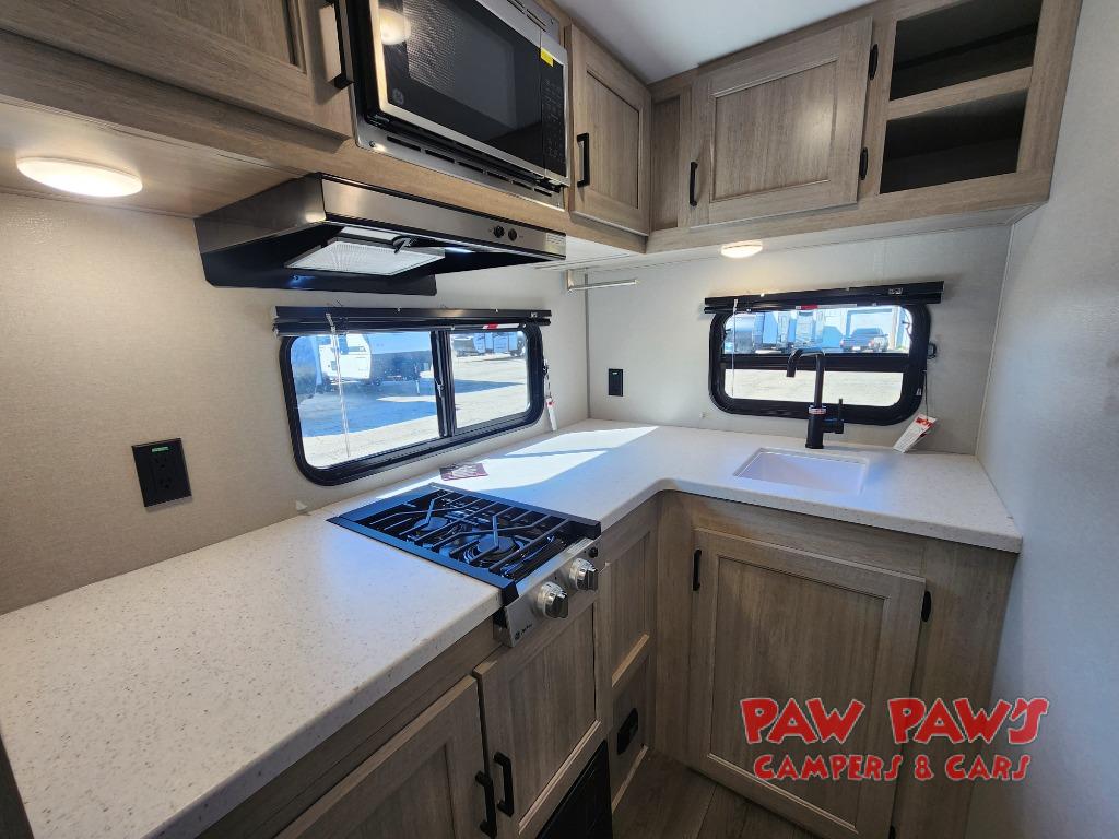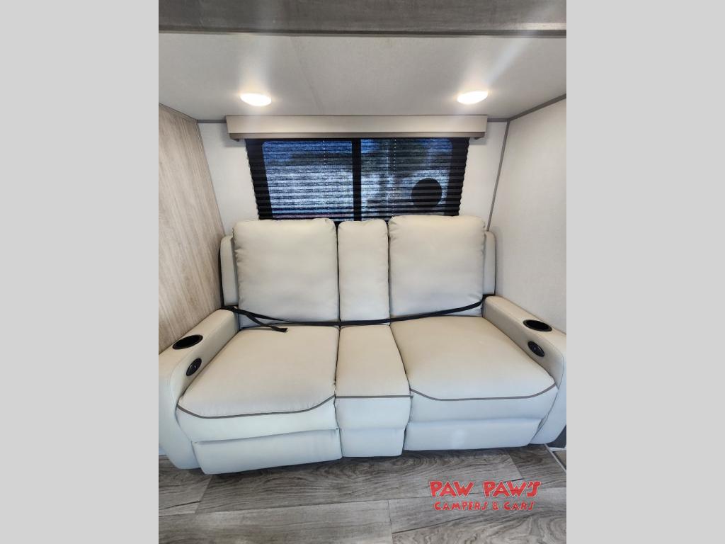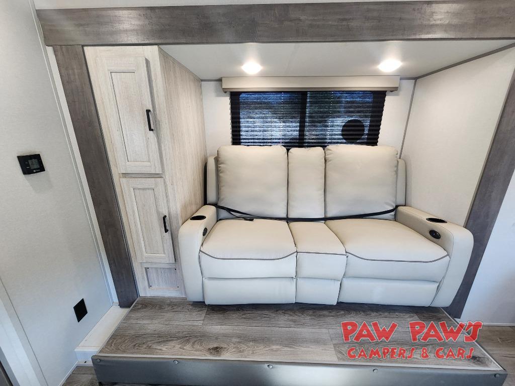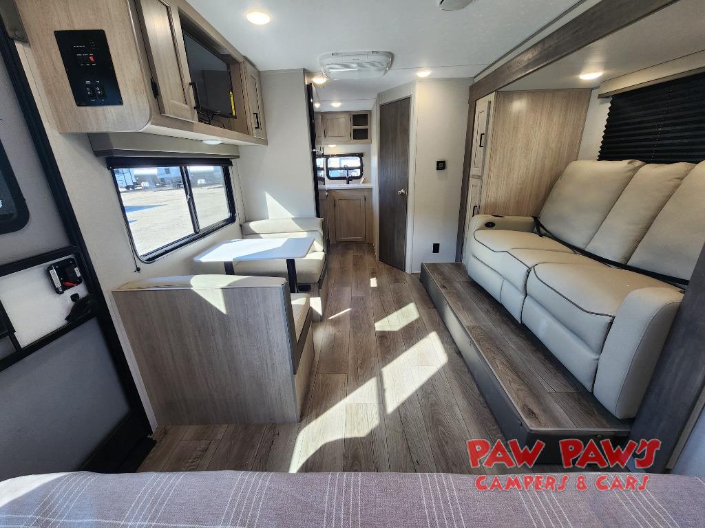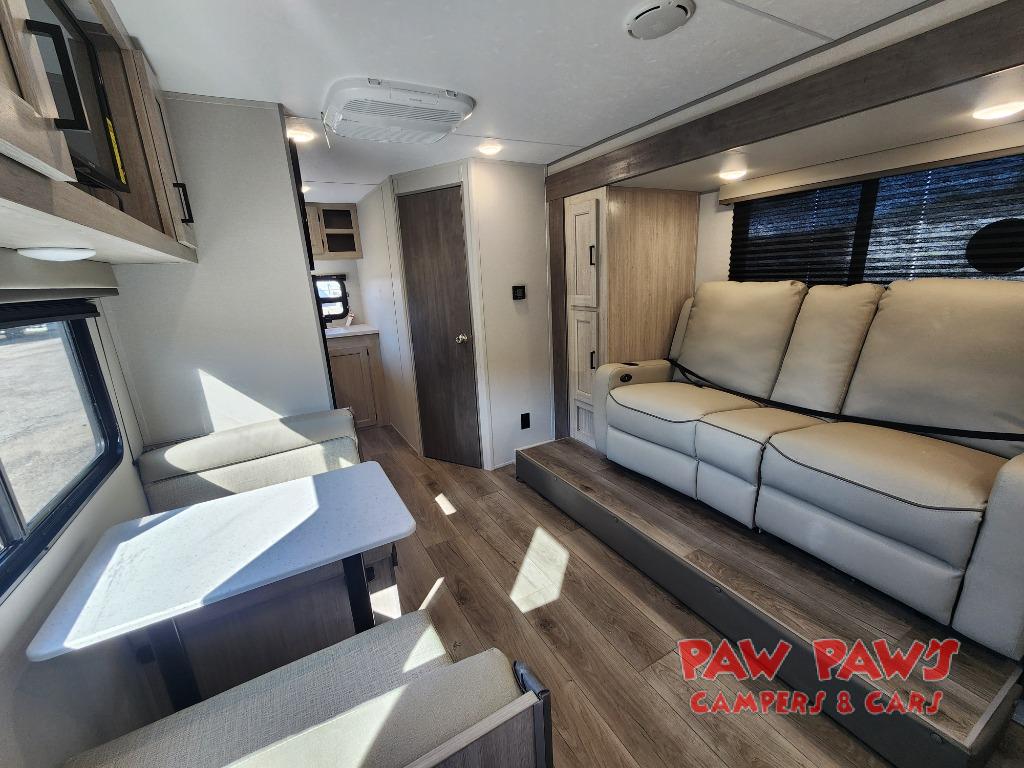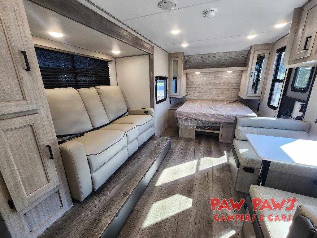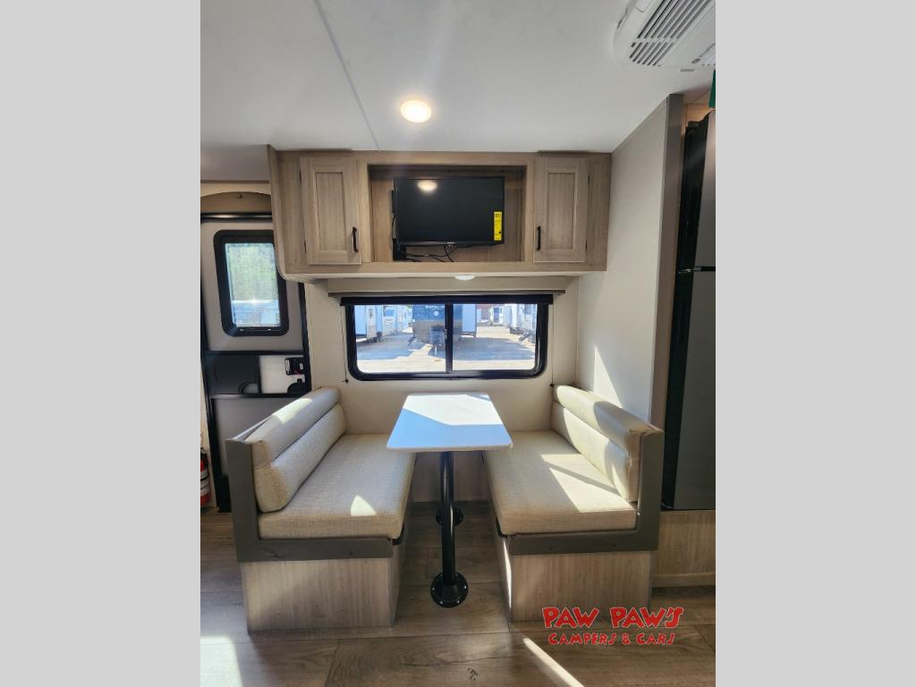 You will love how conventional this travel trailer is! If you want to travel for just a weekend or even more, you won't have to worry since you have all the amenities you need. This model has a queen bed with dual end wardrobes for some extra storage so you can neatly store your clothes. There is also a slide with theater seating, and a booth dinette to enjoy your favorite breakfast. A rear corner kitchen features everything you need to cook indoors, or you can head outside to use the outdoor Camper Kitchen with mini fridge and griddle. A rear corner bath features a 24" x 32" shower, toilet and sink. Outside, you'll find a 17' power awning with multicolor LED lights and exterior storage for camp gear.