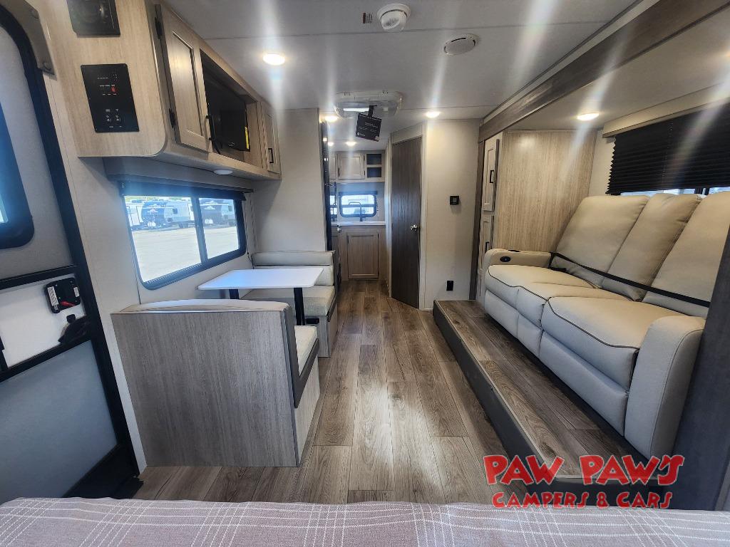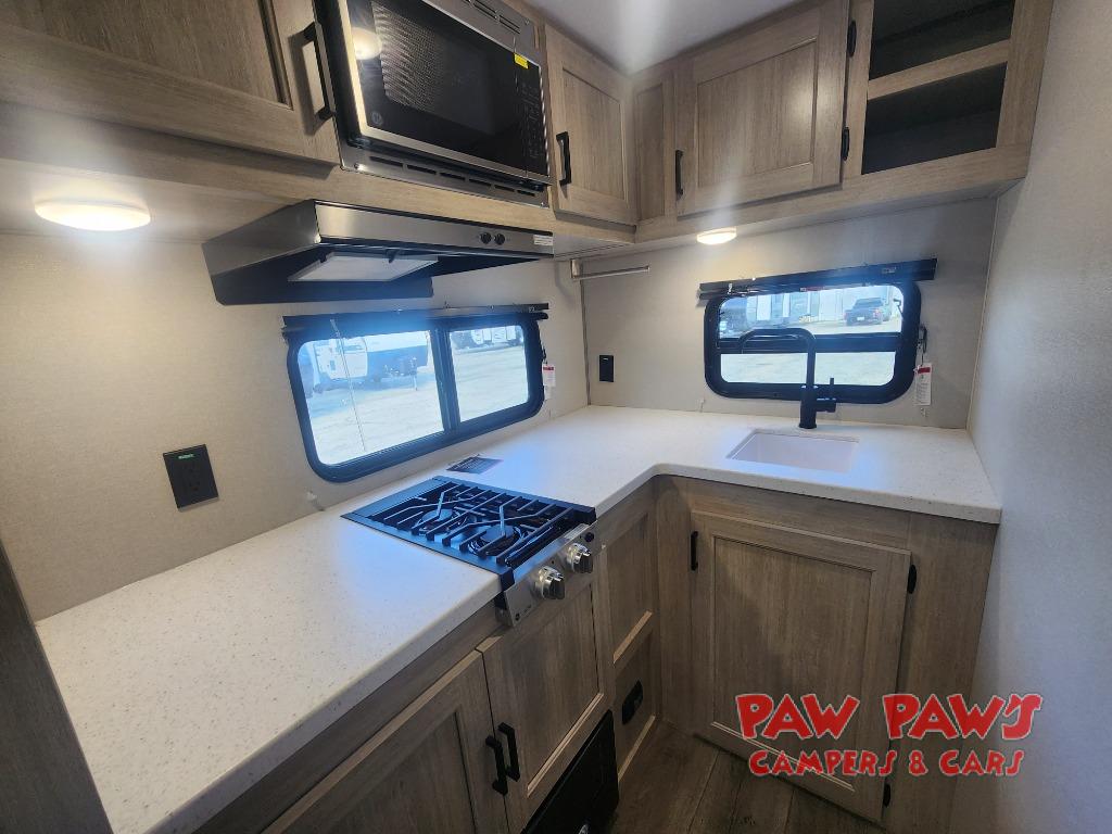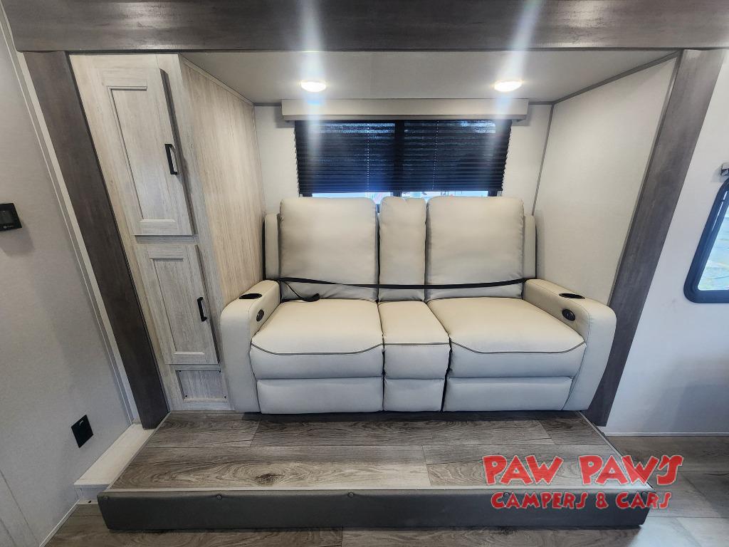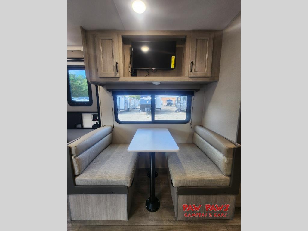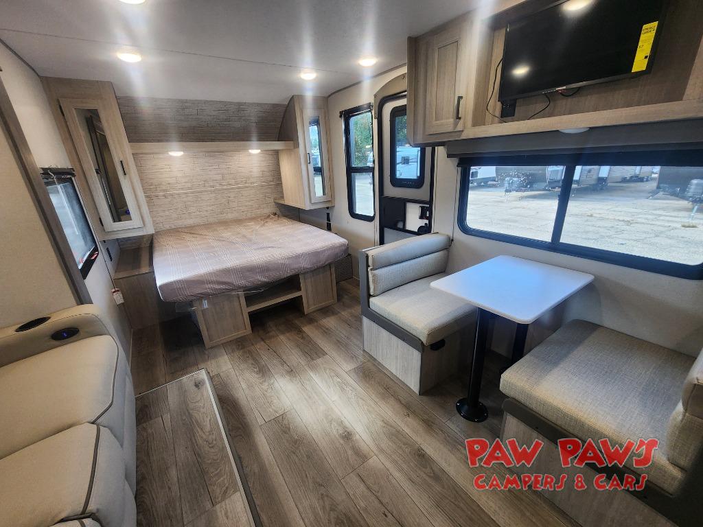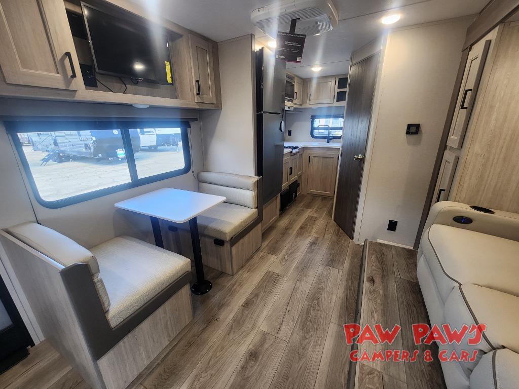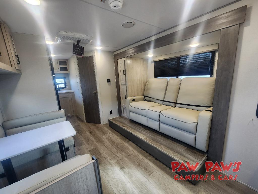 You will love how conventional this travel trailer is! If you want to travel for just a weekend or even more, you won't have to worry since you have all the amenities you need. This model has a queen bed with dual end wardrobes for some extra storage so you can neatly store your clothes. There is also a slide with theater seating, and a booth dinette to enjoy your favorite breakfast. A rear corner kitchen features everything you need to cook indoors, or you can head outside to use the outdoor Camper Kitchen with mini fridge and griddle. A rear corner bath features a 24" x 32" shower, toilet and sink. Outside, you'll find a 17' power awning with multicolor LED lights and exterior storage for camp gear.