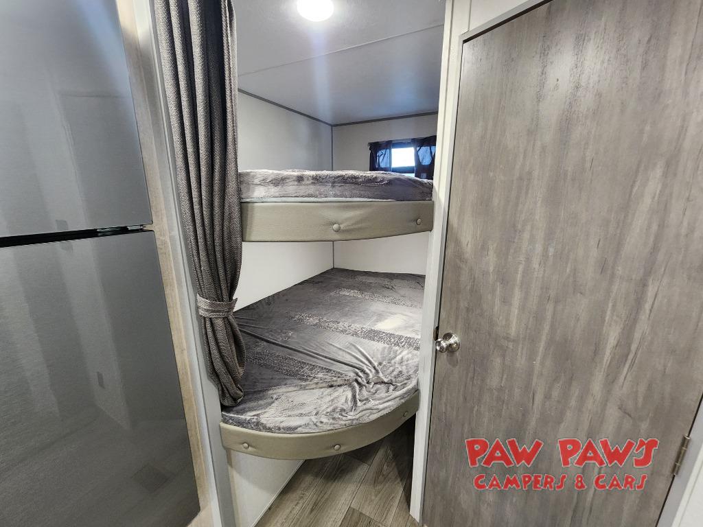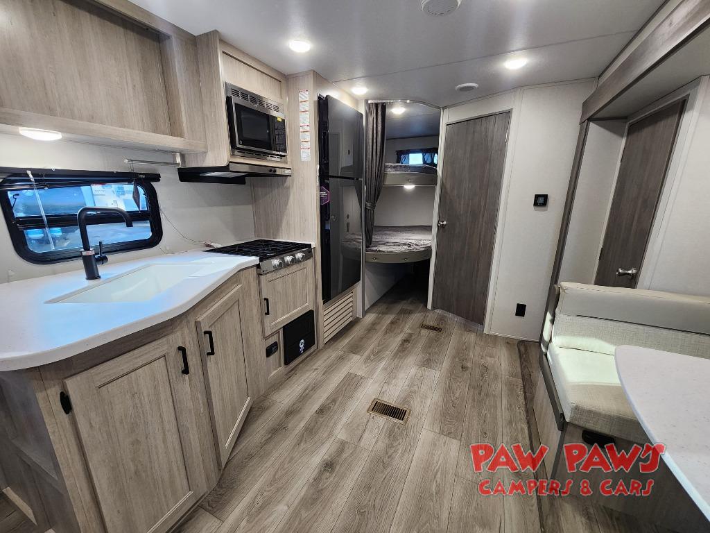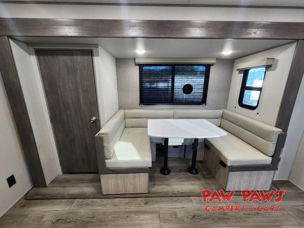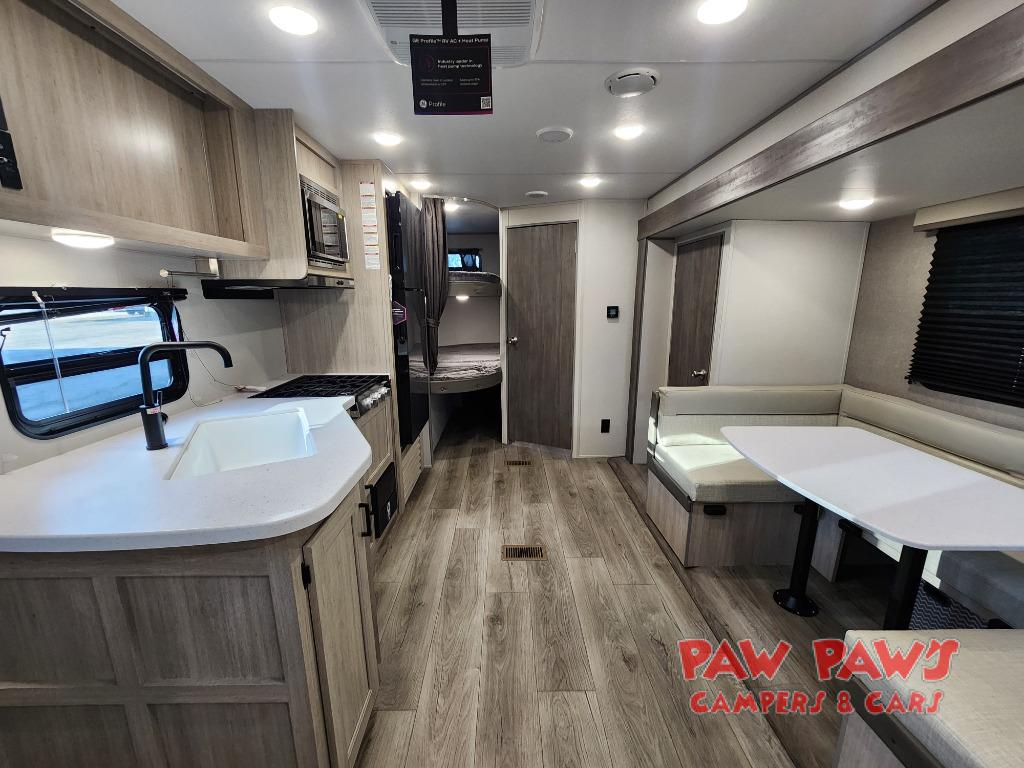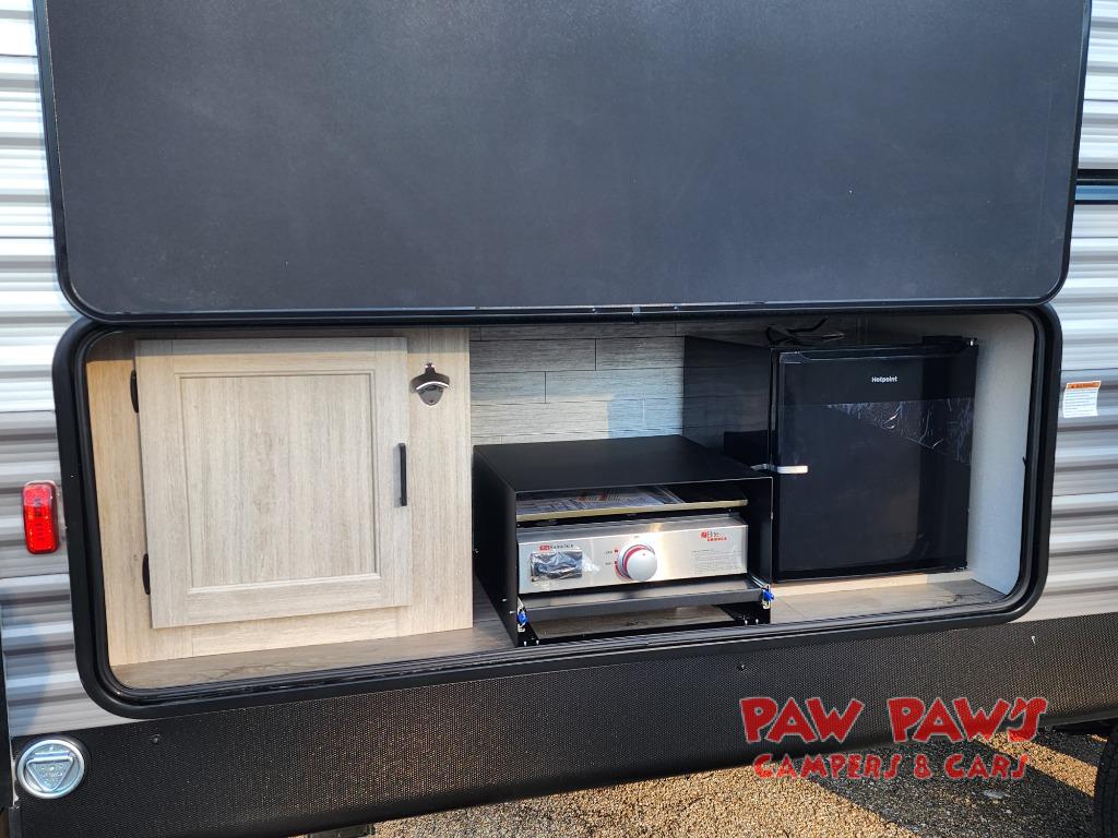 This is the perfect mid-size travel trailer for you and your family! The double-size bunks offer a comfortable sleeping space for the kids and you will have your own private sleeping space with a queen bed in the front bedroom. Freshen up each day in the rear corner bathroom with the tub/shower and a mirror to get ready each morning. You can prepare your best home cooked meals with the GE stainless three burner cooktop and GE stainless 10.7 cu. ft. 12V refrigerator, then enjoy them together at the u-shaped dinette. There is also a large pantry to store all your goods. Don't leave any of your outdoor gear behind either, thanks to the front pass-through storage area and the exterior outside storage area. You could even add the optional outside camper kitchen to grill the catch of the day on the pull out griddle!