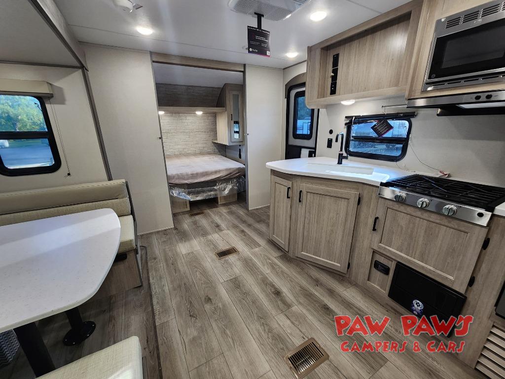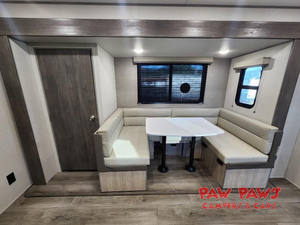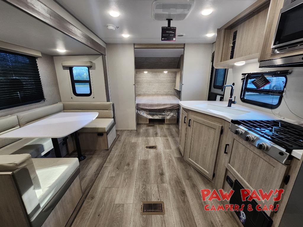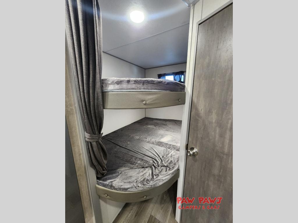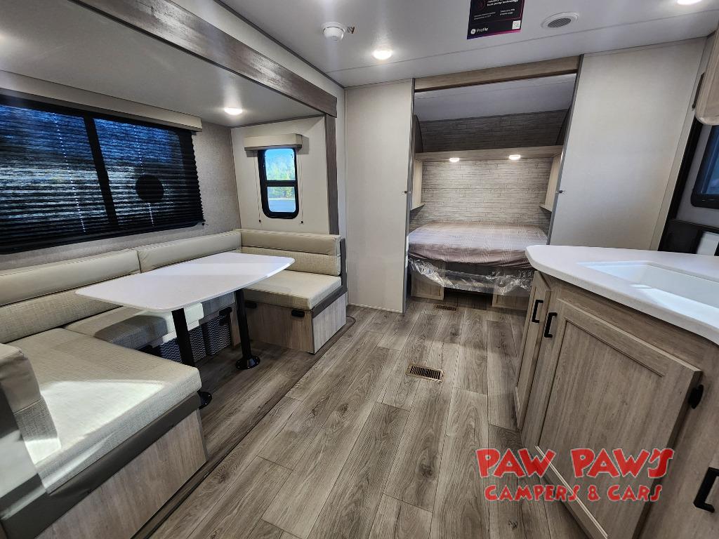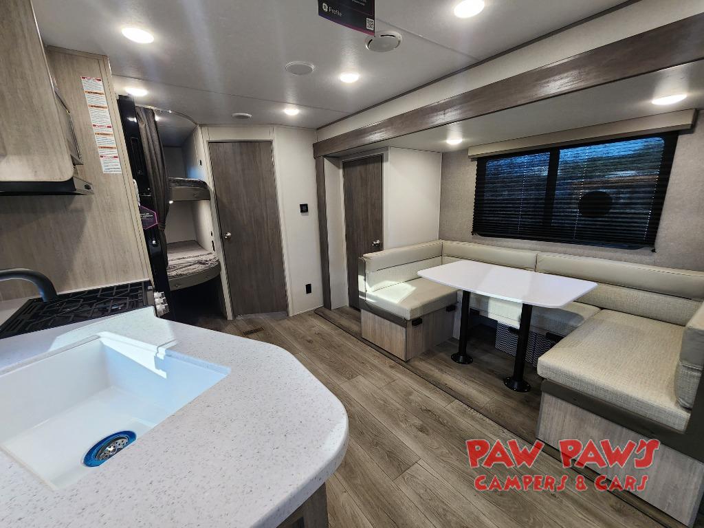 This is the perfect mid-size travel trailer for you and your family! The double-size bunks offer a comfortable sleeping space for the kids and you will have your own private sleeping space with a queen bed in the front bedroom. Freshen up each day in the rear corner bathroom with the tub/shower and a mirror to get ready each morning. You can prepare your best home cooked meals with the GE stainless three burner cooktop and GE stainless 10.7 cu. ft. 12V refrigerator, then enjoy them together at the u-shaped dinette. There is also a large pantry to store all your goods. Don't leave any of your outdoor gear behind either, thanks to the front pass-through storage area and the exterior outside storage area. You could even add the optional outside camper kitchen to grill the catch of the day on the pull out griddle!