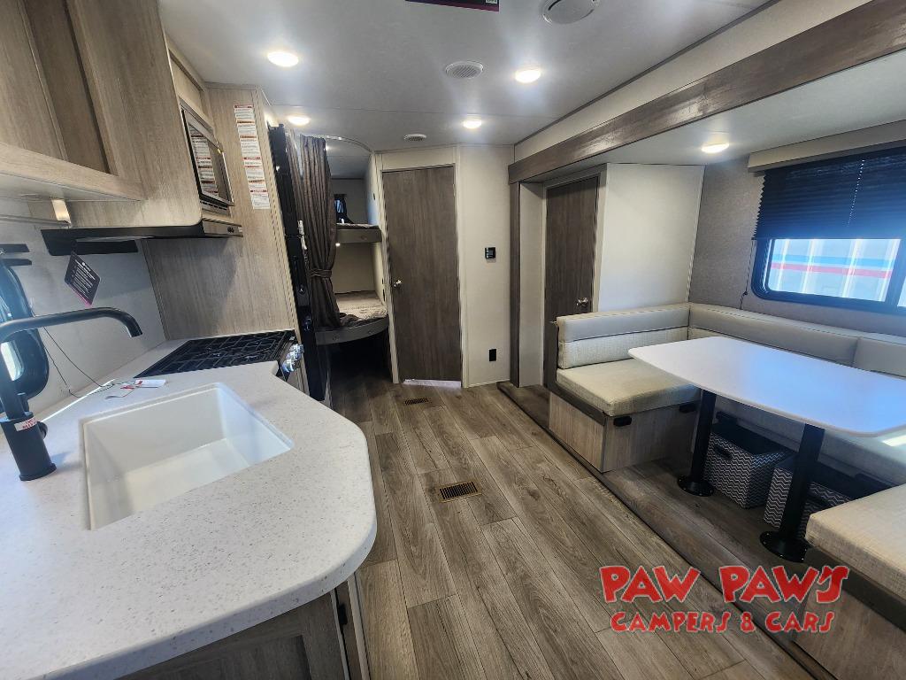 This is the perfect mid-size travel trailer for you and your family! The double-size bunks offer a comfortable sleeping space for the kids and you will have your own private sleeping space with a queen bed in the front bedroom. Freshen up each day in the rear corner bathroom with the tub/shower and a mirror to get ready each morning. You can prepare your best home cooked meals with the GE stainless three burner cooktop and GE stainless 10.7 cu. ft. 12V refrigerator, then enjoy them together at the u-shaped dinette. There is also a large pantry to store all your goods. Don't leave any of your outdoor gear behind either, thanks to the front pass-through storage area and the exterior outside storage area. You could even add the optional outside camper kitchen to grill the catch of the day on the pull out griddle!