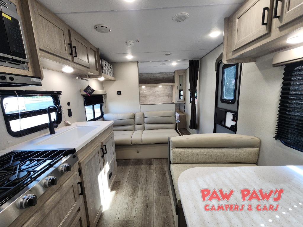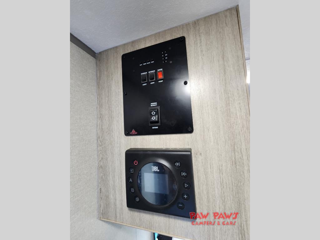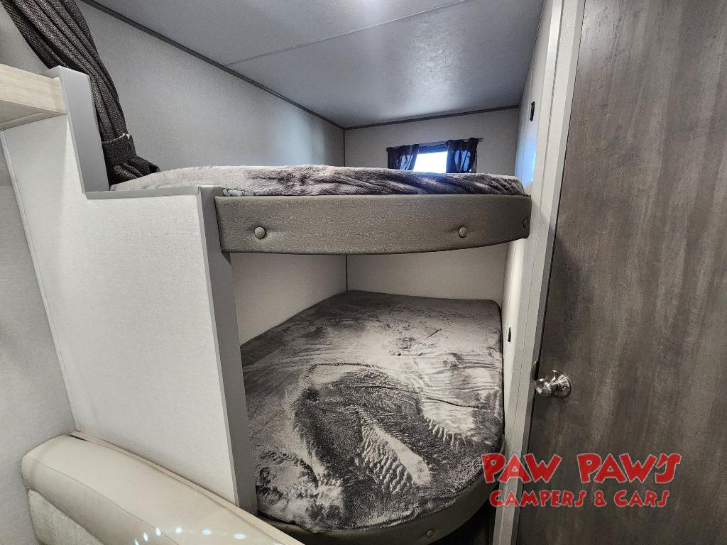 You get to choose to sit at the sofa or at the booth dinette when you are relaxing inside. There is a shelf with storage totes above the sofa for your belongings, and an additional overhead cabinet above the dinette for games. Maybe you want to rest on your own queen bed in the front semi-private bedroom before you make a meal in the kitchen or take a hike through the trails around the lake. The 15' electric awning with multi-color LED lights and a remote offers an outdoor living area where you can visit with other RVers. The kids will love their own double-size bunks that they can share with a friend or two, and the full bathroom is nearby as an added convenience.
