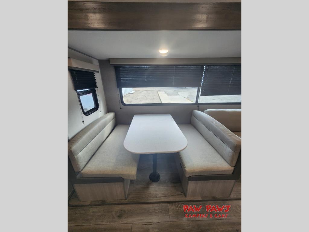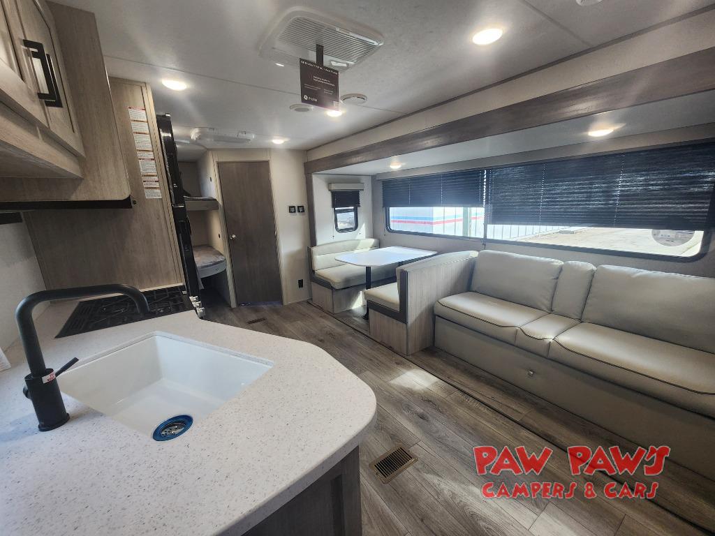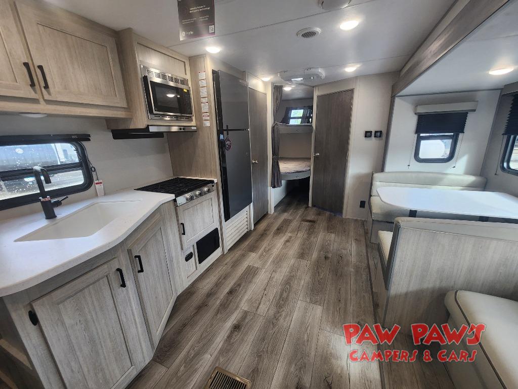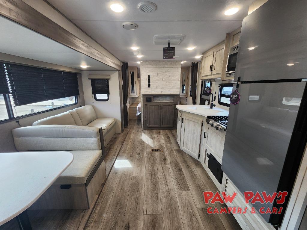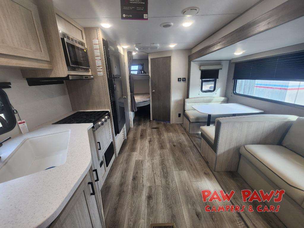 This is the perfect mid-size travel trailer for you and your family! The 46" x 74" double-size bunk beds with lower interior storage offer a comfortable sleeping space for the kids and you will have your own private sleeping space with the 60" x 74" queen bed in the front bedroom. Freshen up each morning in the rear corner bathroom with the tub/shower and a mirror to get ready each morning. You can prepare your best home cooked meals with the GE stainless three burner cooktop and GE stainless 10.7 cu. ft. 12V refrigerator, then enjoy them together at the booth dinette. The sofa is near the entertainment center for a relaxing movie night. Don't leave any of your outdoor gear behind either, thanks to the front pass-through storage area and the exterior outside storage area. You could even add the optional outside camper kitchen to grill the catch of the day on the pull out griddle!