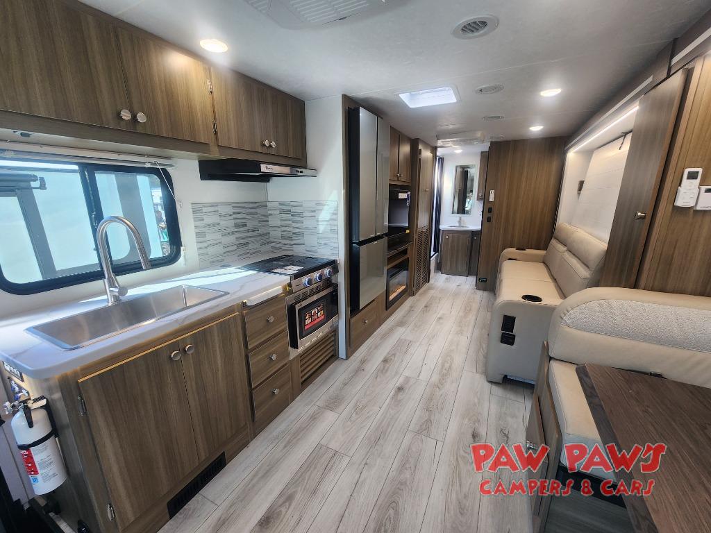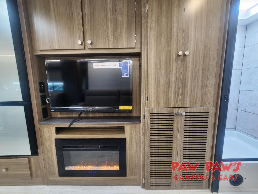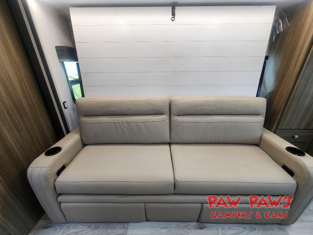 There is versatility found all throughout this motorhome! Starting with the 72" x 74" Murphy bed that offers a comfortable place to sleep and can convert into a 84" sofa to sit on during the day. Across from it is a 40" Smart TV with an optional fireplace below it plus optional washer and dryer ready. The 57" x 80" bunk over cab offers additional sleeping or storage space, and you could even transform the 44" x 82" U-shaped dinette into an extra sleeping space. The fully equipped kitchen has a pull-out countertop extension to make meal prepping easier and there is even an outside kitchen so you can cook dinner in the great outdoors!