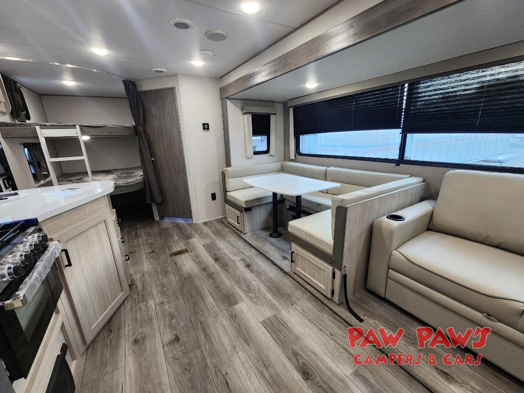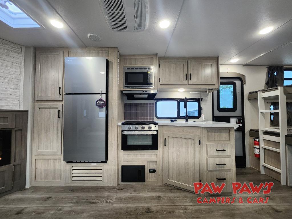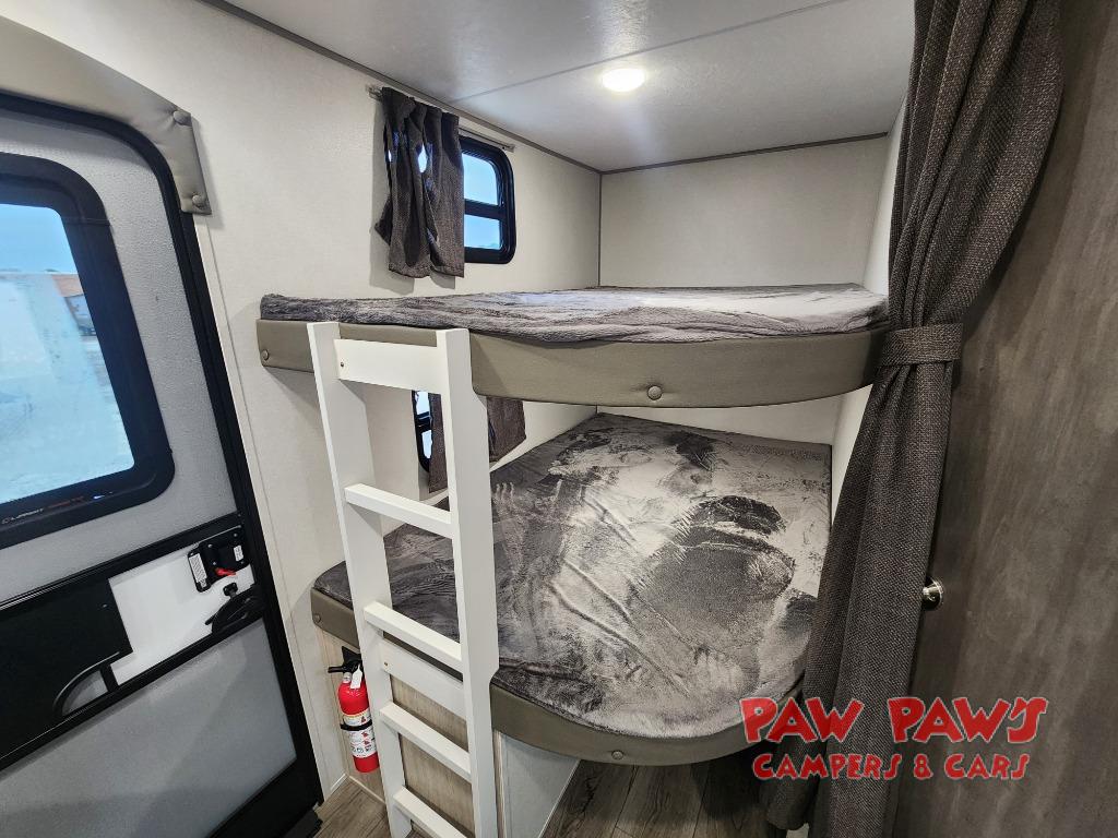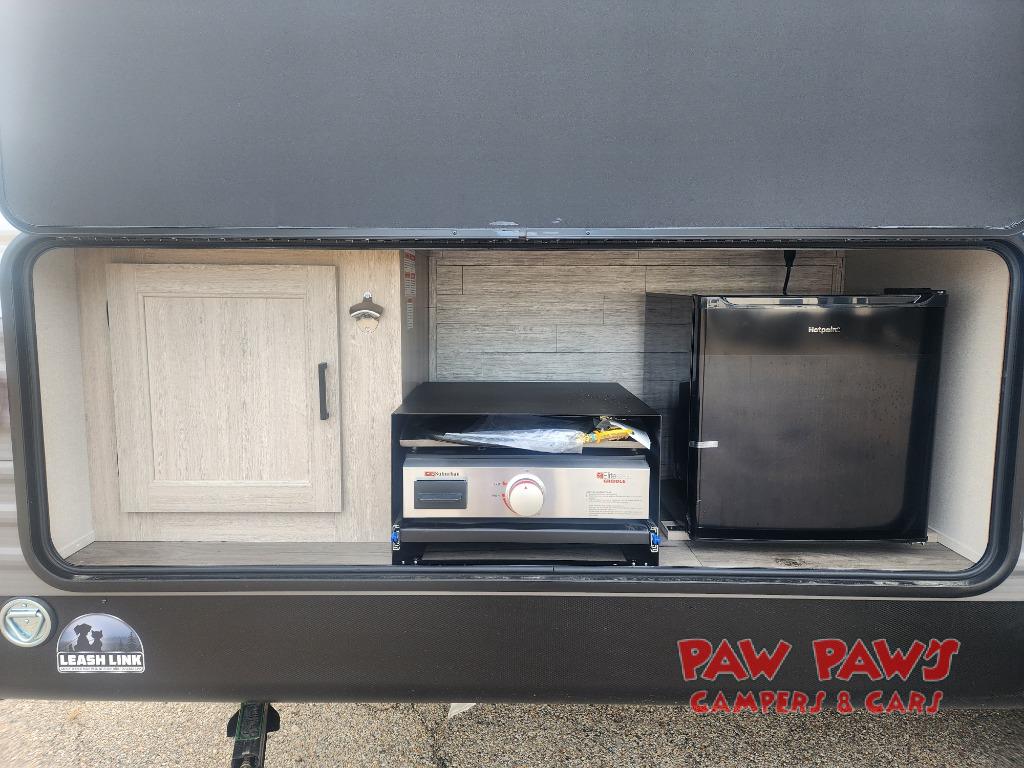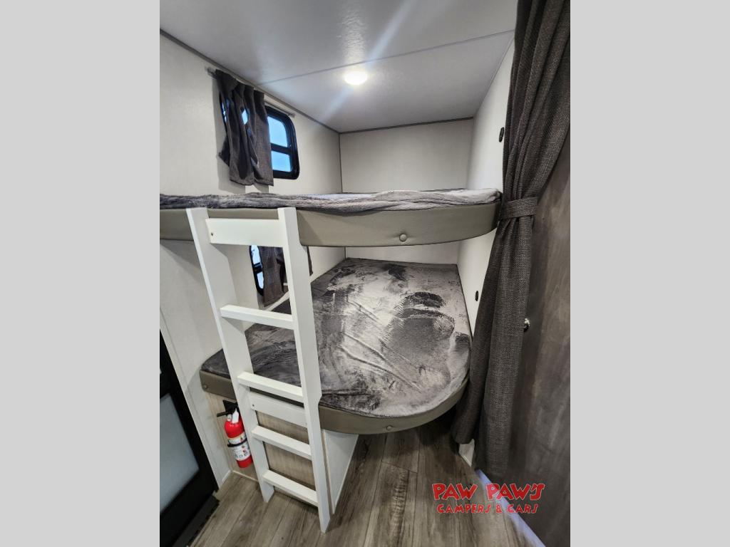 When you enjoy camping with your own accommodations and space for the whole crew, hitch this trailer up and head to the campgrounds! After loading everything easily thanks to the dual entry doors and all the interior and exterior storage, you will have no worries that you left anything behind. The electric awning is easy to set up, like the large slide out, and the awning offers multicolor LED lights to choose from by using the remote. When you are outside the cook might like to make a meal using the outside camper kitchen. The interior kitchen offers full amenities including a pantry, and everyone can enjoy the angled entertainment center. There are double-size bunks with a ladder for the kids and a walk-around queen bed for the owner to sleep on, plus furniture in the living area that doubles as additional sleeping space!