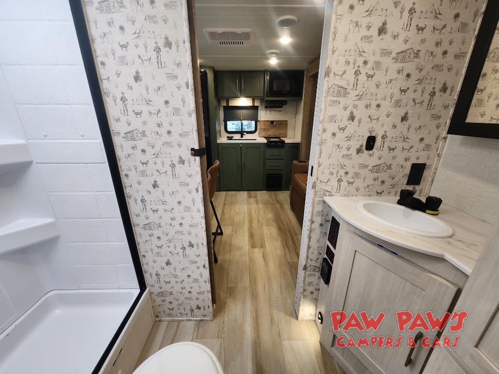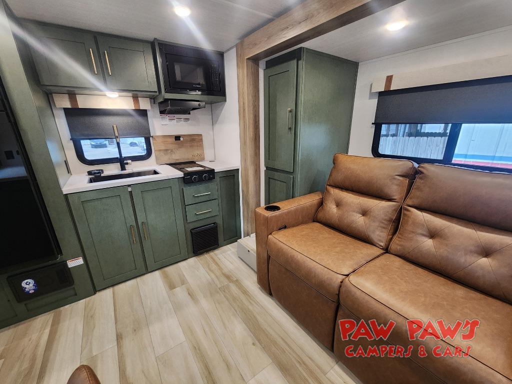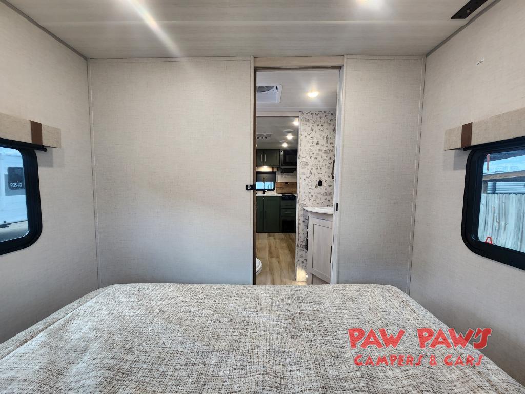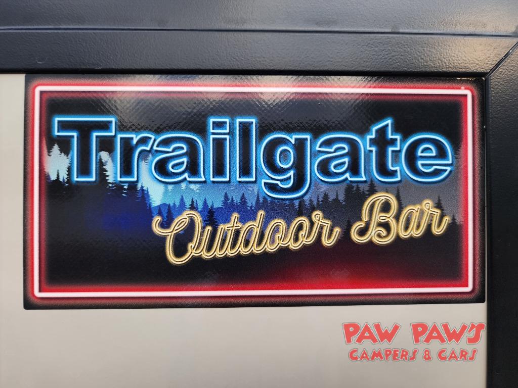 You'll love camping in this couple's trailer! There is a queen bed in the front bedroom, along with dual bedside wardrobes and overhead storage for clothes, books and more. And don't overlook the spacious walk-thru bath! Once you've made breakfast in the rear kitchen or on the outside kitchen, you can dine at the bar top with chairs and a flip-up window. There is also a Trailgate Outdoor Bar if you decide to dine outdoors!
