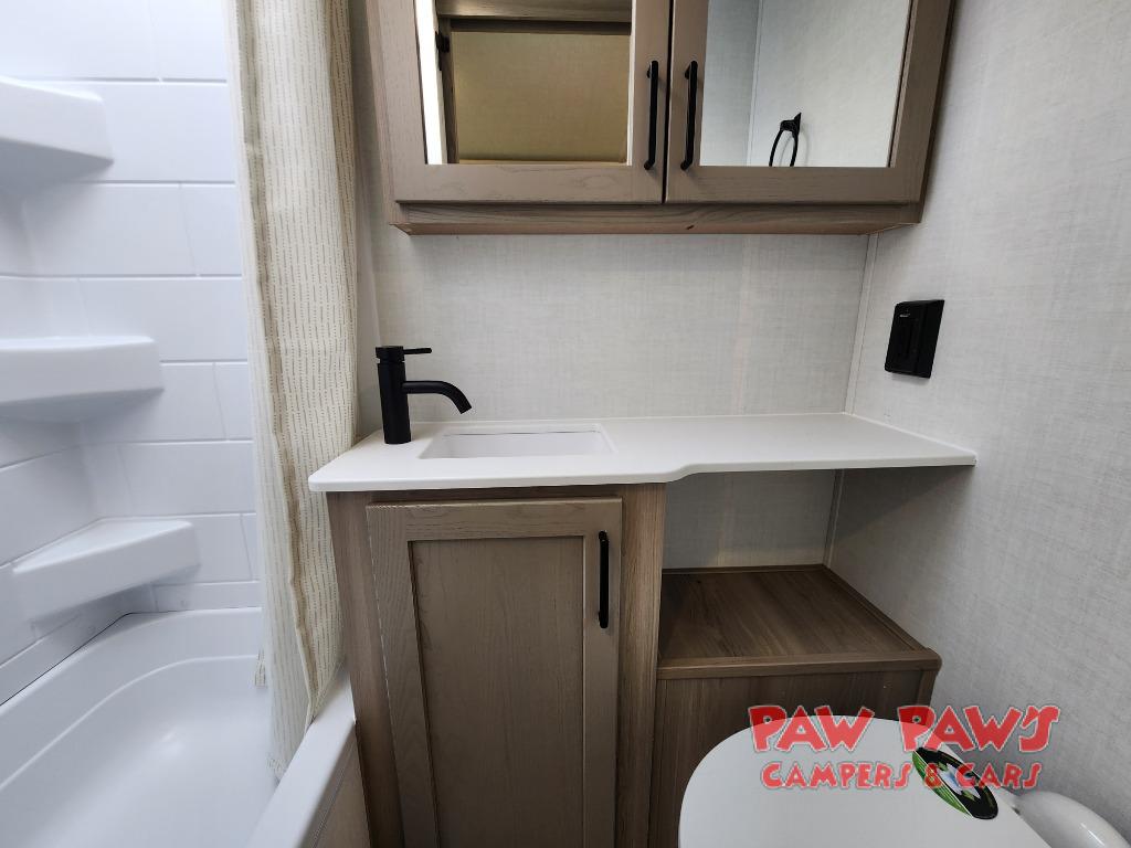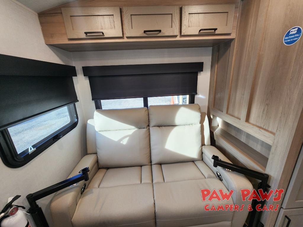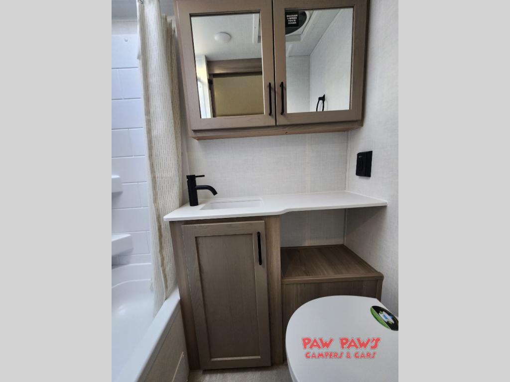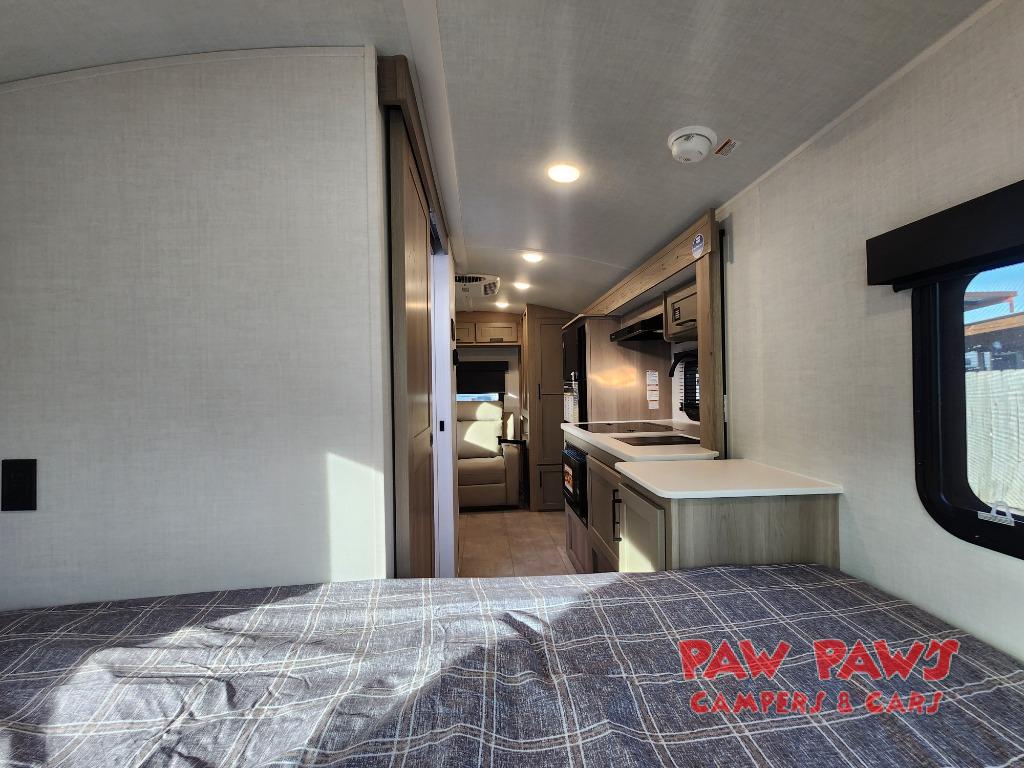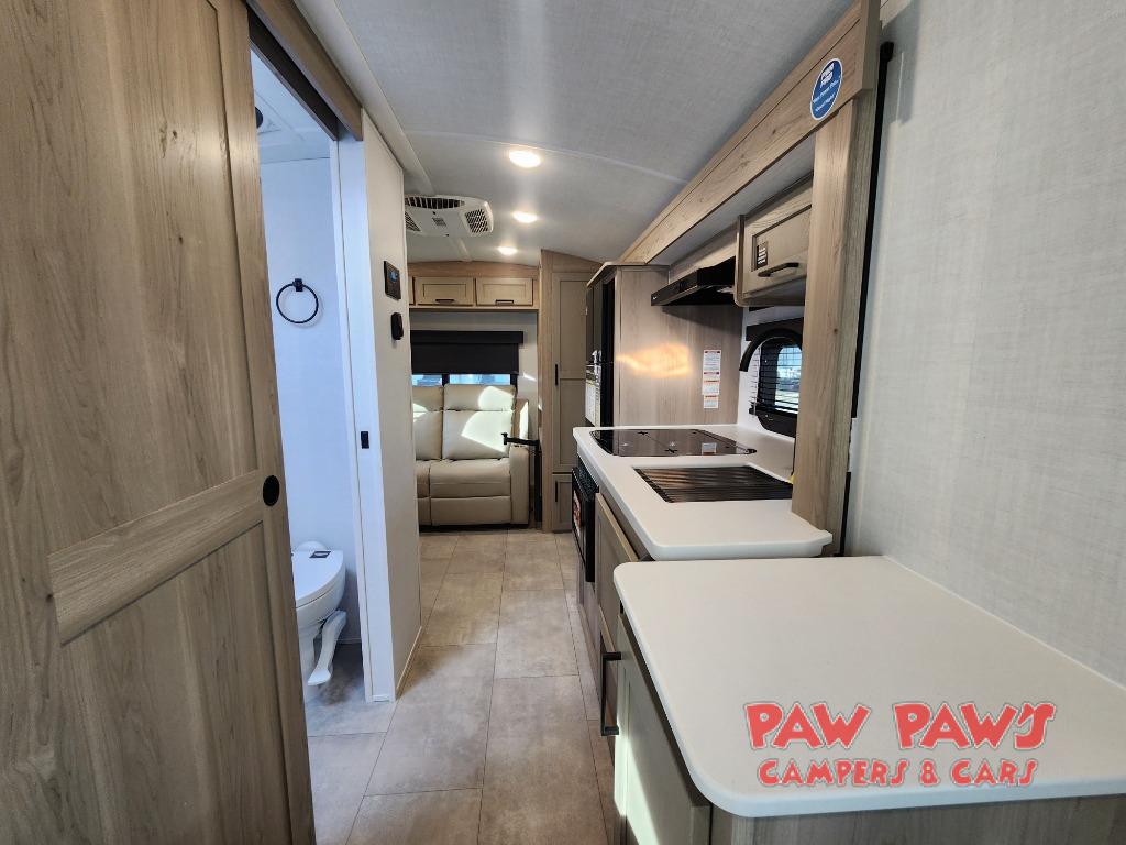 Start having unforgettable adventures with this amazing travel trailer! The queen-sized bed is the perfect spot to unwind and recharge after a day of exploring, offering a restful sleeping space that's sure to leave you feeling refreshed. The full bathroom has everything you need to refresh and rejuvenate in private. In the kitchen-living room combined area, you will find a three-burner cooktop for gourmet meals, a convection microwave for quick and easy cooking, and a spacious fridge to keep your ingredients fresh, plus overhead cabinets and a pantry/closet provide ample storage for cookware, dishes, and food. In addition, you can have endless evenings of amusement in the theater seat, which is the perfect spot to relax and enjoy your favorite shows or movies on the TV. On the outside, the exterior awning provides a shaded spot to enjoy the outdoors, while the pass-through storage offers plenty of room for gear, luggage, and equipment.