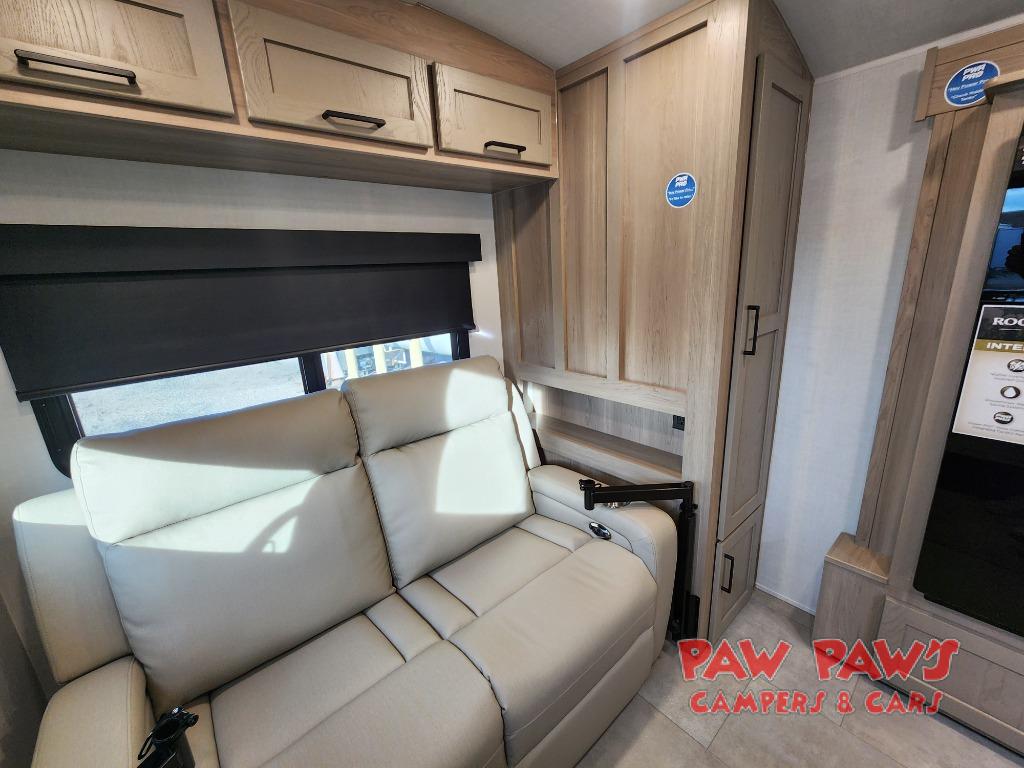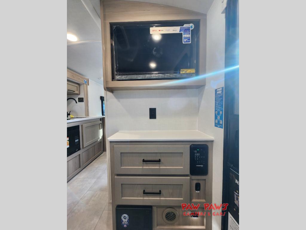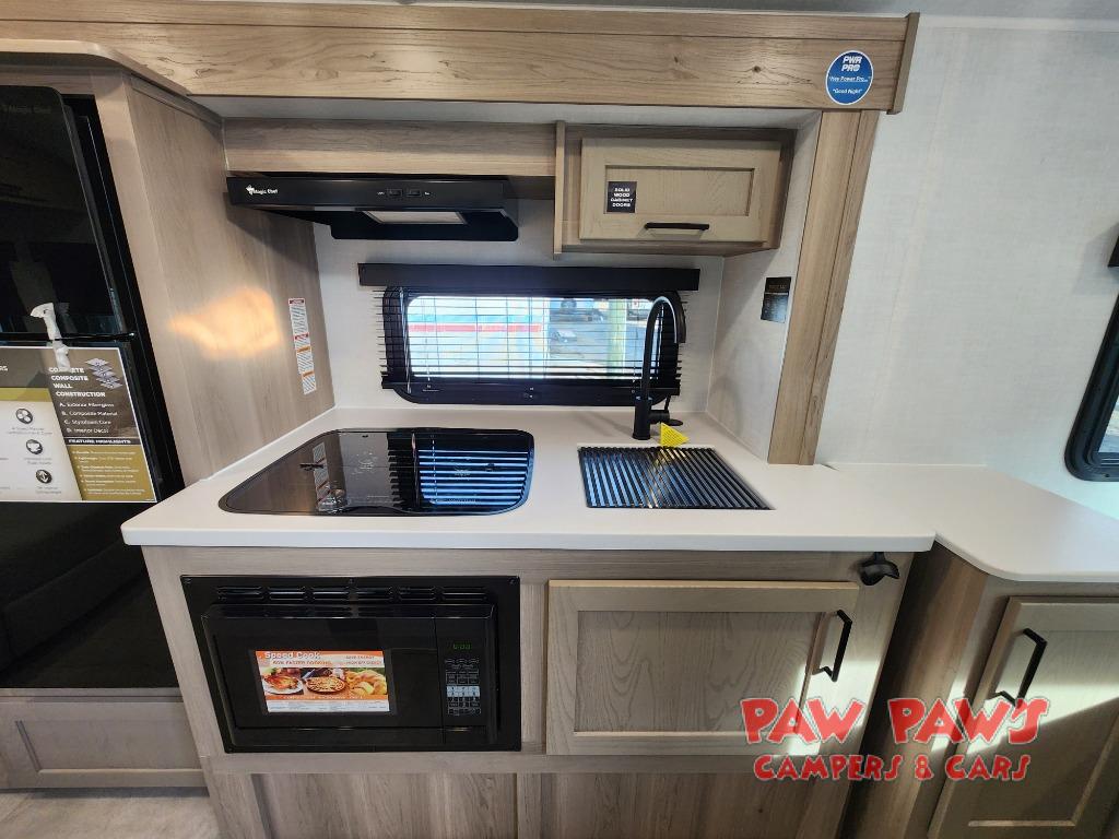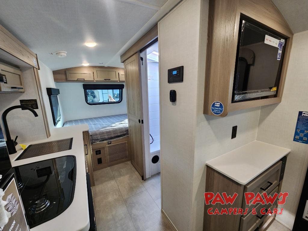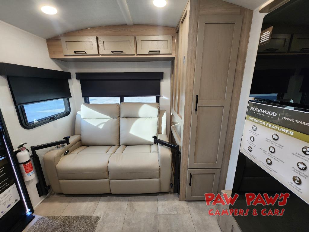 Start having unforgettable adventures with this amazing travel trailer! The queen-sized bed is the perfect spot to unwind and recharge after a day of exploring, offering a restful sleeping space that's sure to leave you feeling refreshed. The full bathroom has everything you need to refresh and rejuvenate in private. In the kitchen-living room combined area, you will find a three-burner cooktop for gourmet meals, a convection microwave for quick and easy cooking, and a spacious fridge to keep your ingredients fresh, plus overhead cabinets and a pantry/closet provide ample storage for cookware, dishes, and food. In addition, you can have endless evenings of amusement in the theater seat, which is the perfect spot to relax and enjoy your favorite shows or movies on the TV. On the outside, the exterior awning provides a shaded spot to enjoy the outdoors, while the pass-through storage offers plenty of room for gear, luggage, and equipment.