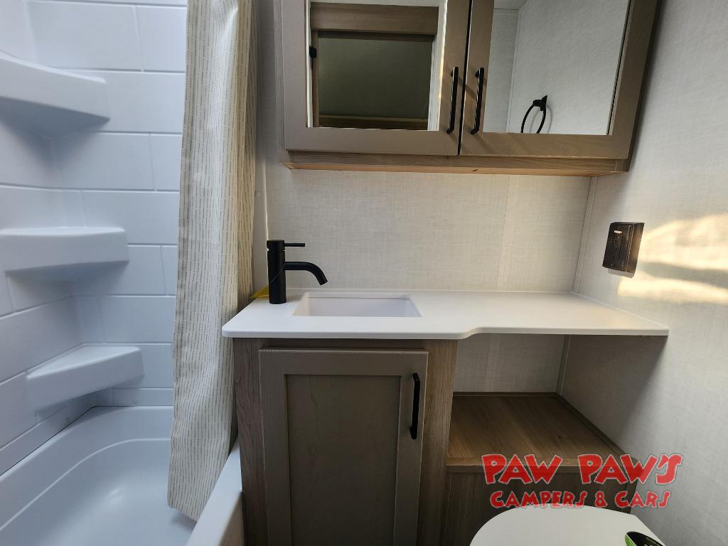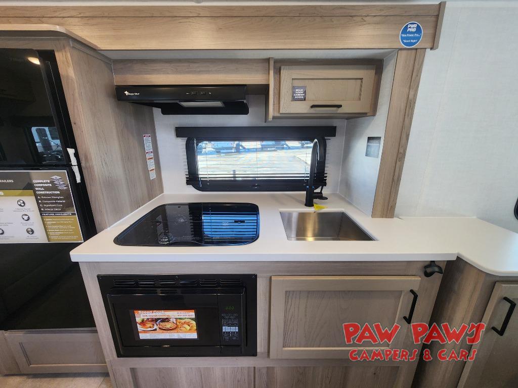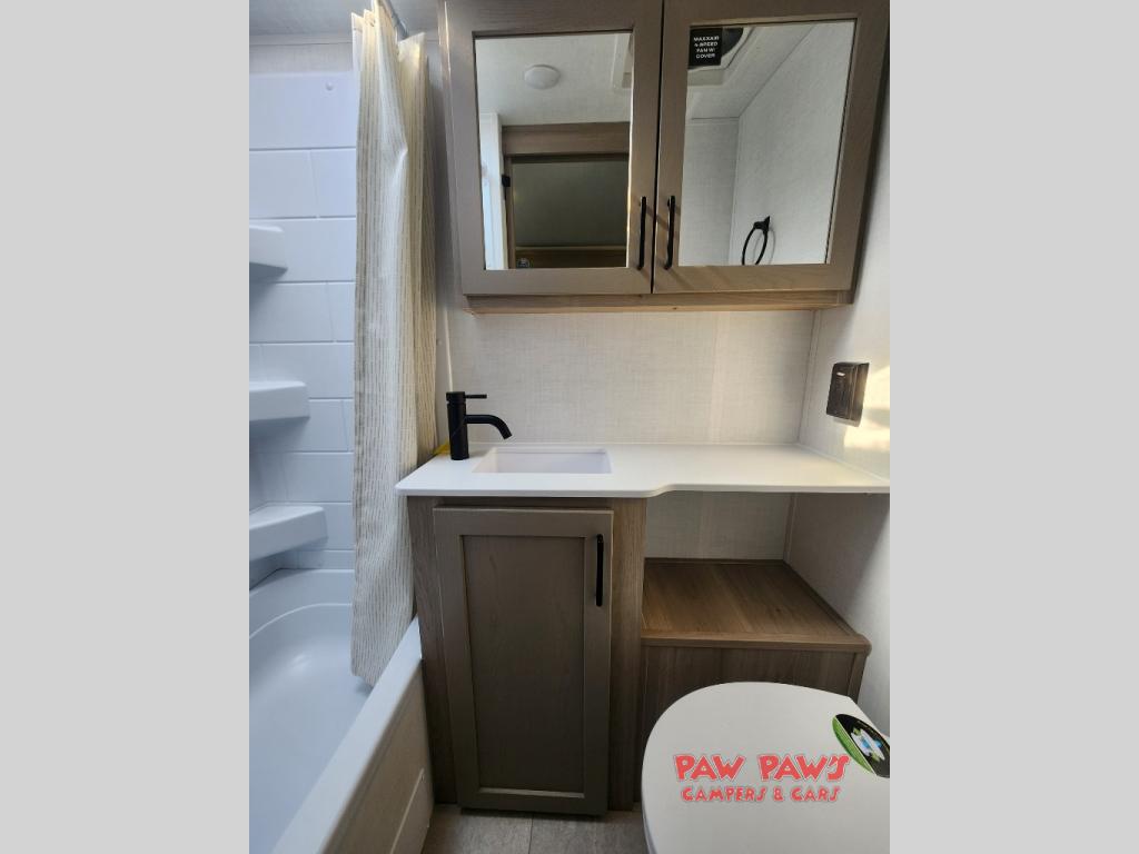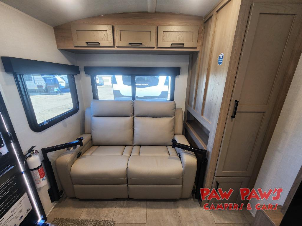 Start having unforgettable adventures with this amazing travel trailer! The queen-sized bed is the perfect spot to unwind and recharge after a day of exploring, offering a restful sleeping space that's sure to leave you feeling refreshed. The full bathroom has everything you need to refresh and rejuvenate in private. In the kitchen-living room combined area, you will find a three-burner cooktop for gourmet meals, a convection microwave for quick and easy cooking, and a spacious refrigerator to keep your ingredients fresh, plus overhead cabinets and a pantry/closet provide ample storage for cookware, dishes, and food. In addition, you can have endless evenings of amusement in the 55" theater seat, which is the perfect spot to relax and enjoy your favorite shows or movies on the TV. On the outside, the exterior awning provides a shaded spot to enjoy the outdoors, while the pass-through storage offers plenty of room for gear, luggage, and equipment.
