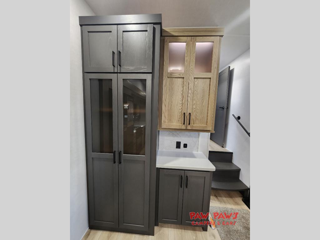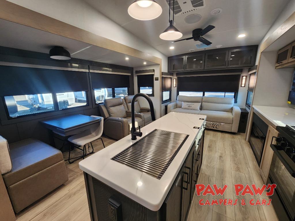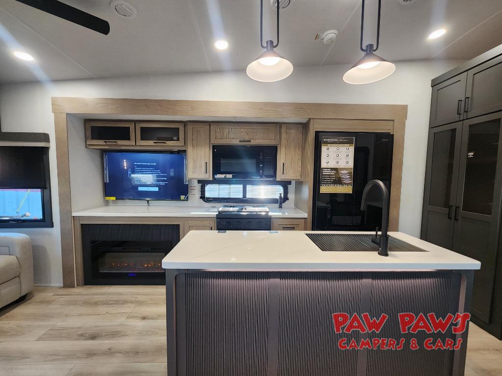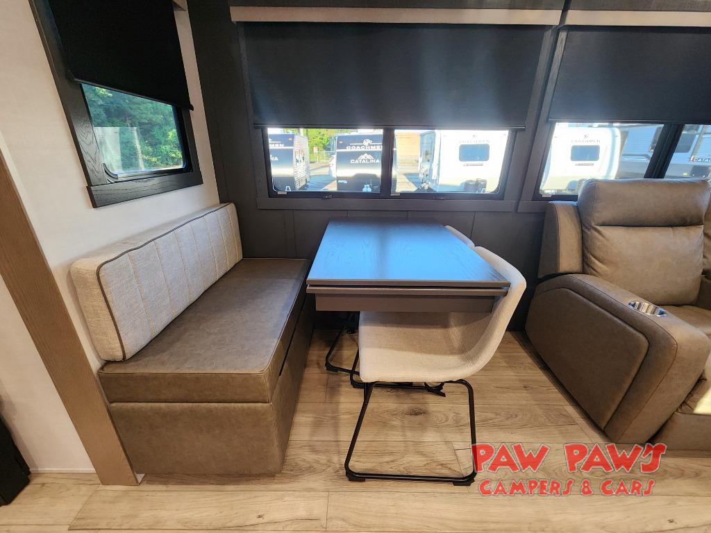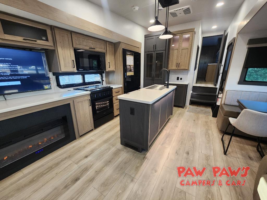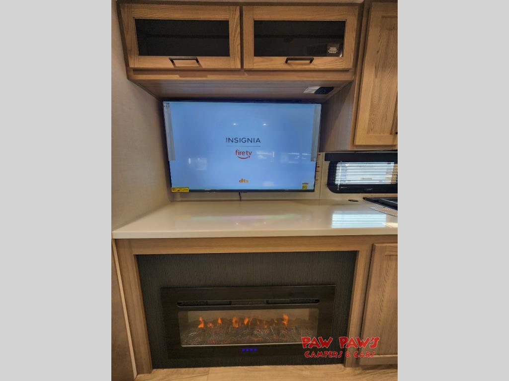 You can enjoy views from inside or outside each day once this RV is set up at the campgrounds! The large windows in the furniture slide and the windows throughout allow you to take in the scenery, and the three slide outs give you a spacious main living and kitchen area as well as front bedroom. You will find lots of seating for guests on the hide-a-bed sofa in the rear, on the theater seats and the table, chairs and bench in the slide. The cook will love the 12V refrigerator and large pantry to store food, and everyone can enjoy the Smart TV and fireplace when visiting and relaxing. The front bedroom offers a king bed slide, a front wardrobe, plus washer and dryer prep if you choose to add those appliances.