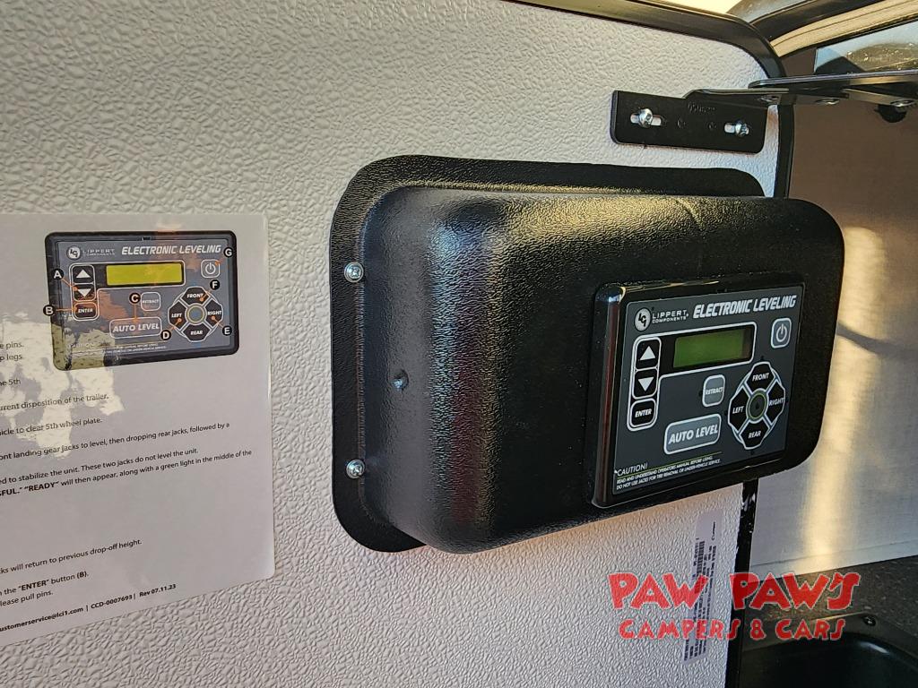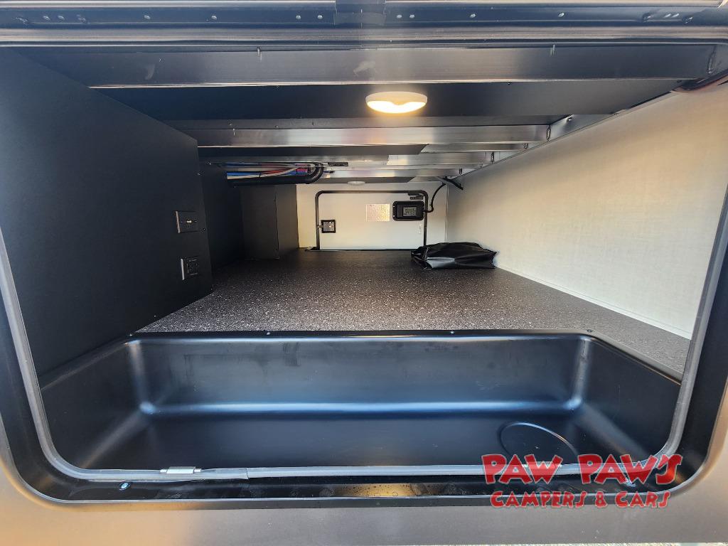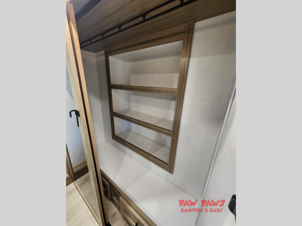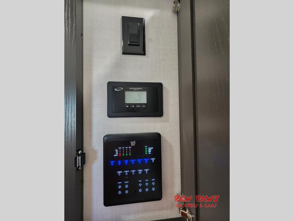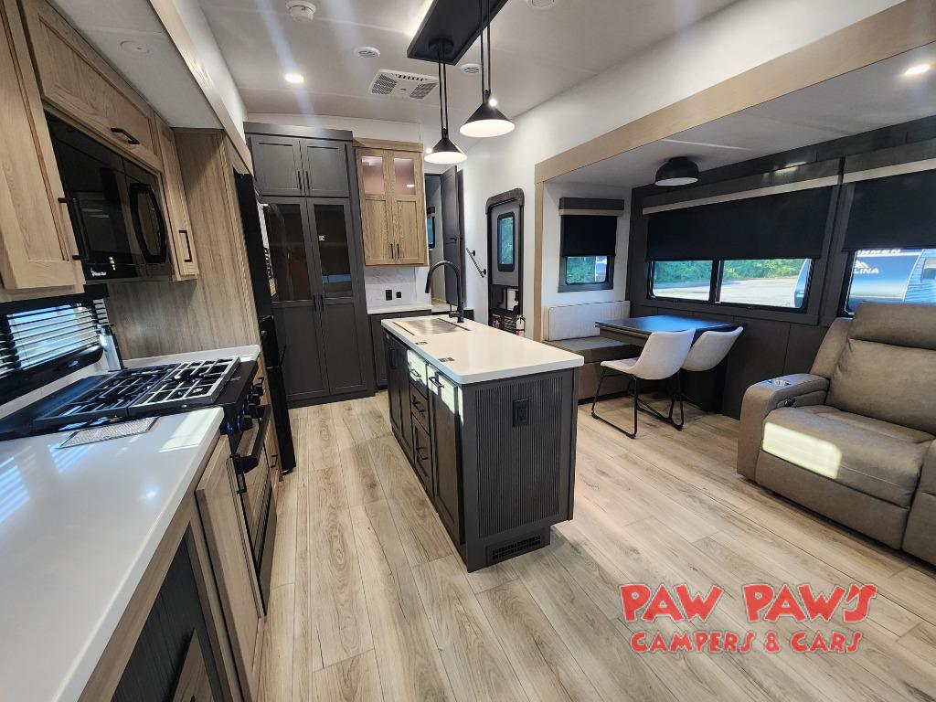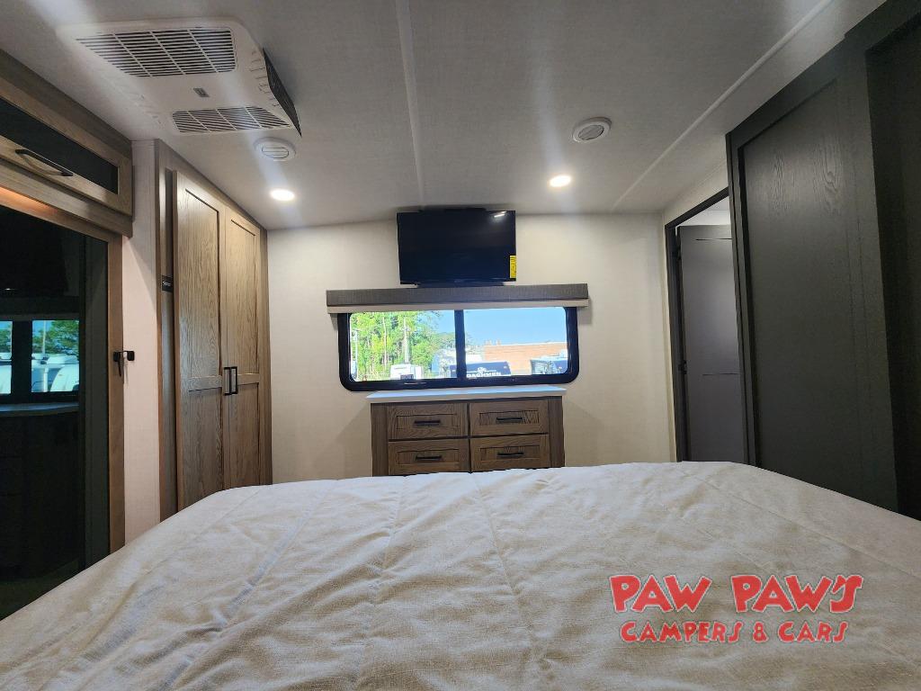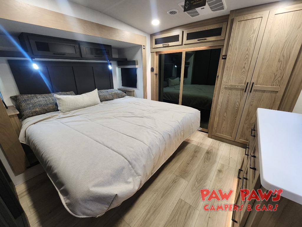 You can enjoy views from inside or outside each day once this RV is set up at the campgrounds! The large windows in the furniture slide and the windows throughout allow you to take in the scenery, and the three slide outs give you a spacious main living and kitchen area as well as front bedroom. You will find lots of seating for guests on the hide-a-bed sofa in the rear, on the theater seats and the table, chairs and bench in the slide. The cook will love the 12V refrigerator and large pantry to store food, and everyone can enjoy the Smart TV and fireplace when visiting and relaxing. The front bedroom offers a king bed slide, a front wardrobe, plus washer and dryer prep if you choose to add those appliances.