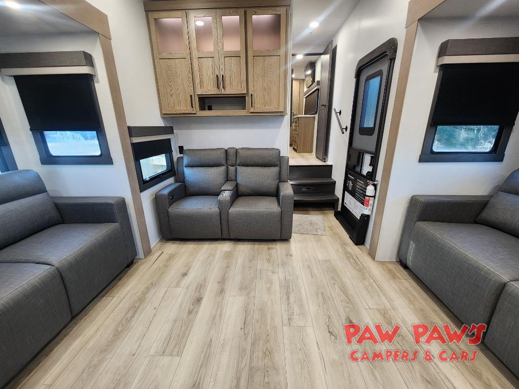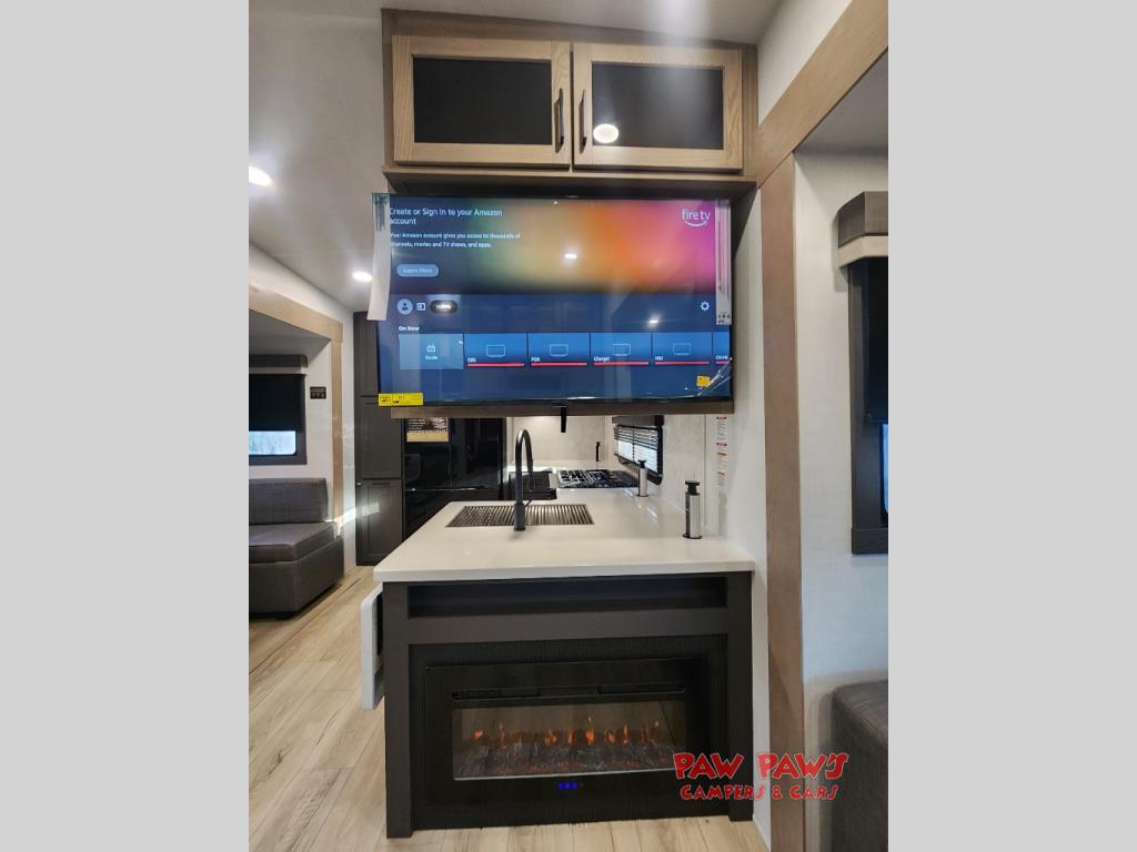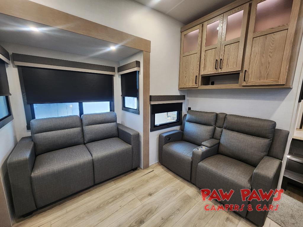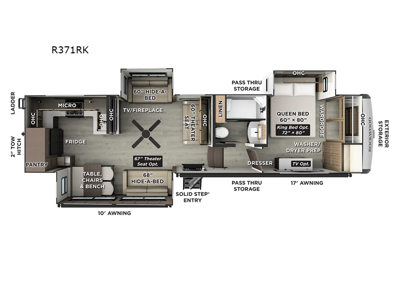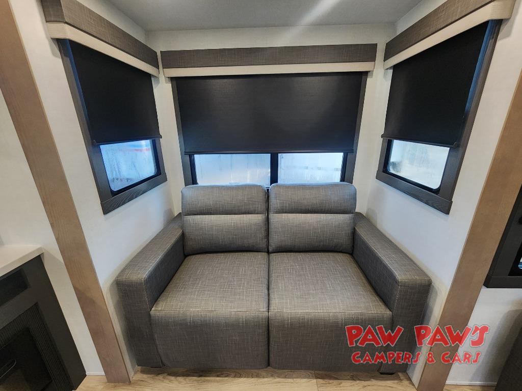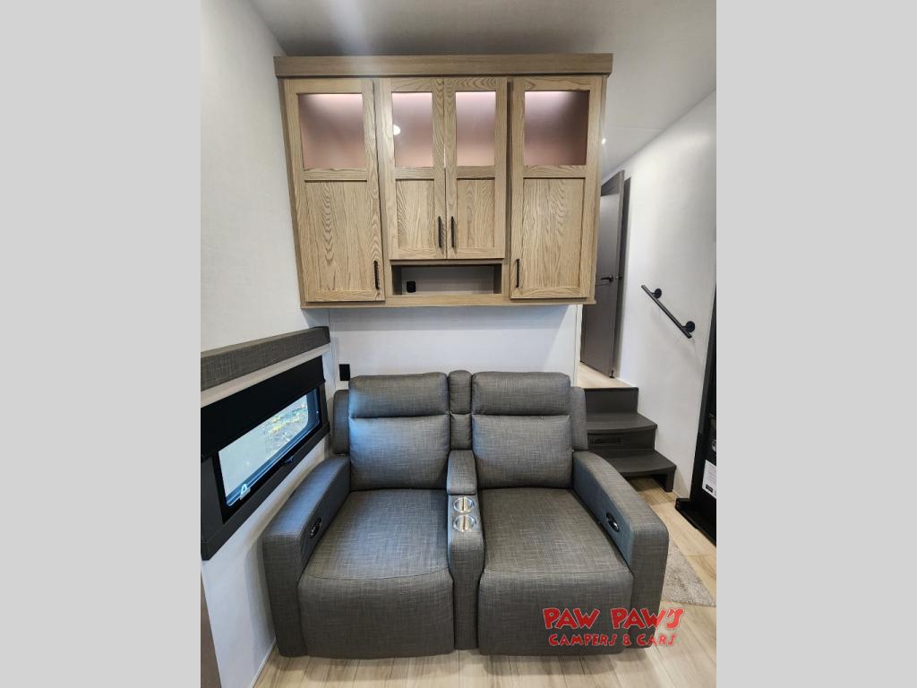 This rear kitchen fifth wheel is the perfect coach for a couple, or one that likes to entertain overnight guests. With two hide-a-bed sofas, one 60" and the other 68", you will have plenty of room for taking along extra family or friends on your adventures. The kitchen is tucked in the back and features a u-shaped counter area, and there is a table, chairs & bench within the slide that houses the 68" HAB sofa. You could also choose the optional theater seating in place of this hide-a-bed if you don't need the extra sleeping space. There is also a 60" theater seat for movie night opposite the TV/fireplace. Head up the steps to your private front bedroom with slide out queen bed, dresser, and large wardrobe with washer and dryer prep. The bathroom is at the top of the steps up and includes a large shower, linen cabinet and sink, plus a toilet. This unit also features ample storage on the outside as well as on the interior.