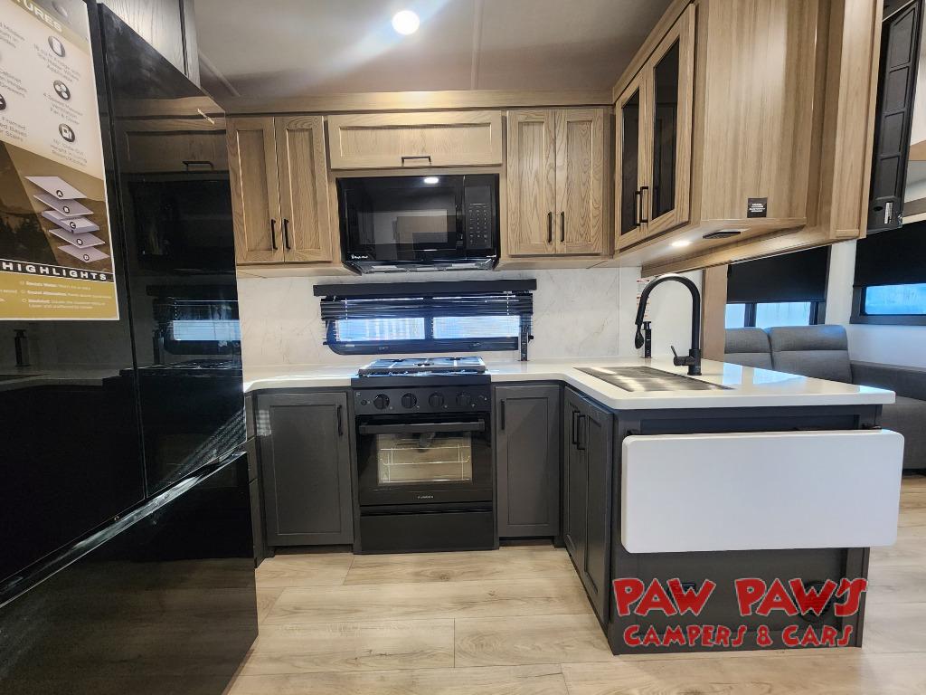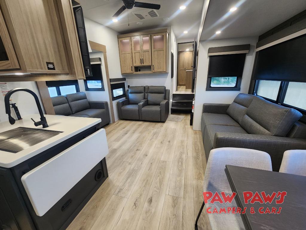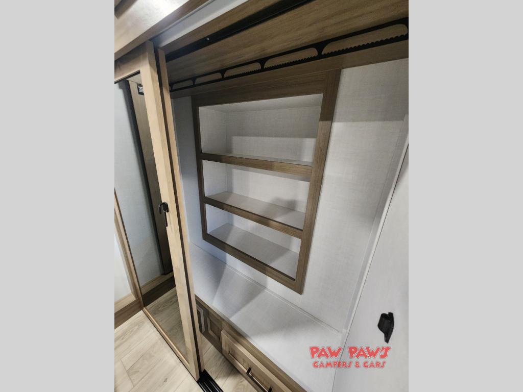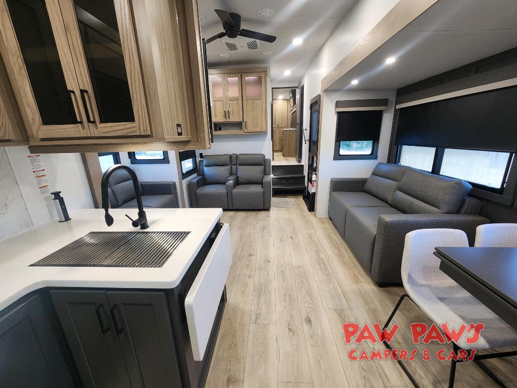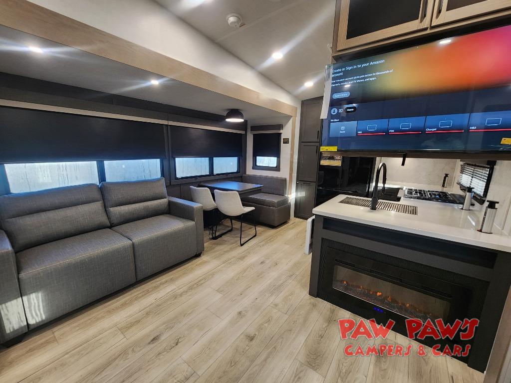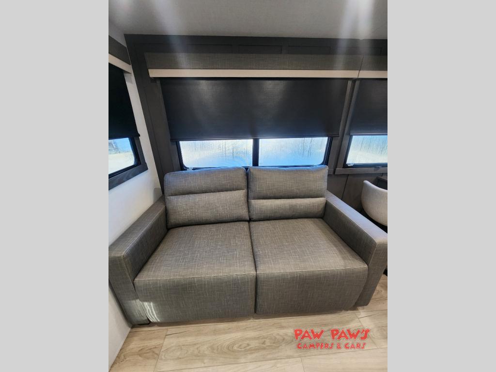 This rear kitchen fifth wheel is the perfect coach for a couple, or one that likes to entertain overnight guests. With two hide-a-bed sofas, one 60" and the other 68", you will have plenty of room for taking along extra family or friends on your adventures. The kitchen is tucked in the back and features a u-shaped counter area, and there is a table, chairs & bench within the slide that houses the 68" HAB sofa. You could also choose the optional theater seating in place of this hide-a-bed if you don't need the extra sleeping space. There is also a 60" theater seat for movie night opposite the TV/fireplace. Head up the steps to your private front bedroom with slide out queen bed, dresser, and large wardrobe with washer and dryer prep. The bathroom is at the top of the steps up and includes a large shower, linen cabinet and sink, plus a toilet. This unit also features ample storage on the outside as well as on the interior.