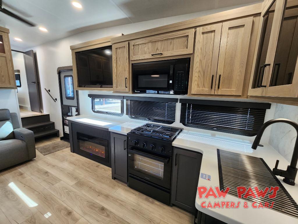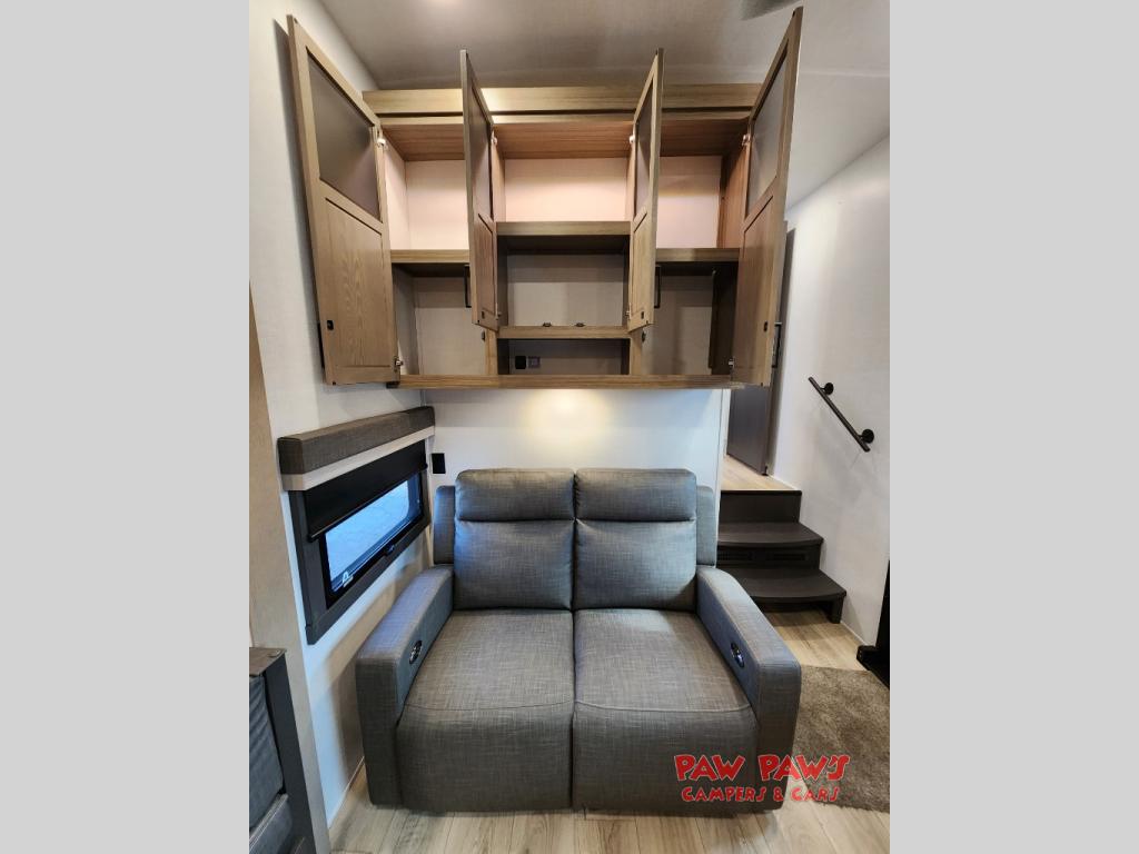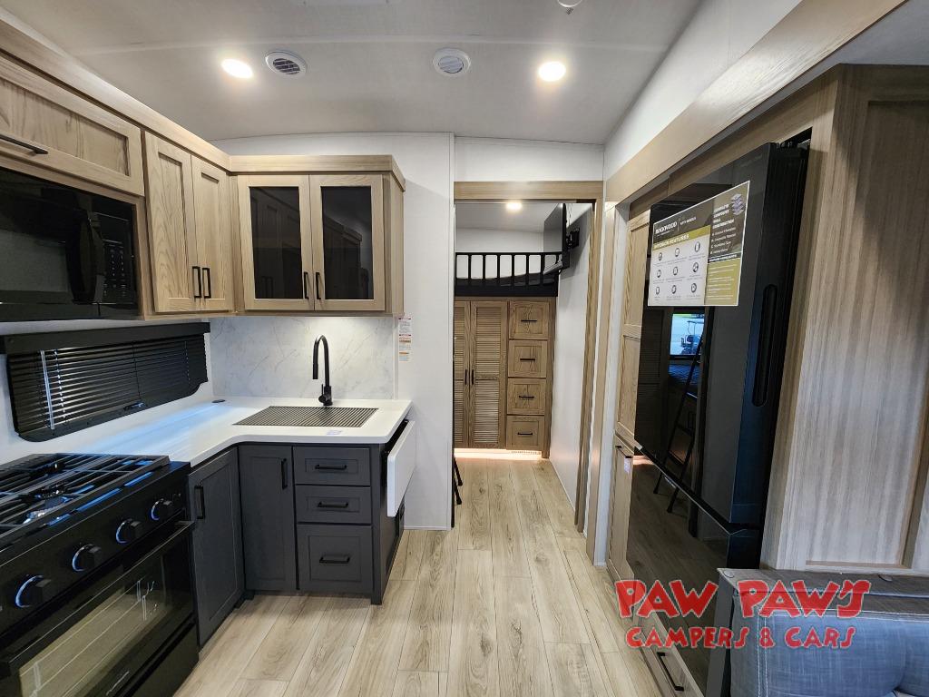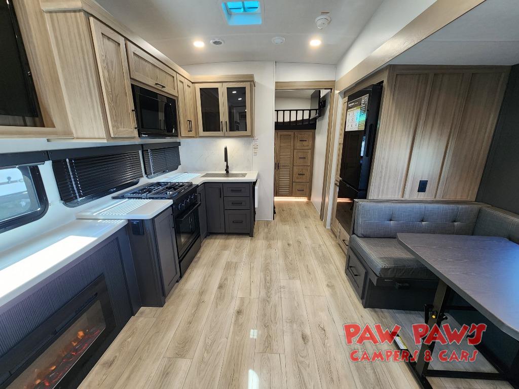Looking to travel with your family and friends and need lots of space for everyone? This fifth wheel offers a front private bedroom with a queen bed, a spacious wardrobe, and a TV option for shows in bed. On the opposite side of the unit there is a private bunkhouse with triple bunks, plus washer and dryer prep. The main living and kitchen area includes a slide out which offers a king U-shaped dinette to dine at, play games with friends, and provides sleeping if needed, plus a 12V refrigerator and a pantry. There is also a 55" theater seat here for more comfort. The cook will have full amenities indoors plus an outside kitchen when the weather is nice. There are also two power awnings, Solid Entry steps, a rear 2" towing hitch, and more exterior conveniences!
