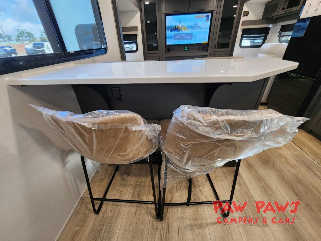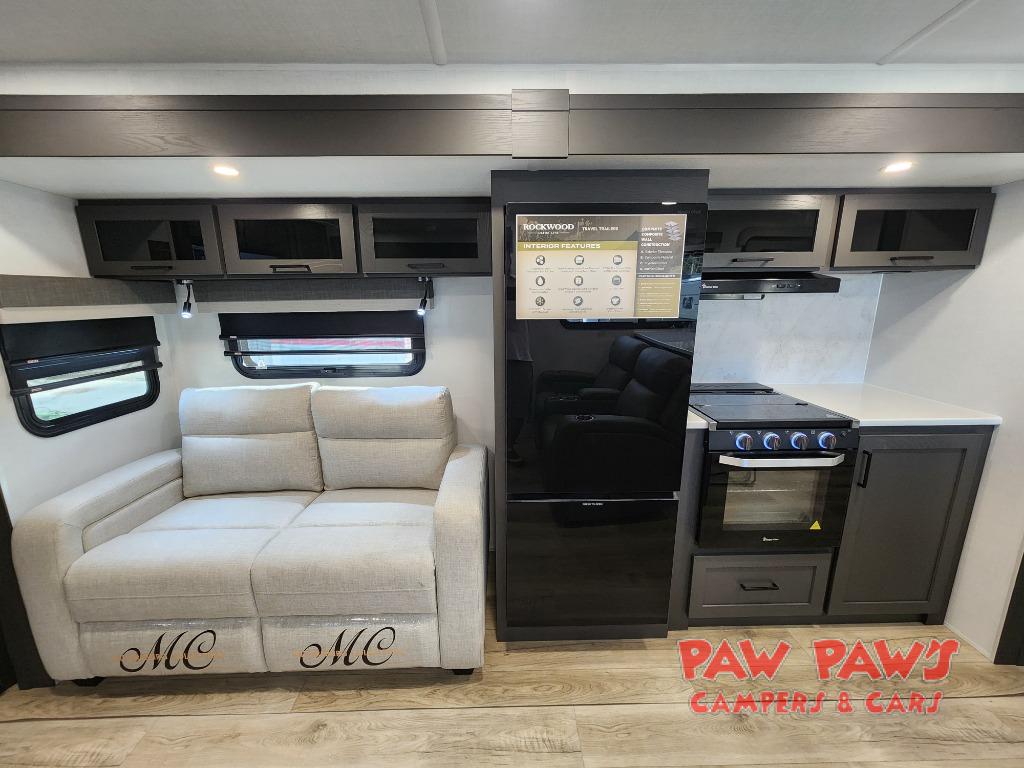 With dual slides at the rear, this Rockwood Ultra Lite travel trailer offers a spacious living area for entertaining or relaxing. Gather the whole gang for movie night with three cozy seating options facing the TV and fireplace, including two 60" hide-a-bed sofas and a 60" theater seat. A table with bar stools adds more seating and doubles as a dining spot, overlooking the TV. Overhead storage throughout the living area and kitchen provides plenty of room to stow away groceries, dishes, books, and board games, keeping everything organized. Let´s not forget the full bathroom with a large shower offers a comfortable place to refresh, while the front bedroom features a queen bed and two wardrobes for storing all your essentials.