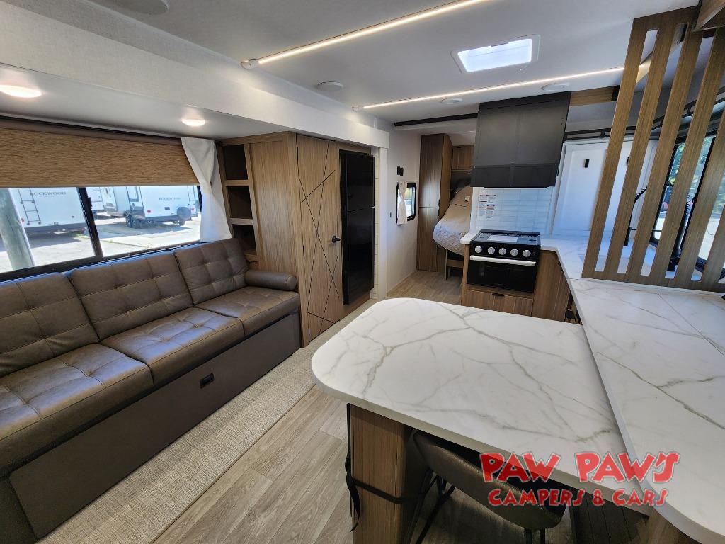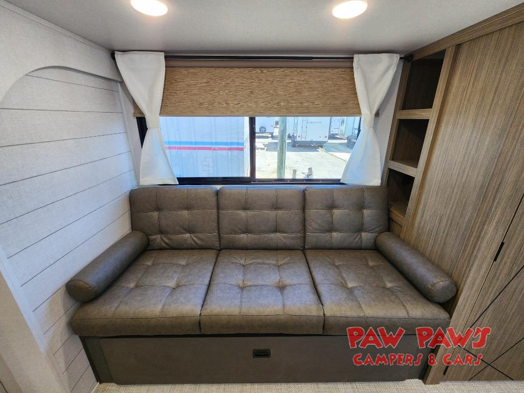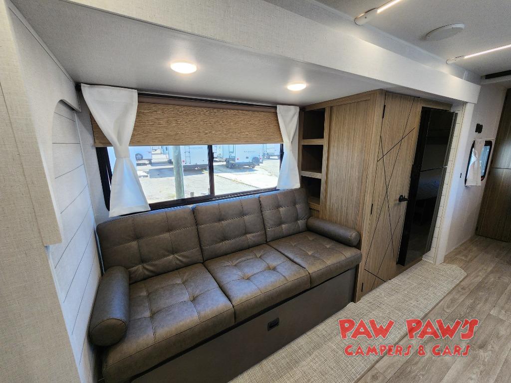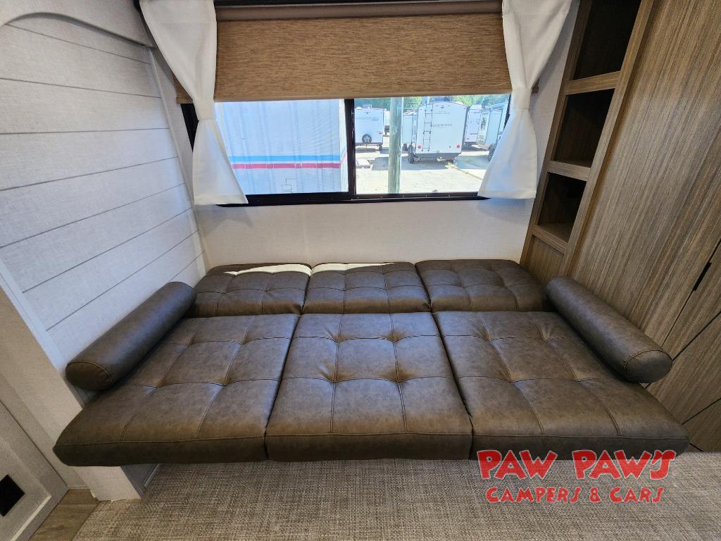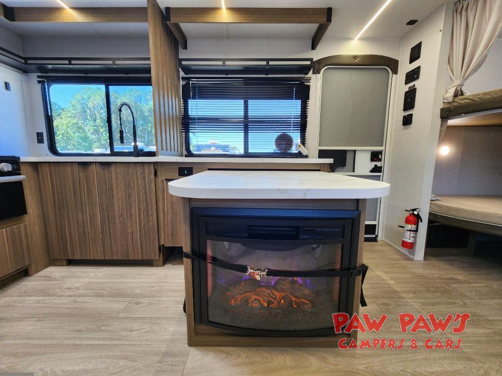 You can enjoy at-home comforts wherever you decide to camp in this travel trailer. The custom king bed with Versa Tilt includes dual shelves and a wardrobe so you can keep your space tidy. If you have a guest or two little ones, they can sleep on the jackknife sofa within the large slide out or on the double-size bunks right next to the full bath. Once you've made breakfast in the fully equipped kitchen, you can utilize the pull-out table to dine at. There is also a fireplace below the table, which will be perfect for cozy evenings indoors.