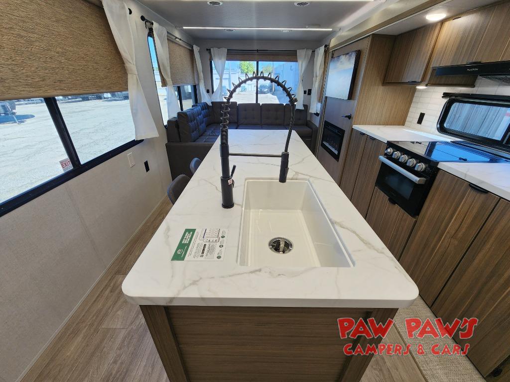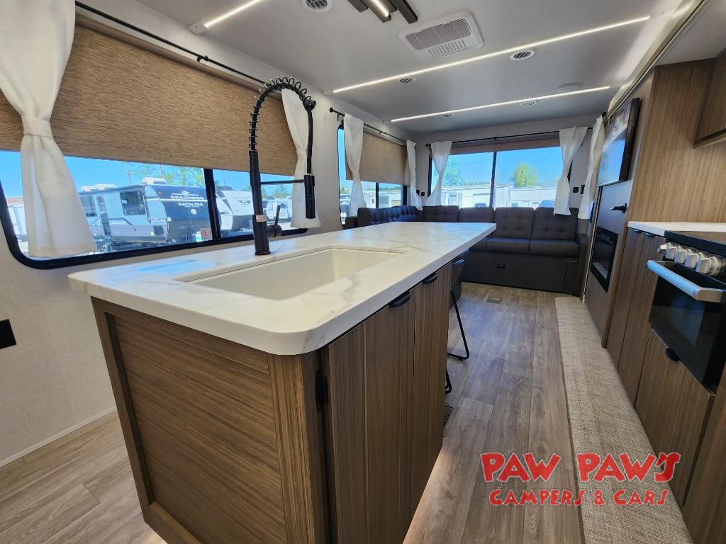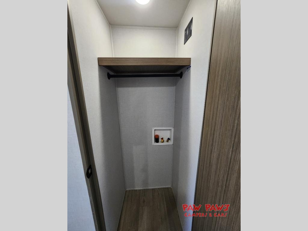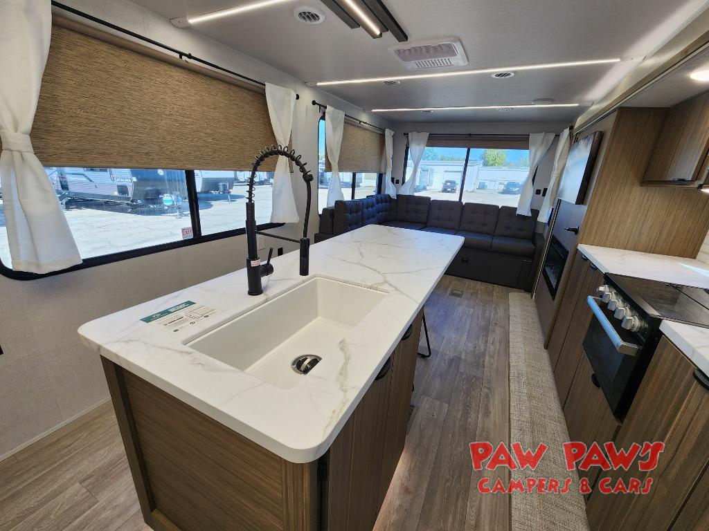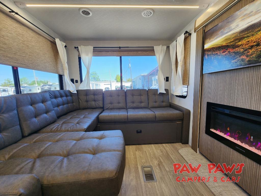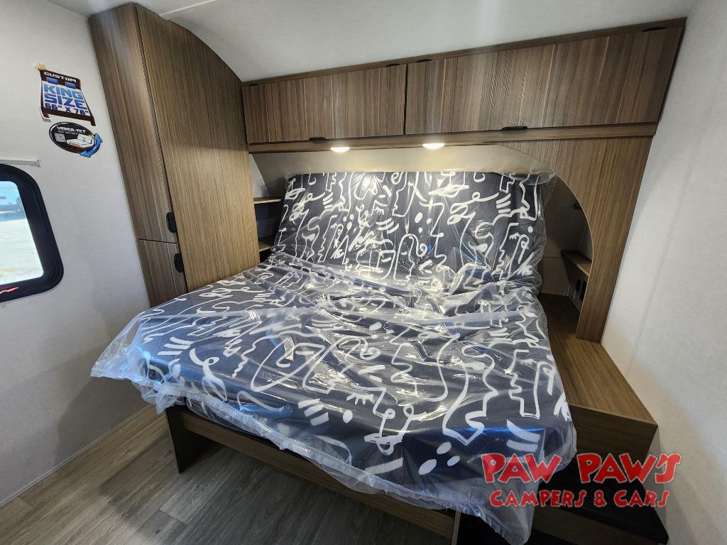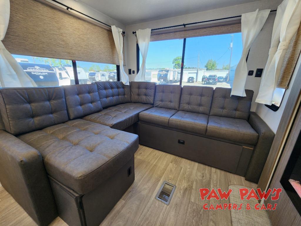 The large slide out in this travel trailer will give your crew more space to relax on the L-shaped sectional sofa, cook and dine at the kitchen island, and grab snacks from the hidden storage behind the hinged entertainment center! The full bath will let you clean up daily without having to use the camp's facilities, and the front private bedroom includes a custom king bed with Versa Tilt so you can read in bed at night. There is also a wardrobe and overhead cabinet plus a closet with washer and dryer prep if you choose to add these appliances.