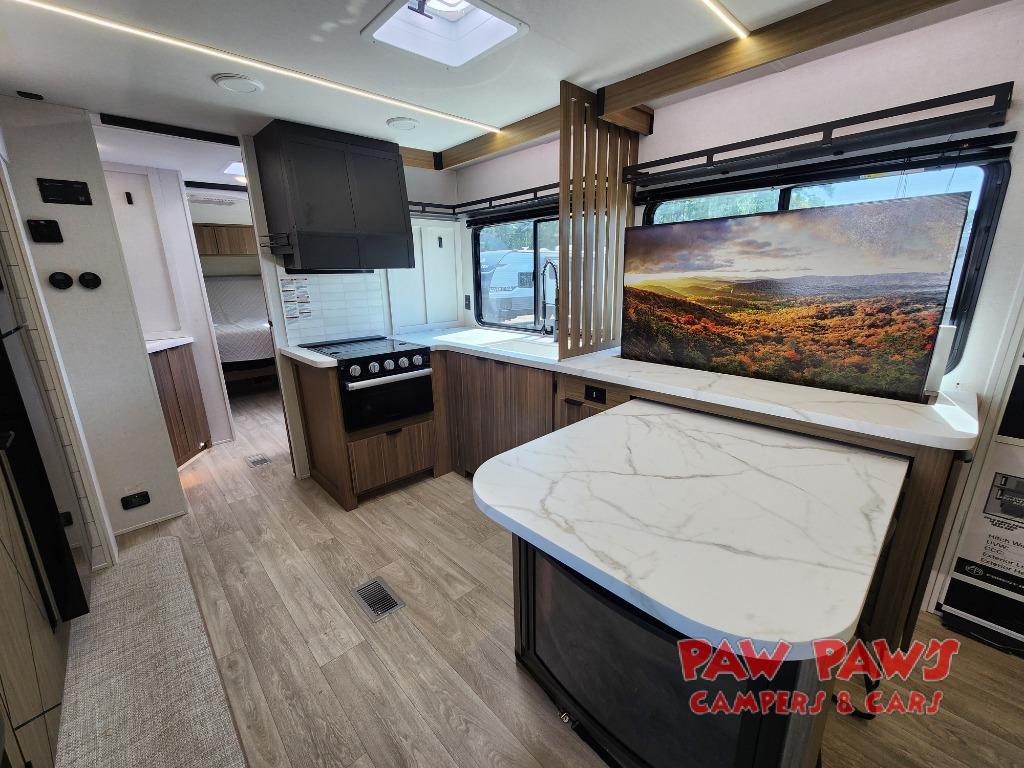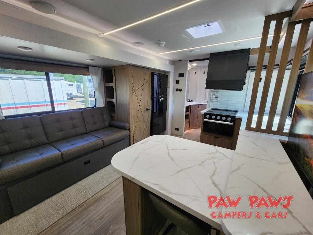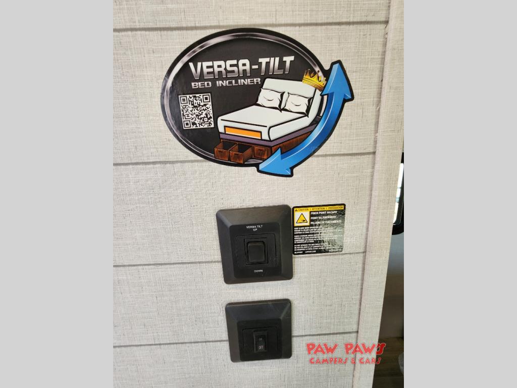 Everyone will enjoy having their own space in this travel trailer thanks to the front master bedroom and the rear bunkhouse. The bunkhouse includes a wall to separate the Versa bunk and fold-down desk on one side and a Versa sofa on the other, perfect for older kids or guests. You'll have the custom king bed with Versa Tilt all to yourselves, and the walk-thru bath will be easily accessible for everyone. In the combined kitchen and living room, a jackknife sofa slide sits across from the fireplace/entertainment center, and there is a pull-out table here so you can dine together.
