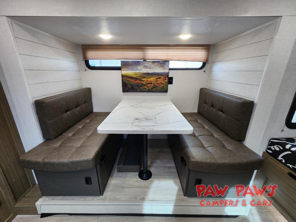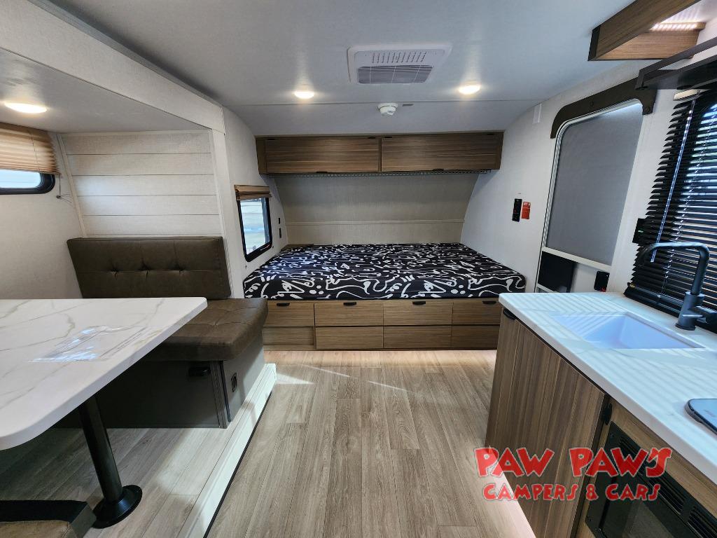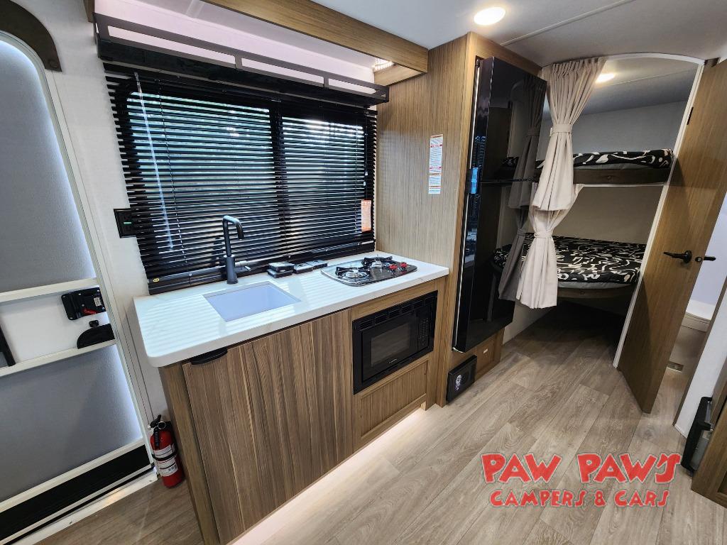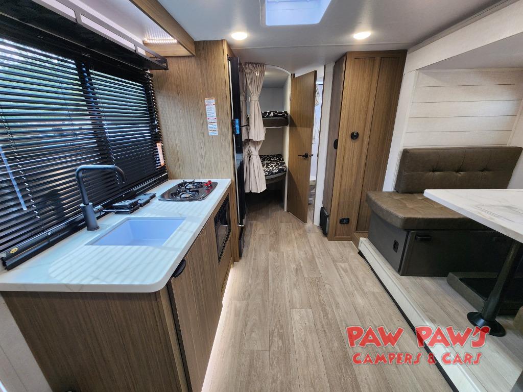 It will be so easy to enjoy time spent in this travel trailer for seven. The front queen bed provides a great night's rest, and there is an overhead cabinet to keep your things organized. Your guests or little ones can claim the double-size bunks for themselves, and there is a full bath adjacent to the bunks for easy nighttime use. A two-burner cooktop in the kitchen will let you make meals for your crew, and a refrigerator keeps leftovers fresh. You can dine at the booth dinette within the slide out or take your plate outdoors to sit under the 15' power awning.