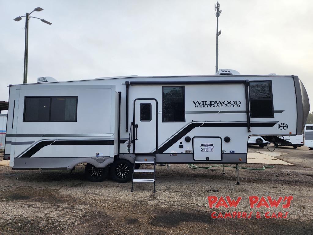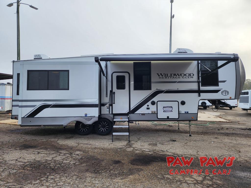 With any Wildwood Heritage Glen fifth wheel by Forest River, the quality construction, attention to detail and design along with a bright and welcoming interior allows you to relax in comfort. You'll love the high-end solid surface countertops included in the Elevated Value Package, along with a JBL sound system, full-length barreled ceilings, and an ultimate interior lighting upgrade. The included Expedition Package features an Accesibelly underbelly panel with 12V tank heaters, nitrogen-filled tires with aluminum rims, and a spacious 30" wide main entry door with a window. The Lippert On-The-Go ladder prep and back-up camera prep let you customize your fifth wheel even more, and the LED awning, front cap, marker and taillights will make it easier than ever to set up camp!