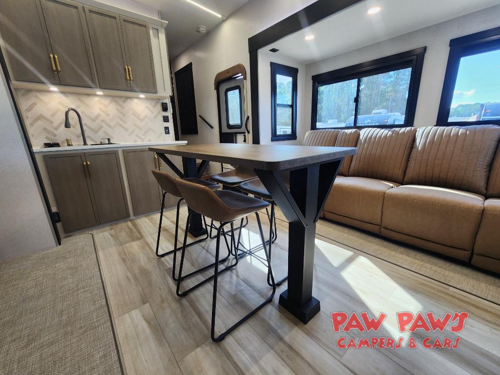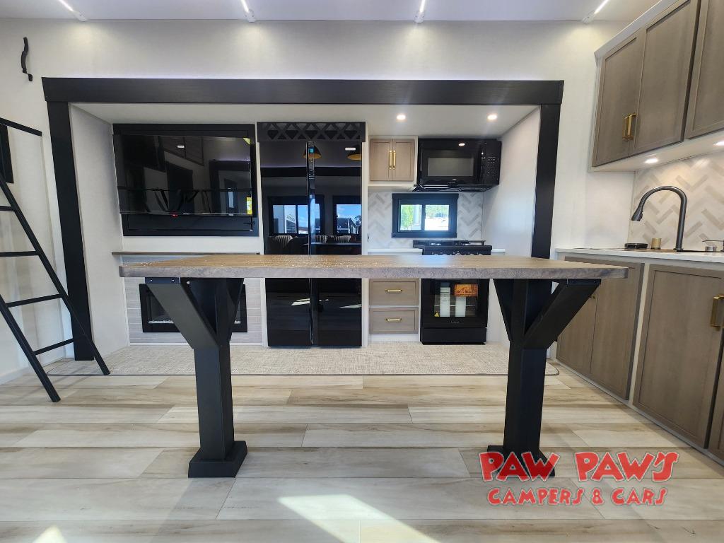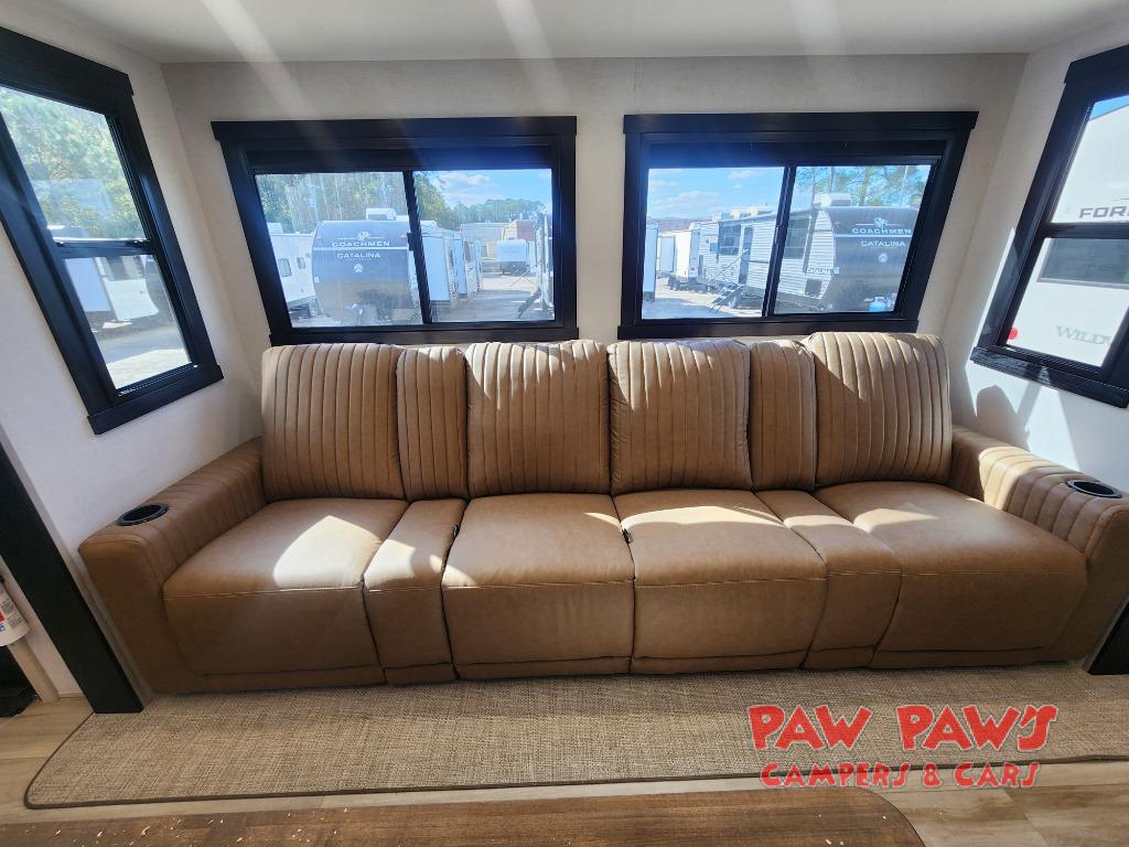 The whole family will love camping in this spacious fifth wheel! There are four slide outs, two bedrooms, plus two full baths, one of which is located in the rear master bedroom. A custom queen bed and dual wardrobes are also found in the master, while a custom king bed is found in the front private bedroom. And the loft with bunk mats can be used for additional sleeping or storage space! The chef of your group will find a full kitchen to cook meals, including ample counter space and a 16-cu. ft. 12V refrigerator and hidden storage behind the 50" TV for snacks or movies. The theater seating with cup holders provides a comfy place to relax each day, and the kitchen island with chairs will be perfect for dining space!