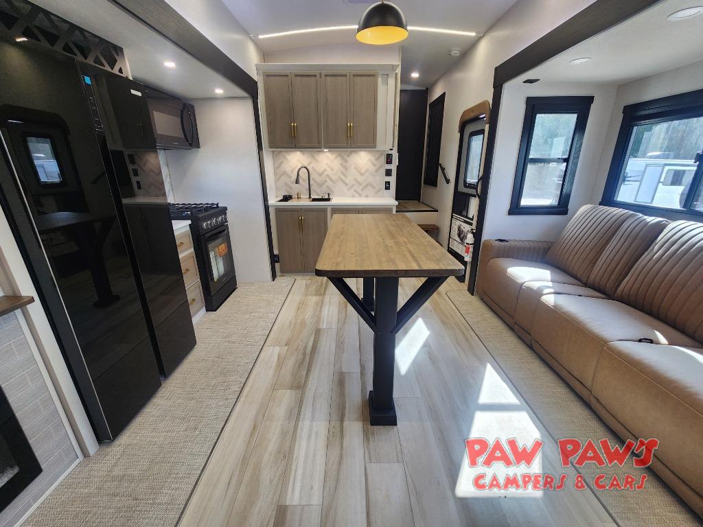 With any Wildwood Heritage Glen fifth wheel by Forest River, the quality construction, attention to detail and design along with a bright and welcoming interior allows you to relax in comfort. You'll love the high-end solid surface countertops included in the Elevated Value Package, along with a JBL sound system, full-length barreled ceilings, and an ultimate interior lighting upgrade. The included Expedition Package features an Accesibelly underbelly panel with 12V tank heaters, nitrogen-filled tires with aluminum rims, and a spacious 30" wide main entry door with a window. The Lippert On-The-Go ladder prep and back-up camera prep let you customize your fifth wheel even more, and the LED awning, front cap, marker and taillights will make it easier than ever to set up camp!