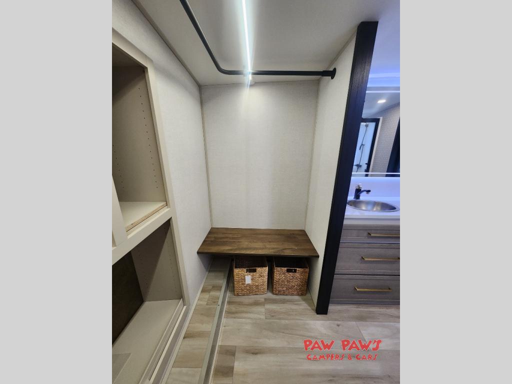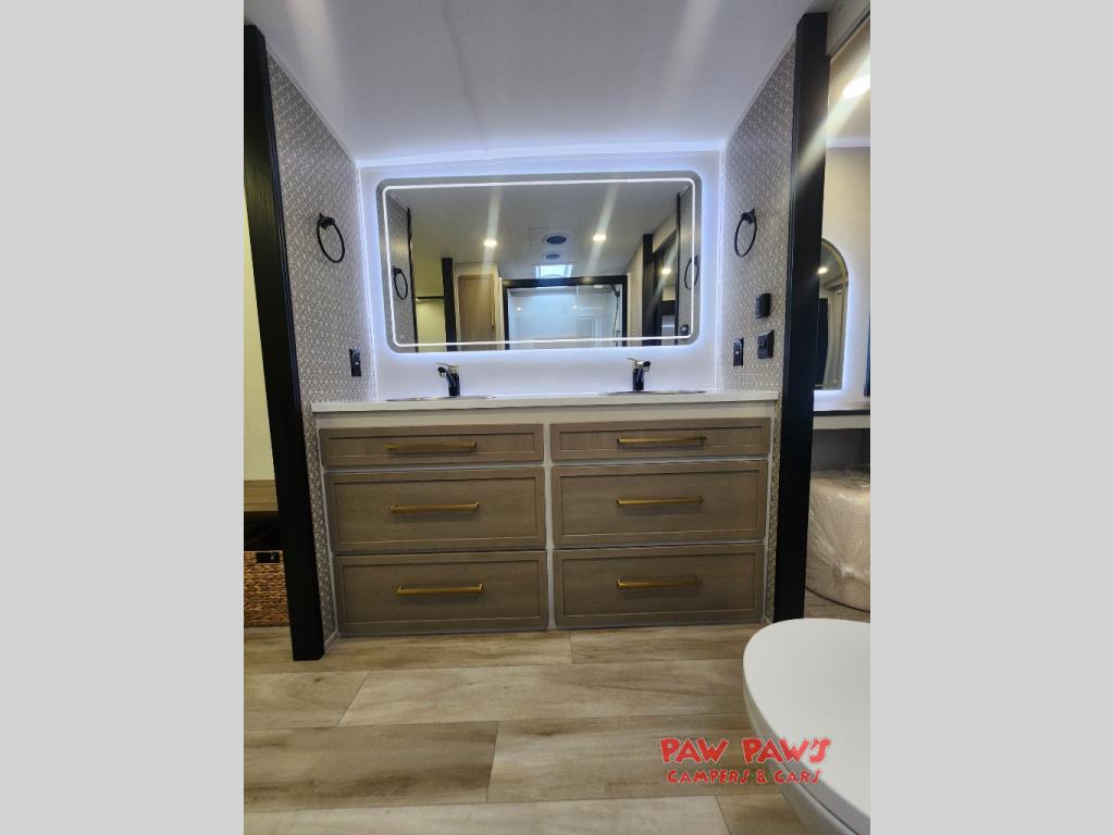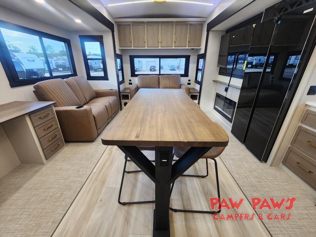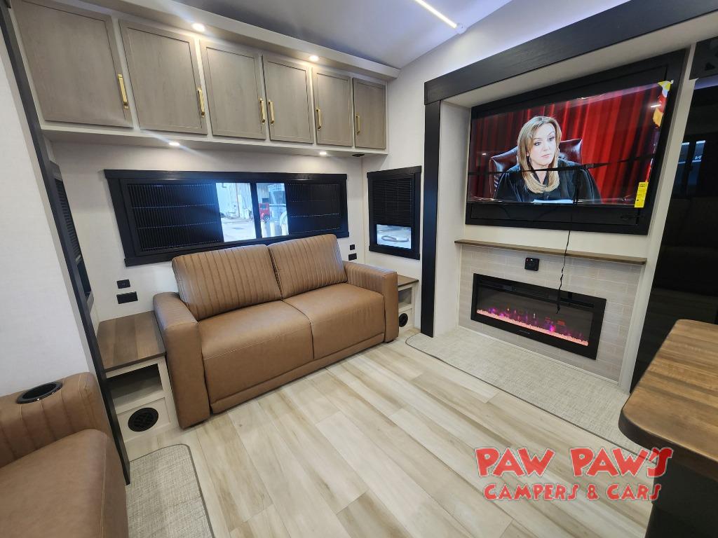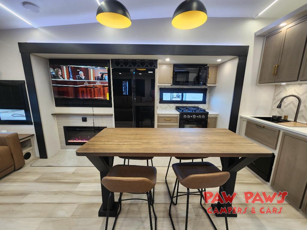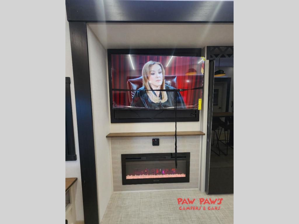 One look at this fifth wheel and you'll be sold! You can wake up each morning in the master bedroom that includes a custom king bed and a dresser with an ottoman. The front full bath has two bath sinks so you both can get ready at once, and you're going to love the walk-in wardrobe with a wrap-around hanging rod. A half bath includes a floating shelf with a hanging rod plus washer/dryer prep, giving you the option to make this a laundry room! The back of this unit is where you can cook meals with full kitchen amenities, dine at the kitchen island with four chairs, and relax on the theater seating and tri-fold sofa. A 50" TV and fireplace is also found here, complete with hidden storage behind for board games, movies, and snacks!