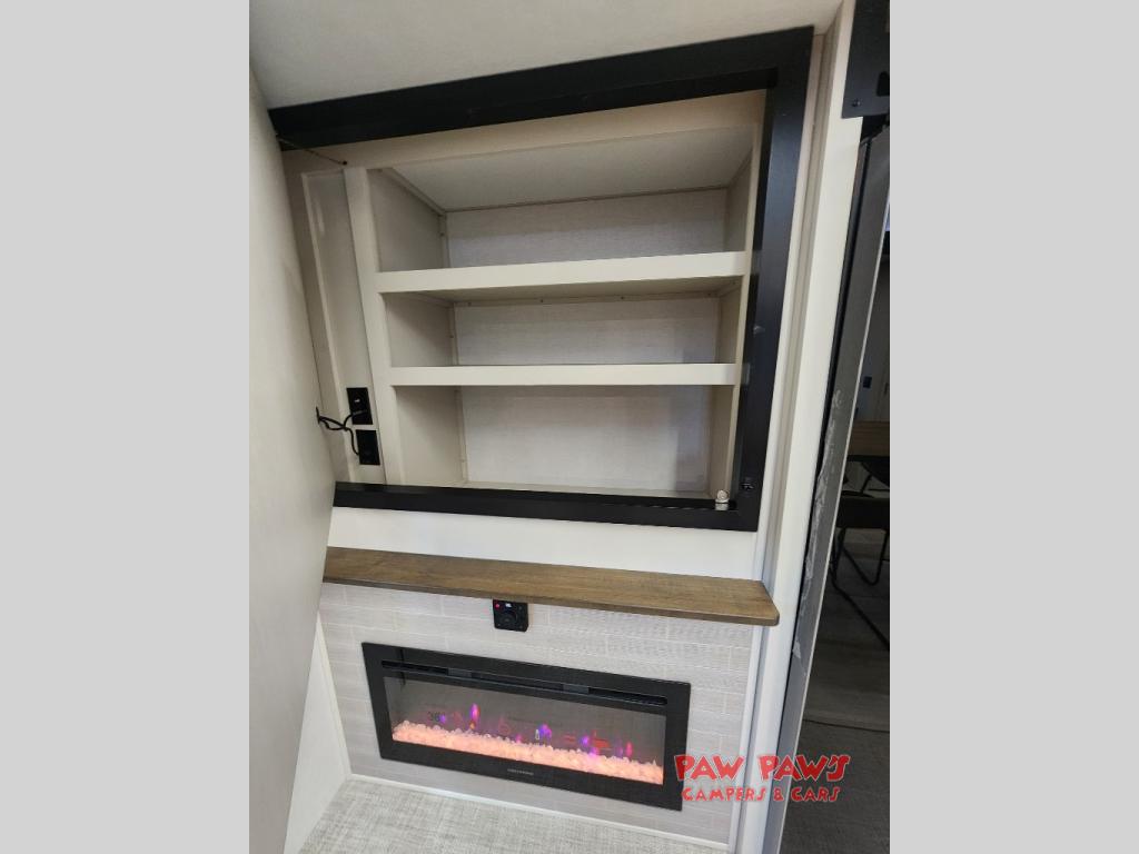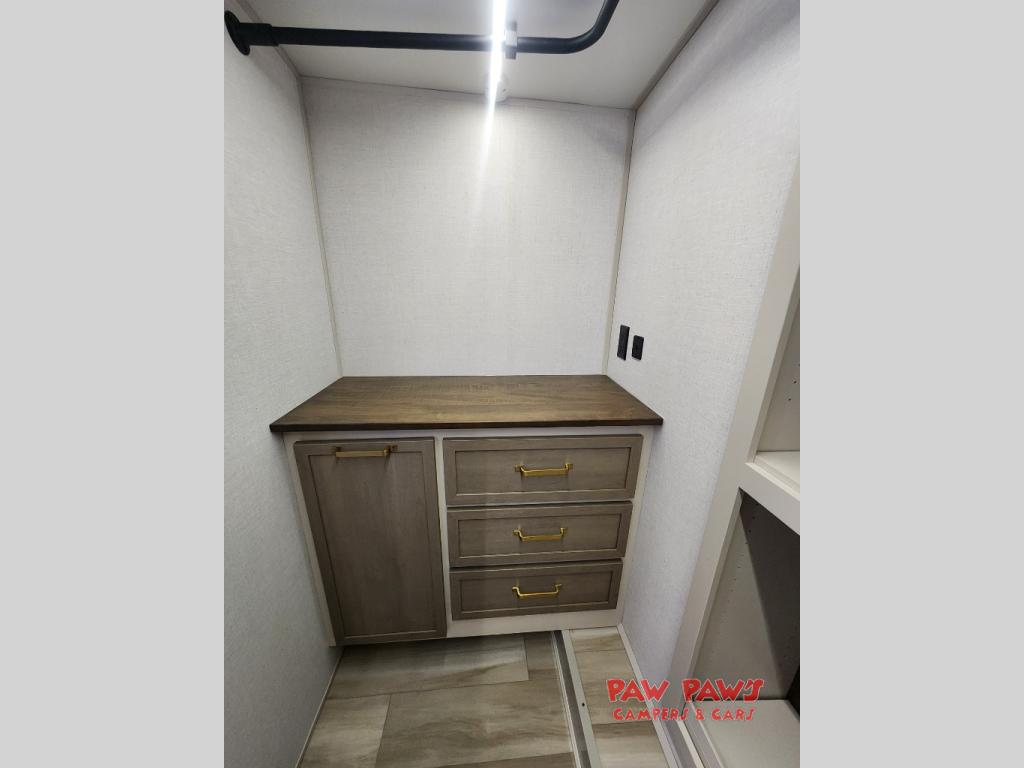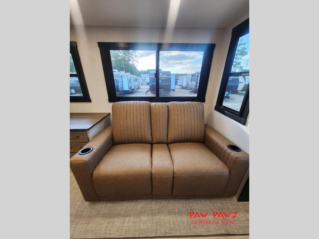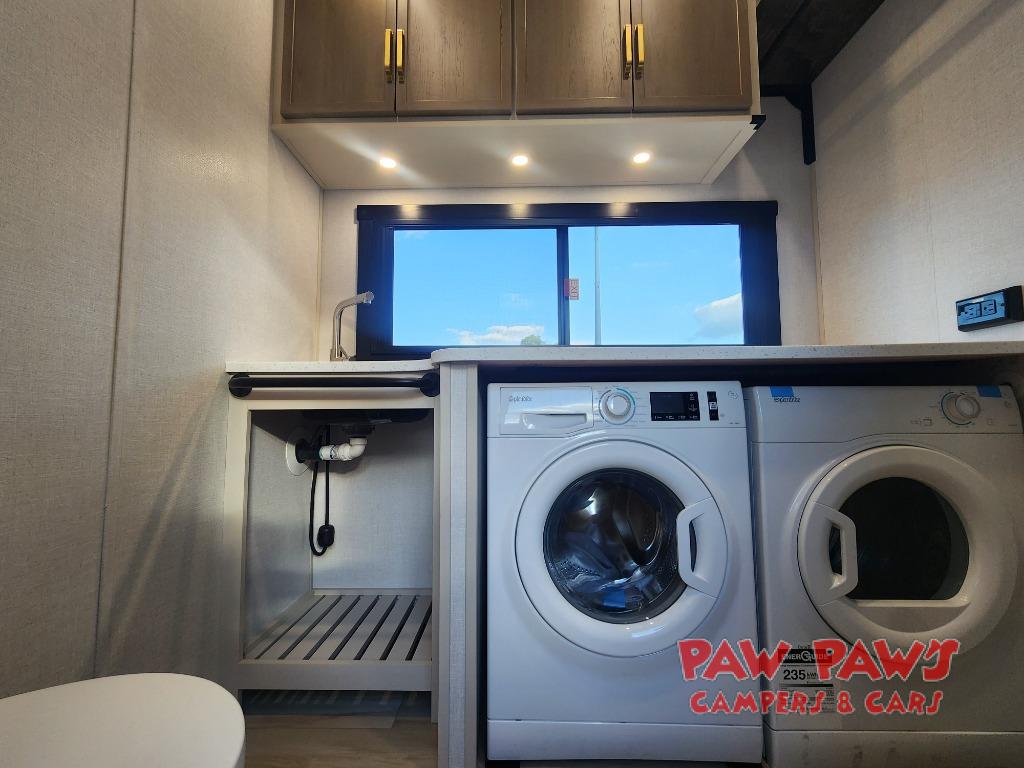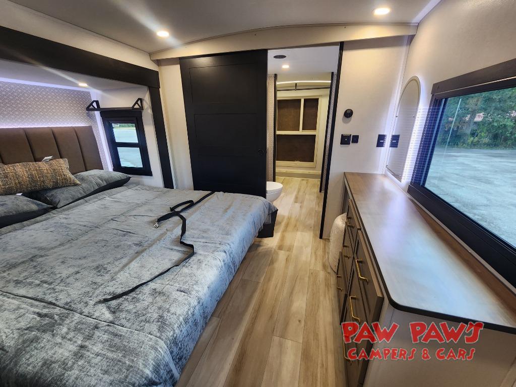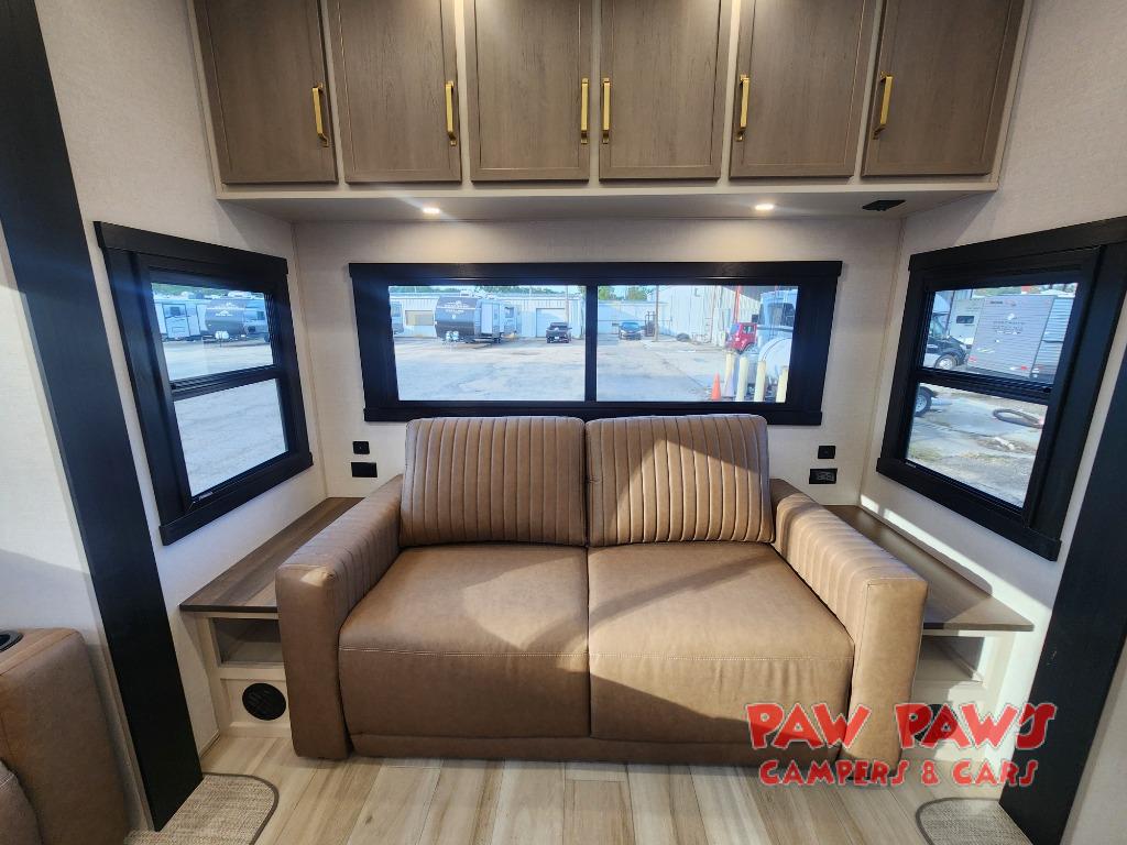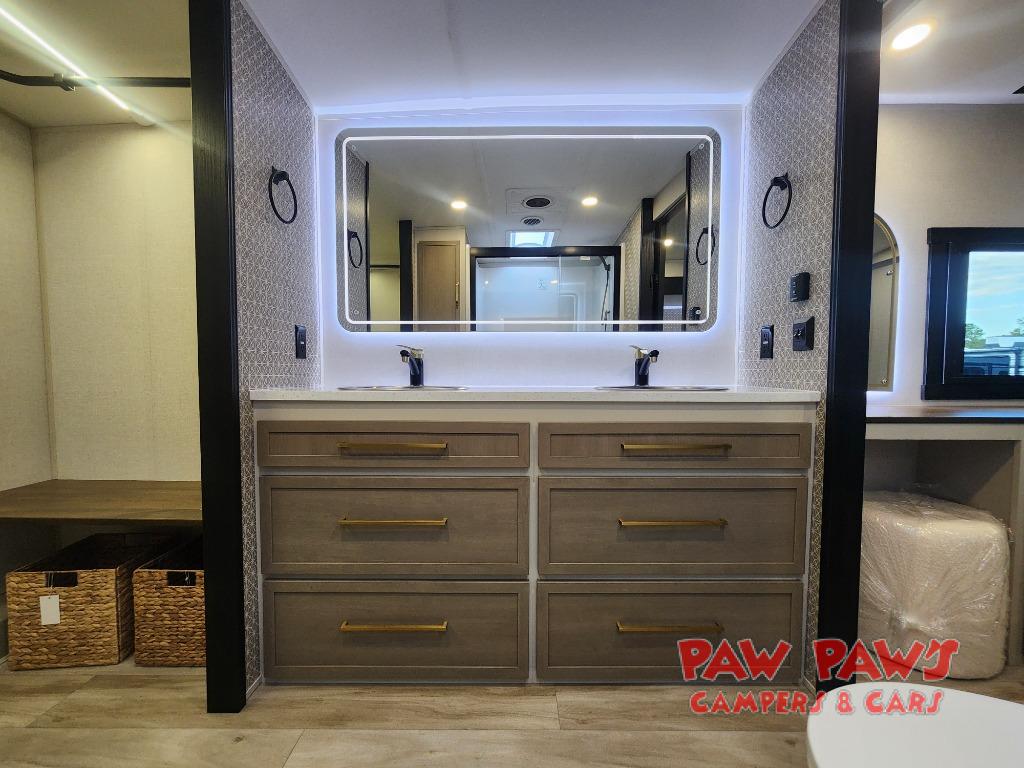 One look at this fifth wheel and you'll be sold! You can wake up each morning in the master bedroom that includes a custom king bed and a dresser with an ottoman. The front full bath has two bath sinks so you both can get ready at once, and you're going to love the walk-in wardrobe with a wrap-around hanging rod. A half bath includes a floating shelf with a hanging rod plus washer/dryer prep, giving you the option to make this a laundry room! The back of this unit is where you can cook meals with full kitchen amenities, dine at the kitchen island with four chairs, and relax on the theater seating and tri-fold sofa. A 50" TV and fireplace is also found here, complete with hidden storage behind for board games, movies, and snacks!