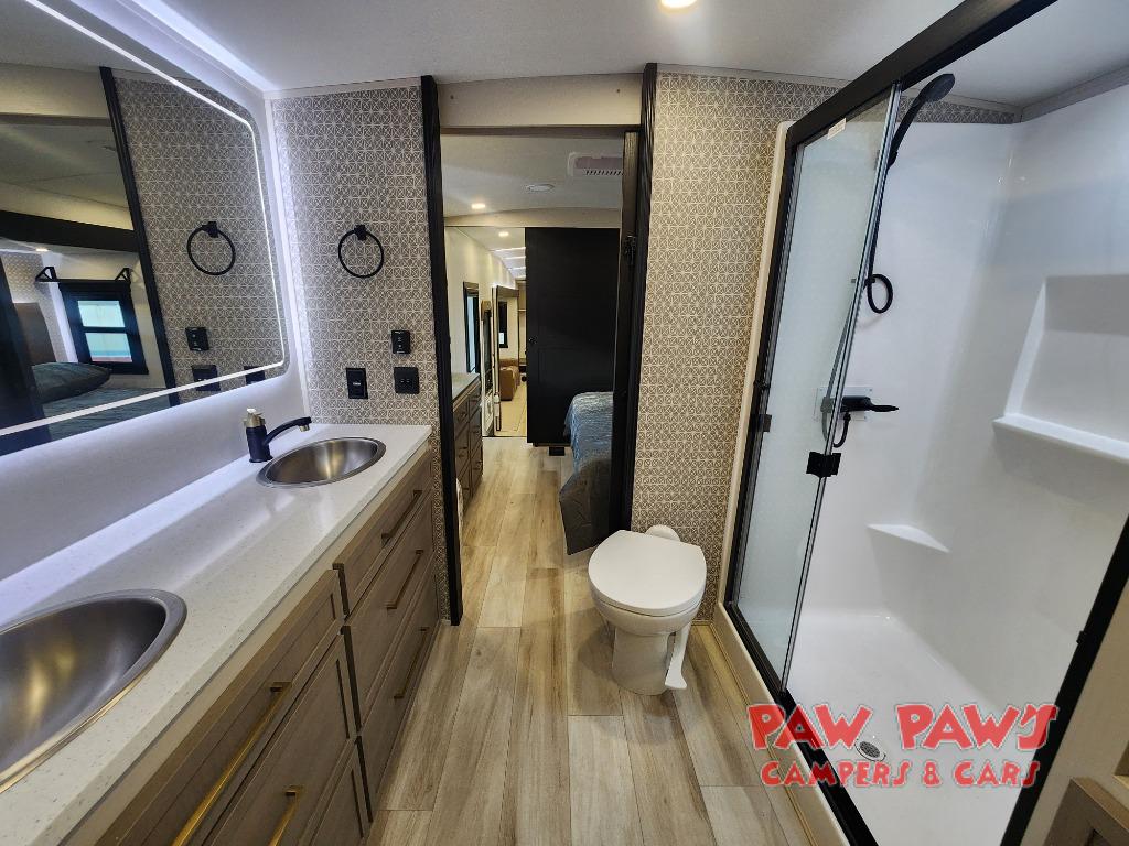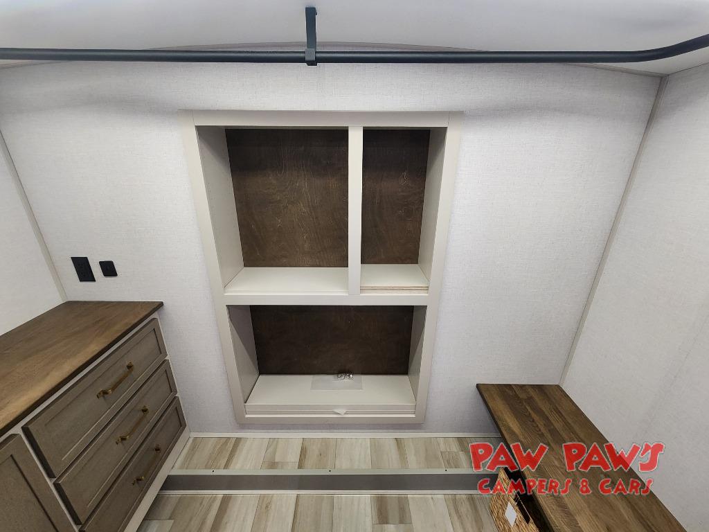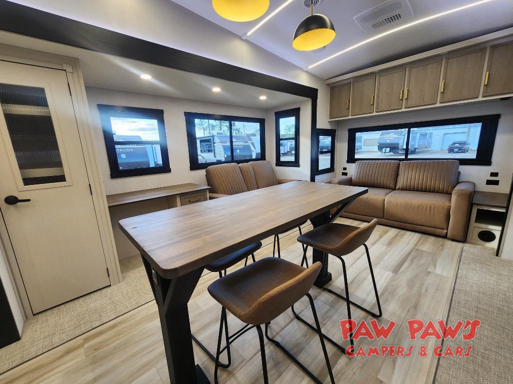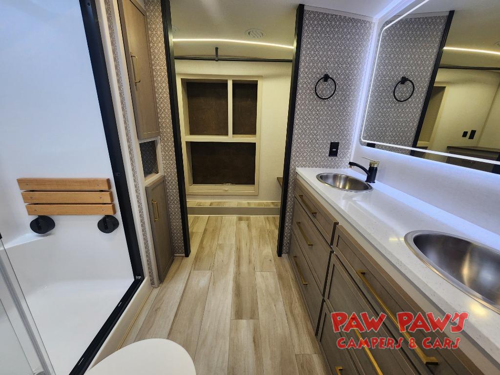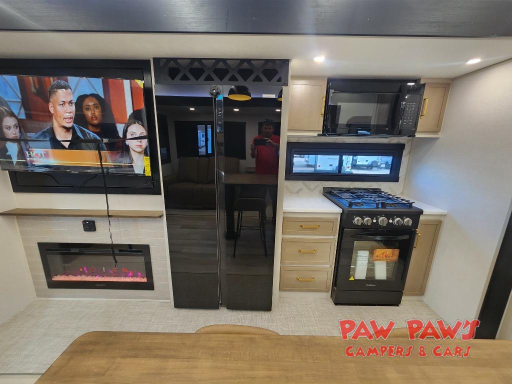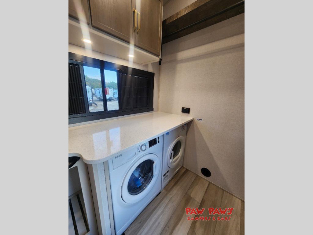 One look at this fifth wheel and you'll be sold! You can wake up each morning in the master bedroom that includes a custom king bed and a dresser with an ottoman. The front full bath has two bath sinks so you both can get ready at once, and you're going to love the walk-in wardrobe with a wrap-around hanging rod. A half bath includes a floating shelf with a hanging rod plus washer/dryer prep, giving you the option to make this a laundry room! The back of this unit is where you can cook meals with full kitchen amenities, dine at the kitchen island with four chairs, and relax on the theater seating and tri-fold sofa. A 50" TV and fireplace is also found here, complete with hidden storage behind for board games, movies, and snacks!