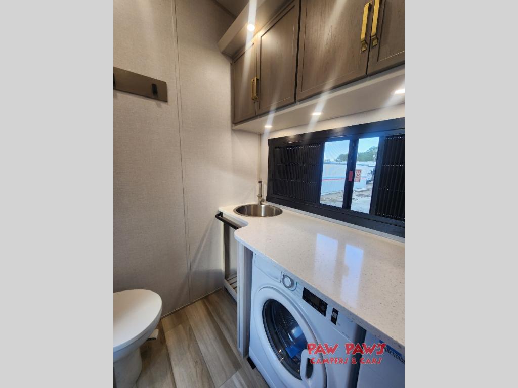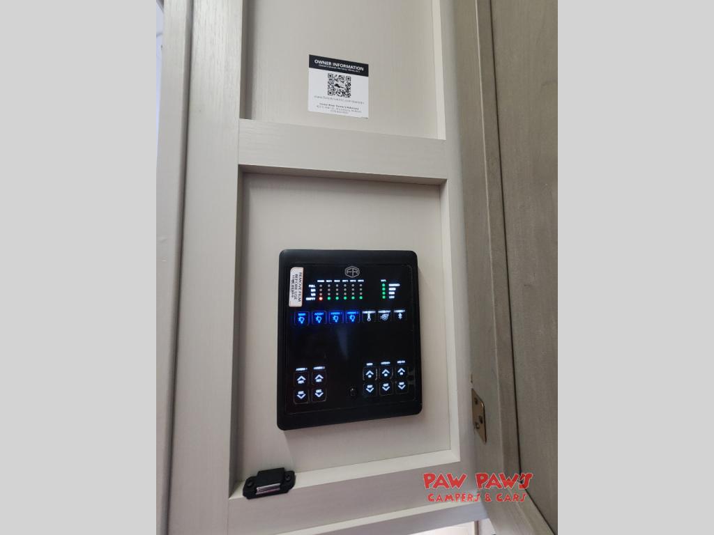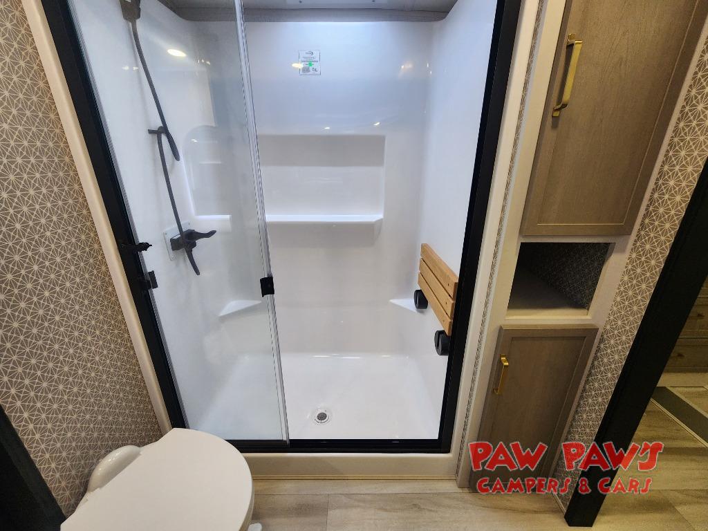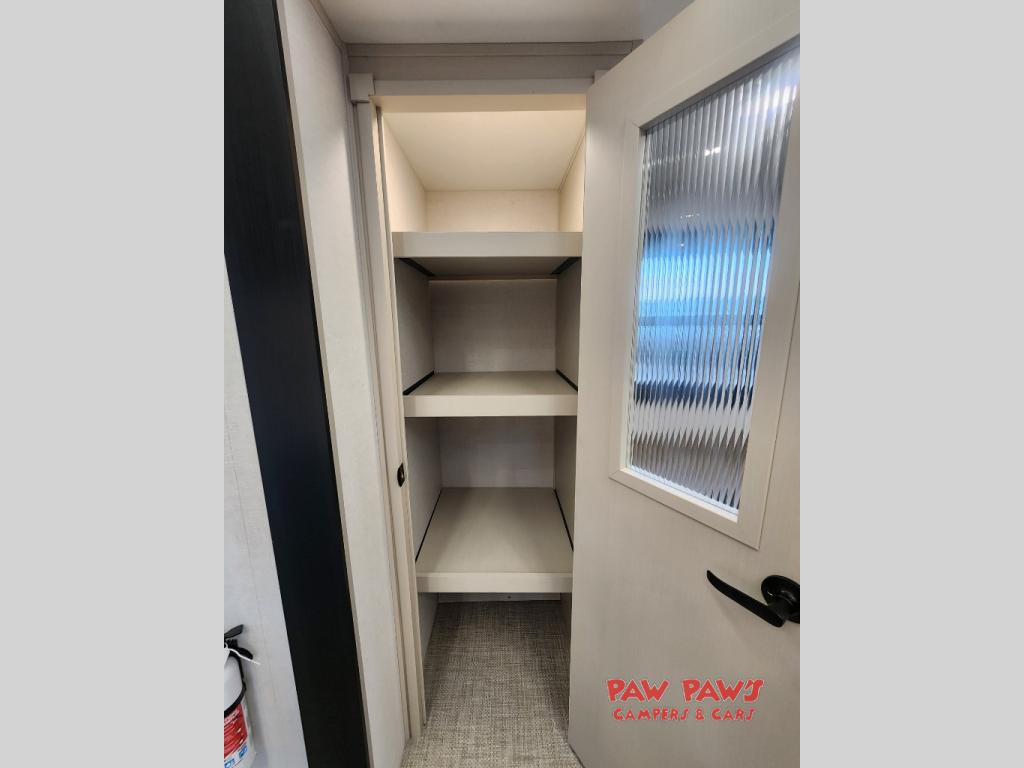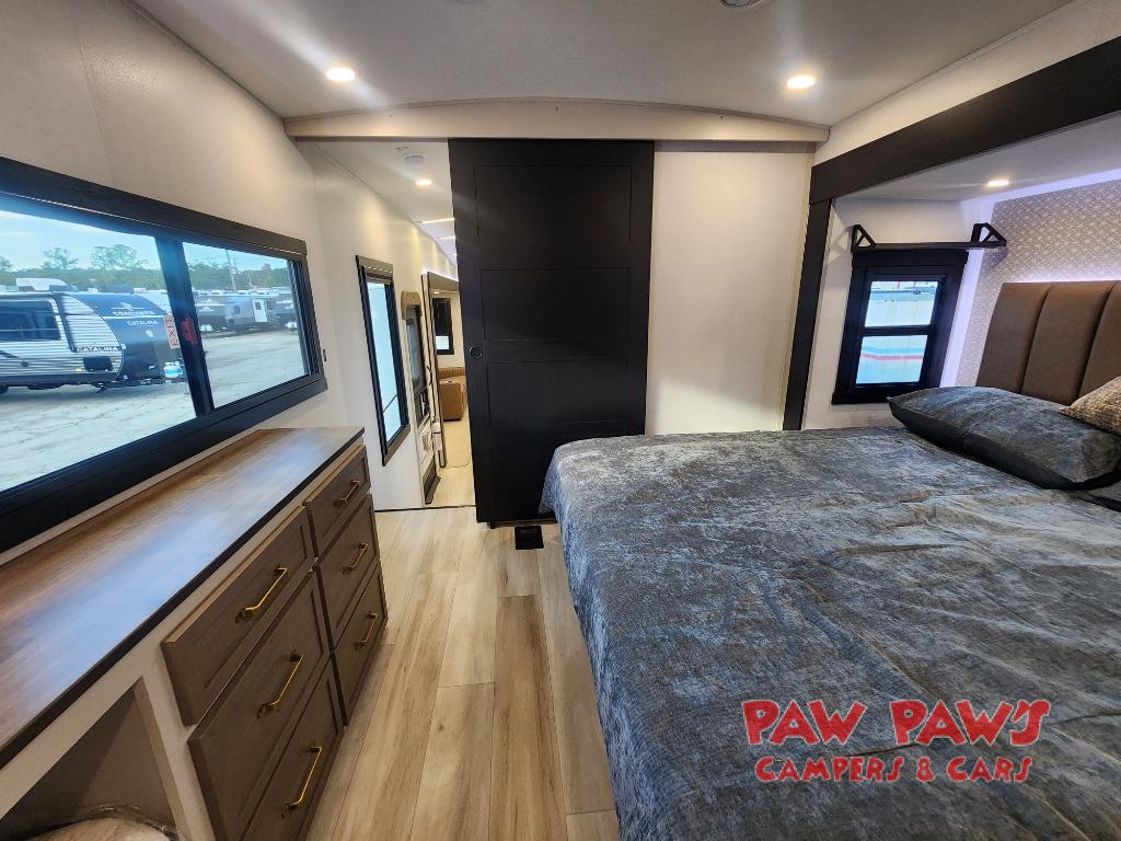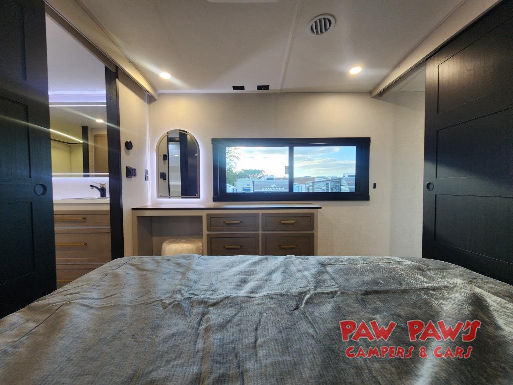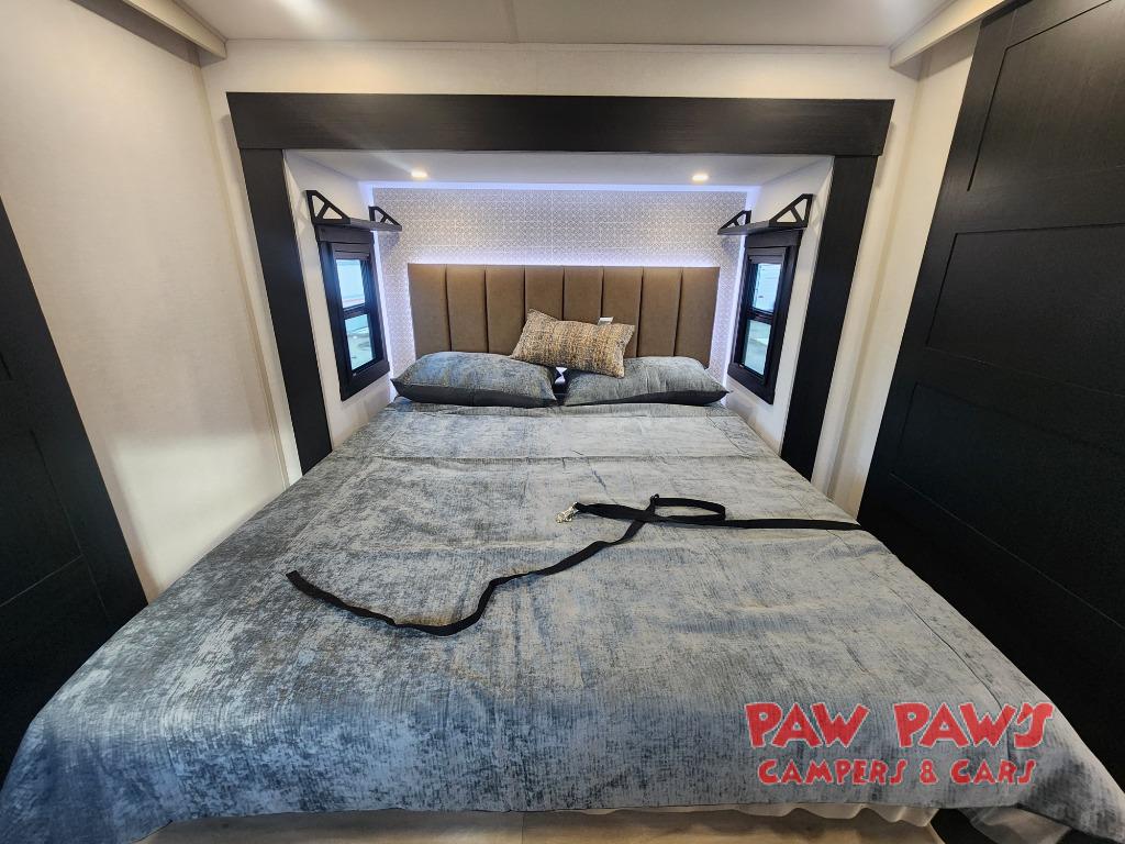 One look at this fifth wheel and you'll be sold! You can wake up each morning in the master bedroom that includes a custom king bed and a dresser with an ottoman. The front full bath has two bath sinks so you both can get ready at once, and you're going to love the walk-in wardrobe with a wrap-around hanging rod. A half bath includes a floating shelf with a hanging rod plus washer/dryer prep, giving you the option to make this a laundry room! The back of this unit is where you can cook meals with full kitchen amenities, dine at the kitchen island with four chairs, and relax on the theater seating and tri-fold sofa. A 50" TV and fireplace is also found here, complete with hidden storage behind for board games, movies, and snacks!