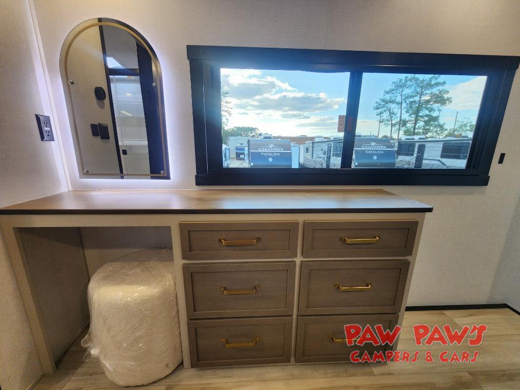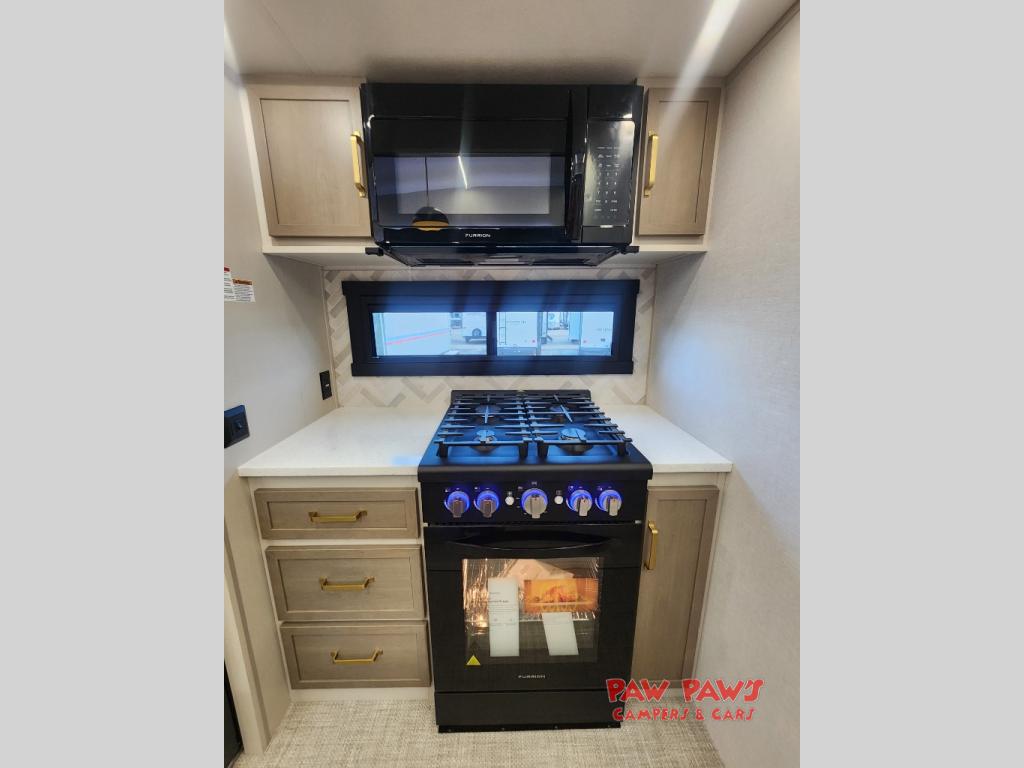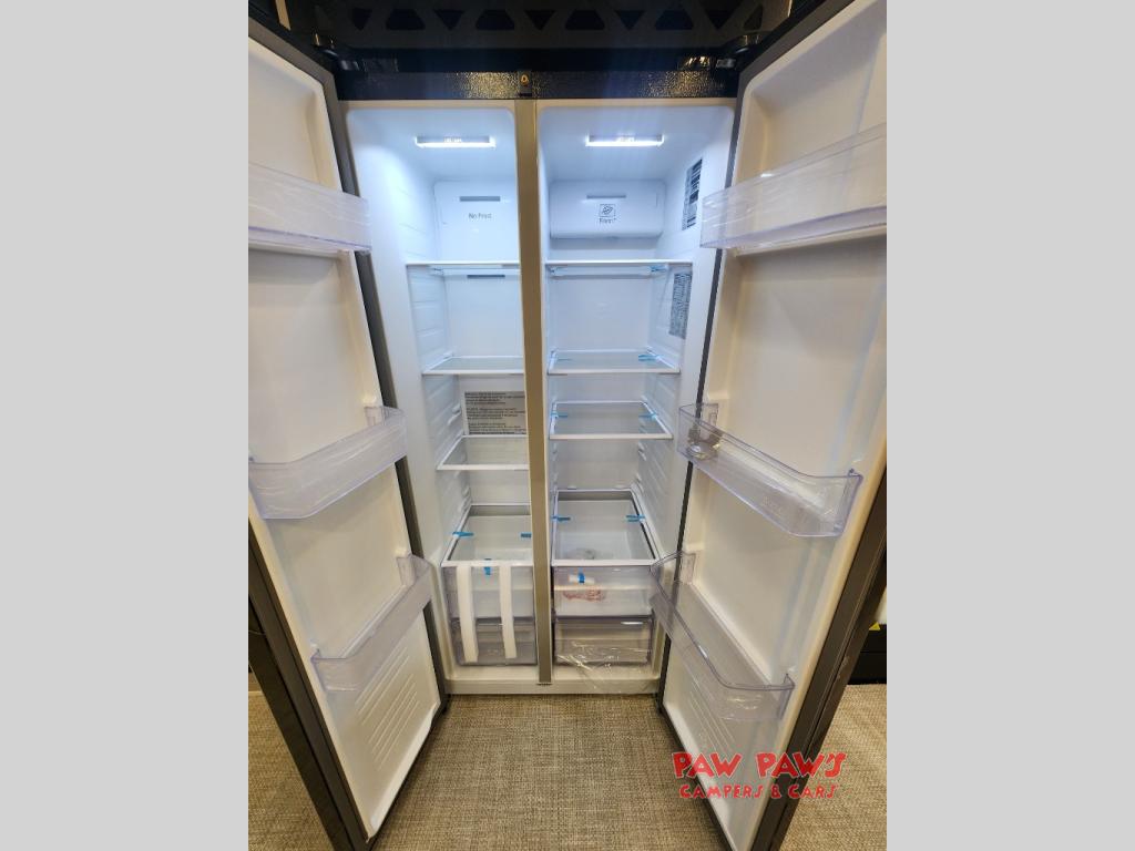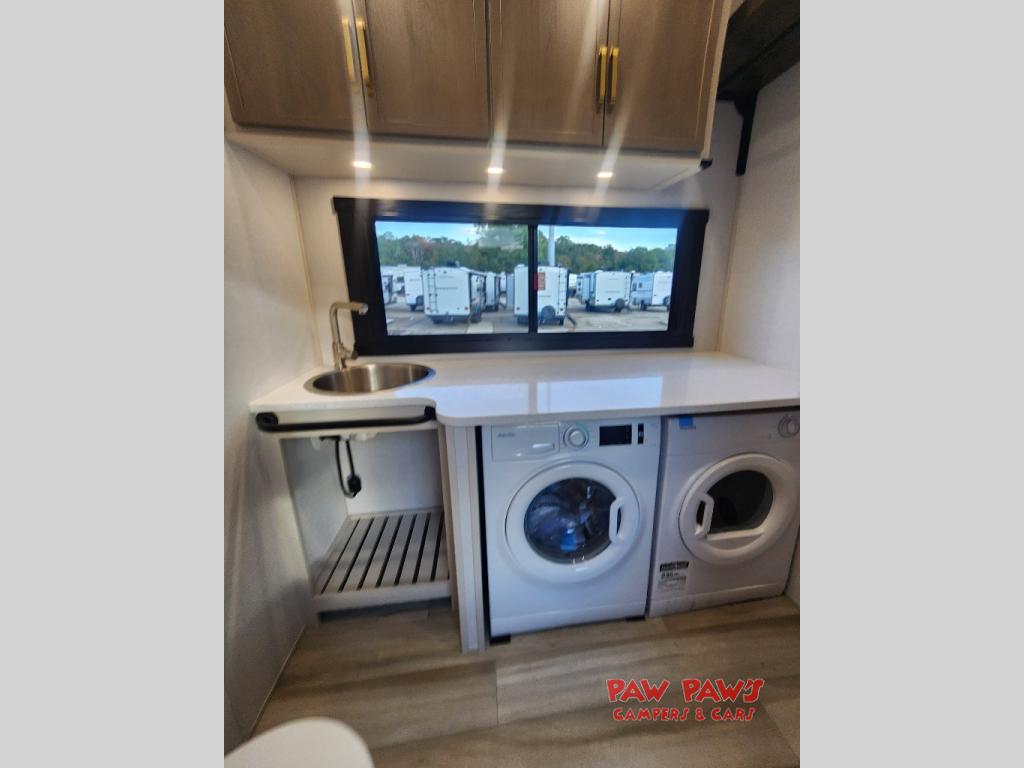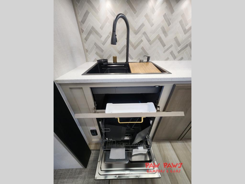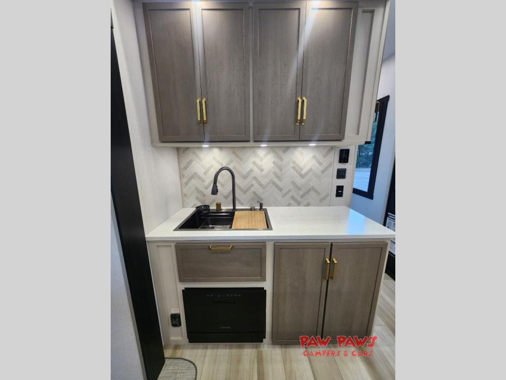 One look at this fifth wheel and you'll be sold! You can wake up each morning in the master bedroom that includes a custom king bed and a dresser with an ottoman. The front full bath has two bath sinks so you both can get ready at once, and you're going to love the walk-in wardrobe with a wrap-around hanging rod. A half bath includes a floating shelf with a hanging rod plus washer/dryer prep, giving you the option to make this a laundry room! The back of this unit is where you can cook meals with full kitchen amenities, dine at the kitchen island with four chairs, and relax on the theater seating and tri-fold sofa. A 50" TV and fireplace is also found here, complete with hidden storage behind for board games, movies, and snacks!