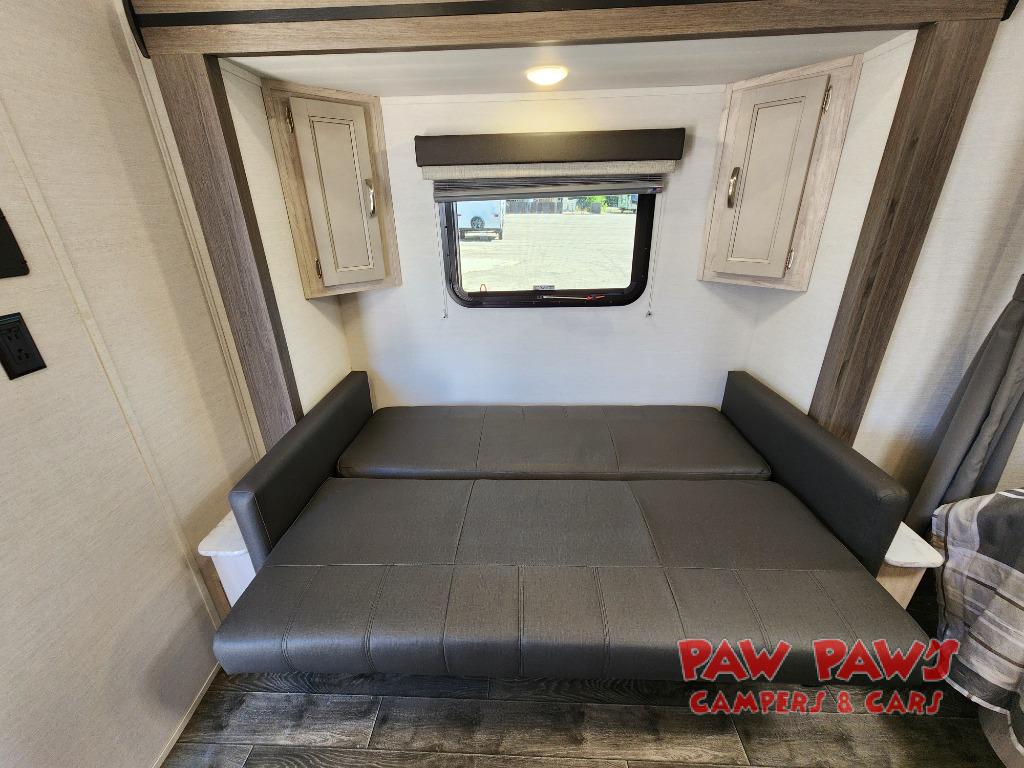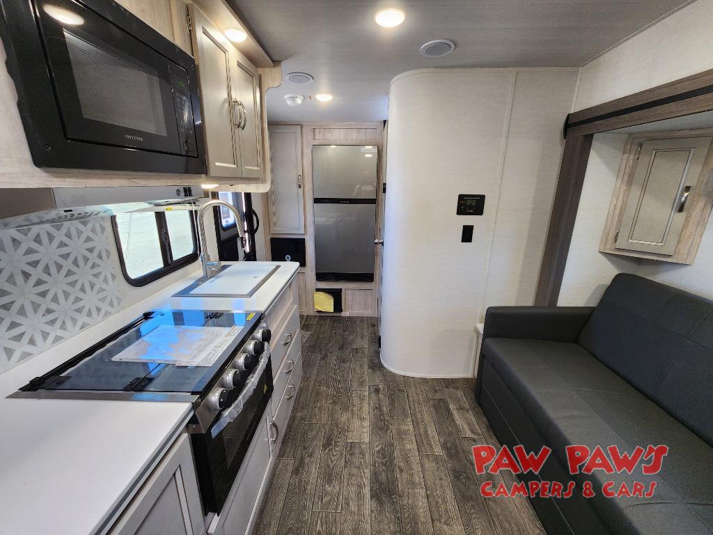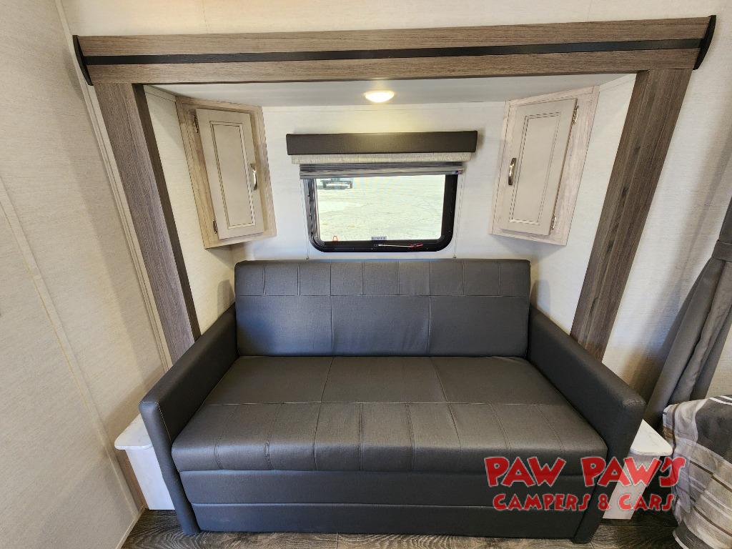 You will have everything in this travel trailer for a comfortable weekend getaway! You will start each morning feeling refreshed after sleeping on the front queen bed with shirt closets on either side and a TV mount location diagonal from it. After you take a nice, hot shower in the rear corner bathroom, head to the 8 cu. ft. 12V refrigerator and grab some bacon to fry up on the three burner cooktop. The sofa bed slide has a 60" folding table for you to enjoy your meals, and can transform into an extra sleeping space for a guest or two little ones. Don't leave any of your favorite snacks behind either when you can store them inside the pantry/closet near the entrance!