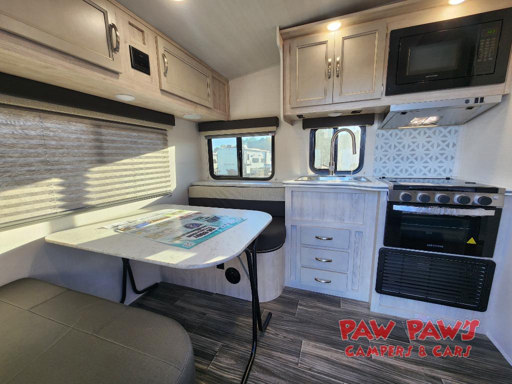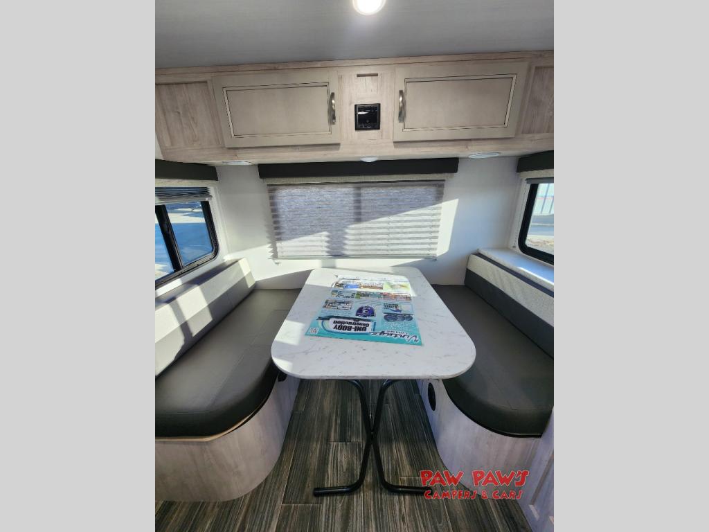 If you enjoy a more classic look for an RV, you'll love this Vintage Cruiser 19ERD. The rear booth dinette is surrounded by windows for bright, open views, and you'll find overhead storage here for dry goods or snacks. The chef of your group will have a cooktop and a microwave oven to prepare meals. The private toilet and sink is right across the hall from the 24" x 36" shower so two people can freshen up at once. How convenient! This model also features a semi-private front bedroom with a privacy curtain for your own space, plus an RV queen bed and dual shirt closets to keep your clothes tidy!